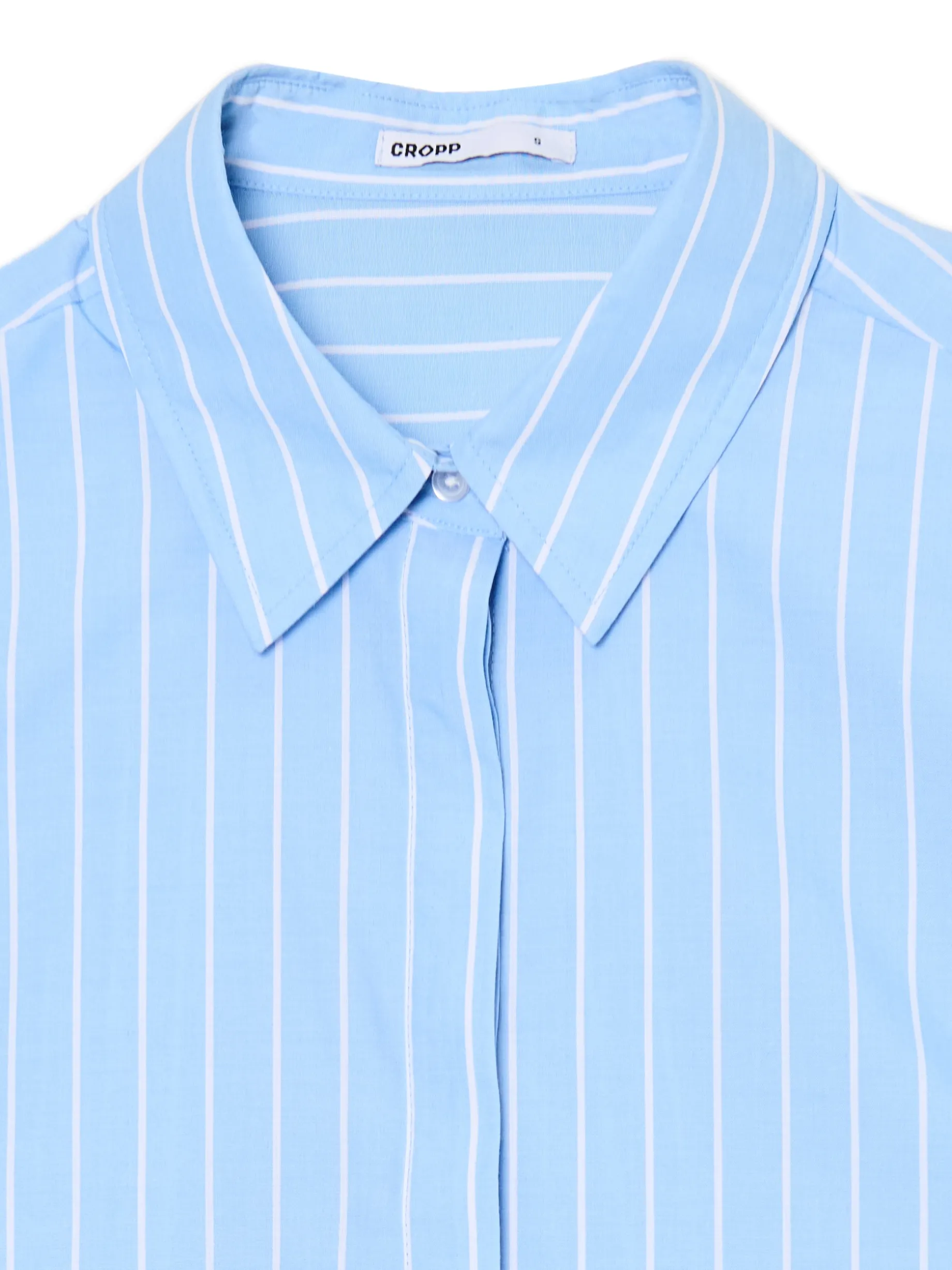 Damska koszula o krótszym kroju, uszyta z mieszanki dzianin z bawełną. Wzór w szerokie paski i oryginalny fason sprawiają, że ten item idealnie pasuje do casualowych stylizacji. dzianinowy materiał z bawełną krótszy krój jednorzędowe zapięcie na guziki klasyczny kołnierzyk długie rękawy zakończone mankietem z guzikami wzór w paski all over