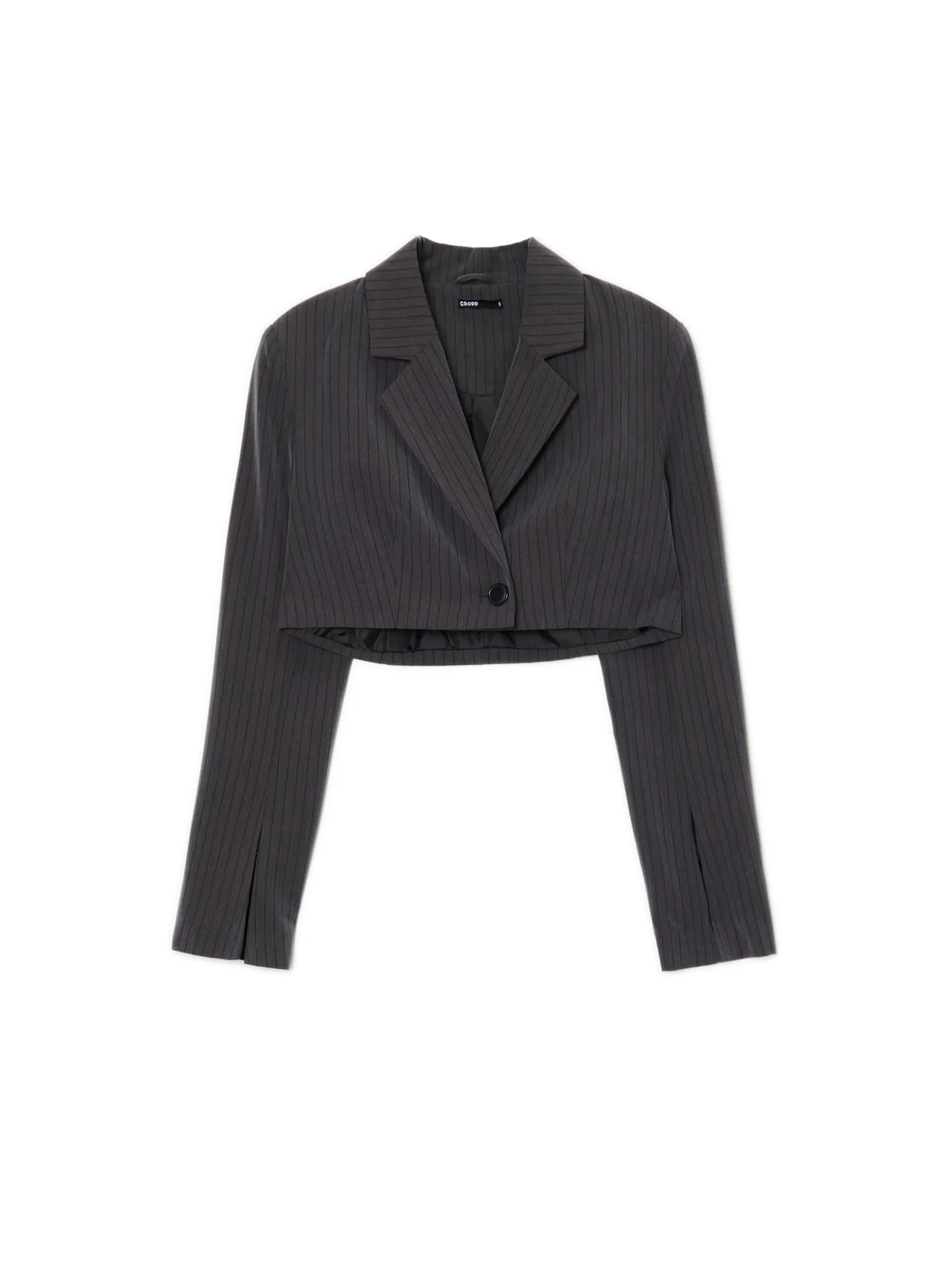 Damski żakiet o krótszym kroju, uszyty z lekkiej, trwałej tkaniny. Idealny jako dodatek do eleganckich i casualowych stylizacji. lekki materiał zapięcie na guziki kołnierz z otwartymi klapami długie rękawy z rozcięciami wzór w paski na całości