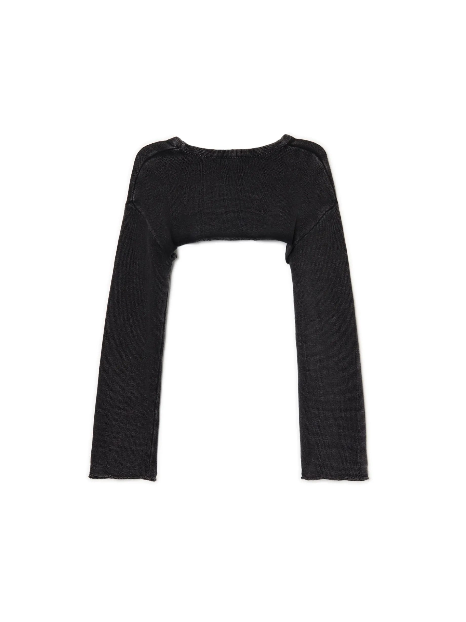 Damski sweter o krótkim kroju, uszyty z bawełnianej dzianiny. Na przodzie ozdobne wycięcie i duże, dekoracyjne agrafki. 100% bawełny krótki krój długie, swobodne rękawy półokrągły dekolt dekoracyjne wykończenie brzegów metalowe detale Wzrost modelki: 177 cm