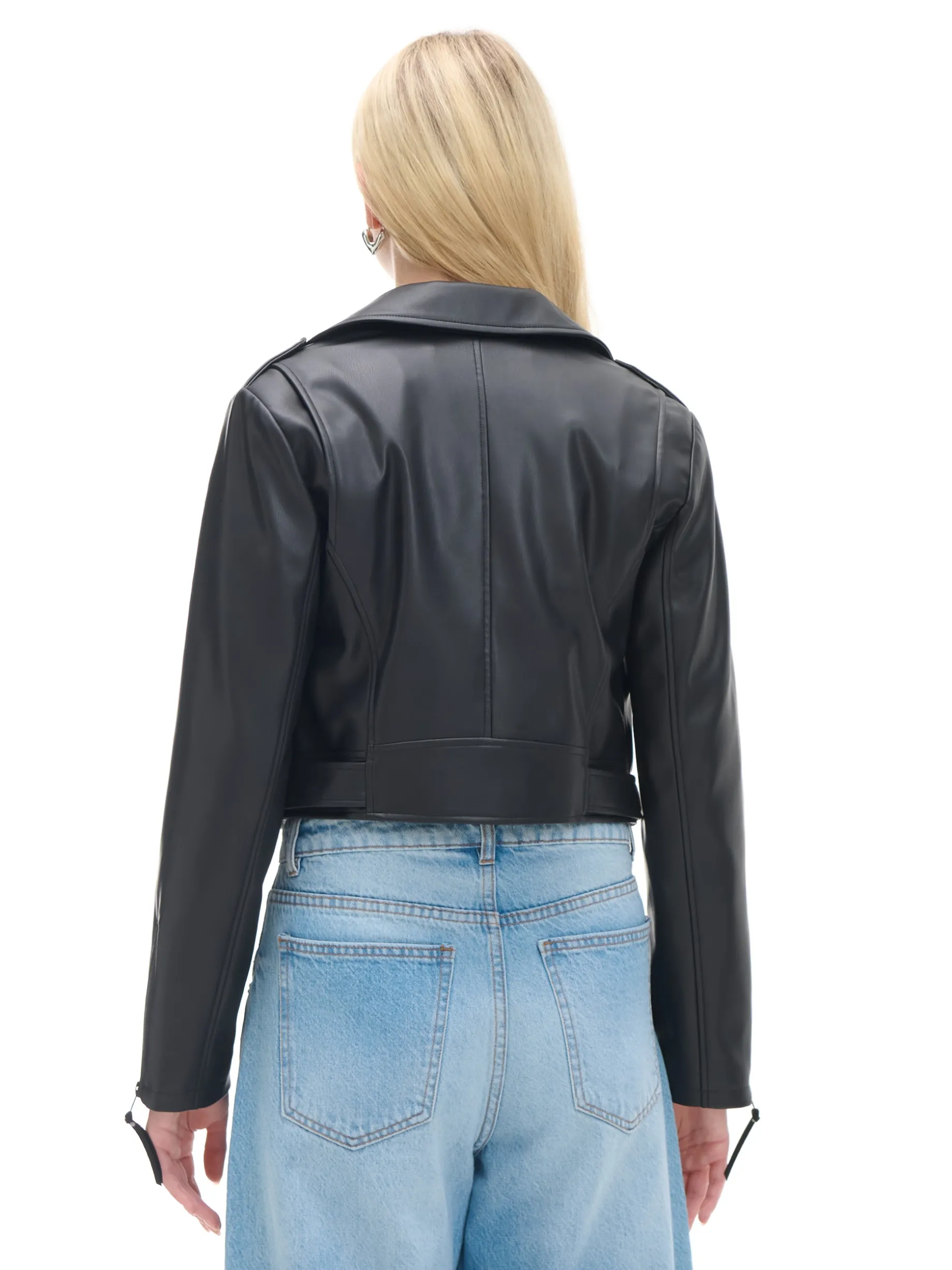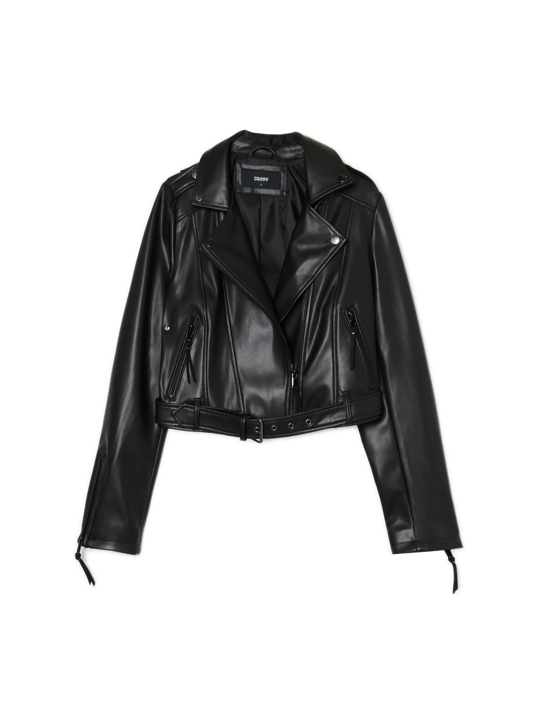 Damska kurtka typu biker, wykonana ze sztucznej skóry. Ten czarny model będzie idealnym dodatkiem do Twoich stylizacji. zapinana na zamek na całej długości dół wykończony paskiem z metalową sprzączką długie rękawy z suwakiem przy mankiecie kołnierz z otwartymi klapami góra zapinana na zatrzaski dwie kieszenie z zamkami po bokach ozdobne pullery przy rękawach