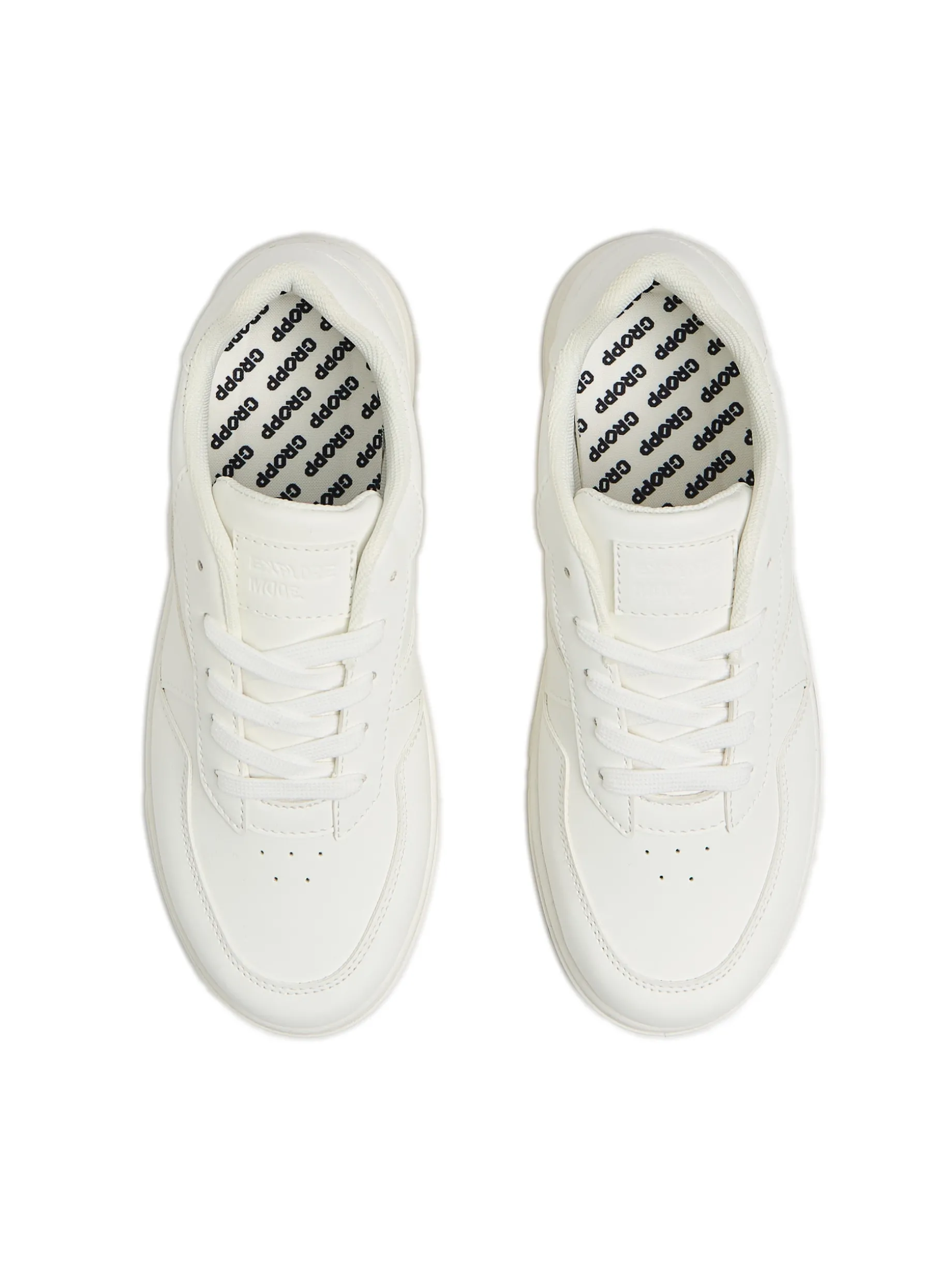 Damskie buty przejściowe typu sneakersy, uszyte z mieszanych materiałów. Solidna podeszwa i jednolity kolor zwrócą na siebie uwagę w tłumie! wysokie sneakersy z elastyczną cholewką wykonane z łączonych materiałów masywna podeszwa białe, płaskie sznurowadła