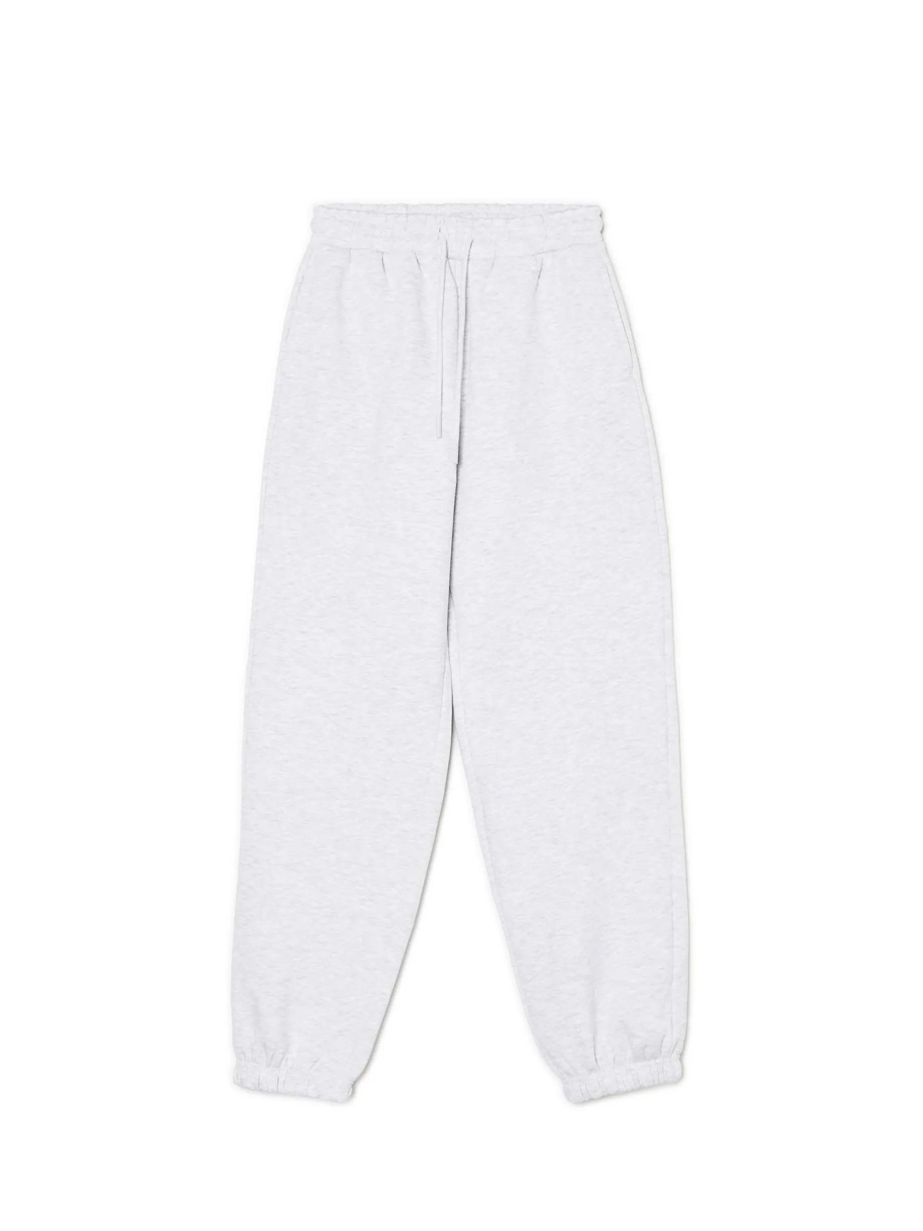 Jasnoszare melanżowe spodnie damskie typu jogger, uszyte z mieszanki dzianin z bawełną. Komfort zapewniają luźna nogawka ze ściągaczem oraz regulacja w pasie. Dostępne inne kolory. wygodne spodnie z regulacją w pasie dzianinowy materiał z bawełną elastyczna gumka w pasie długie, swobodne nogawki wykończone ściągaczem dwie kieszenie po bokach