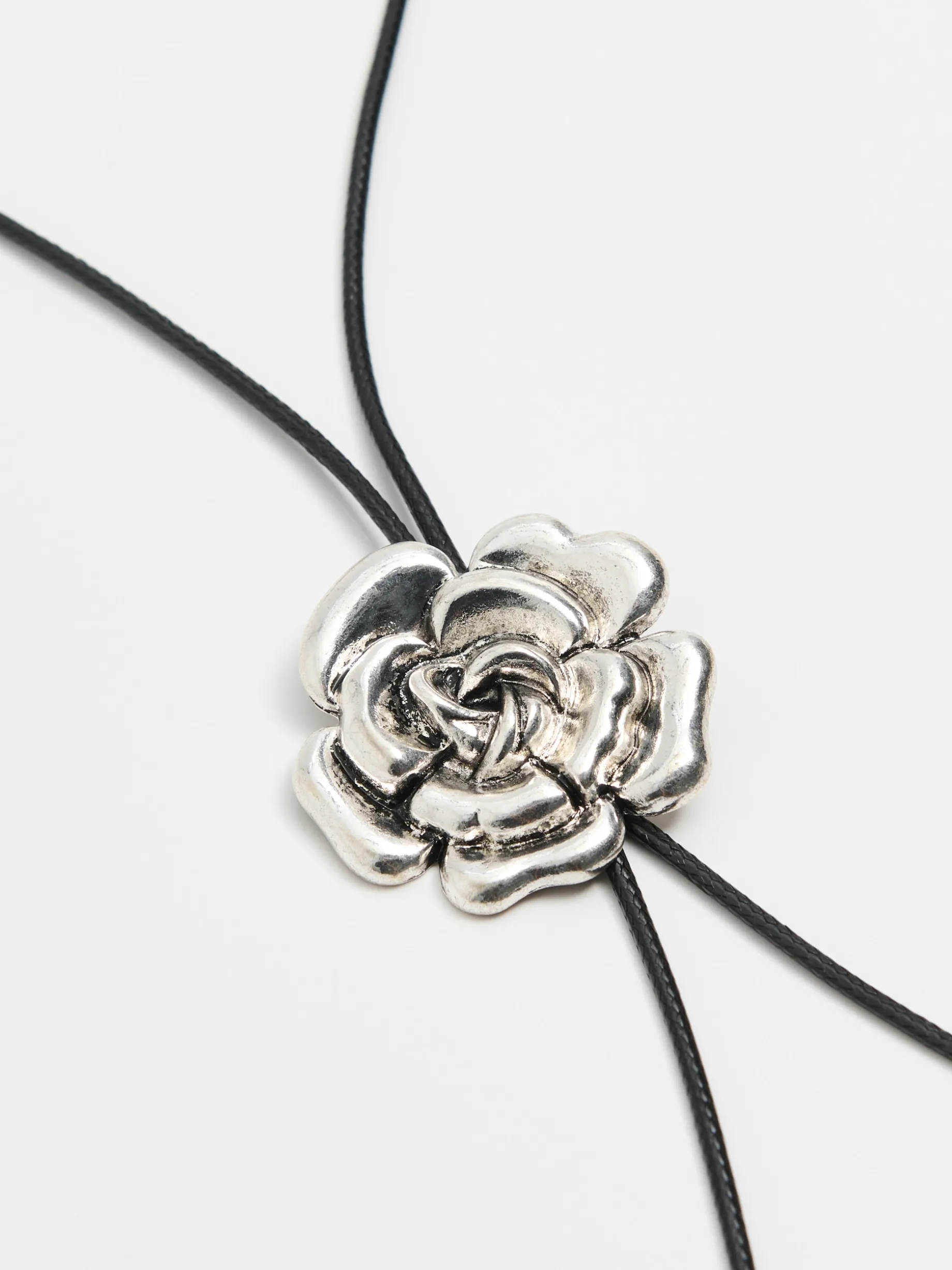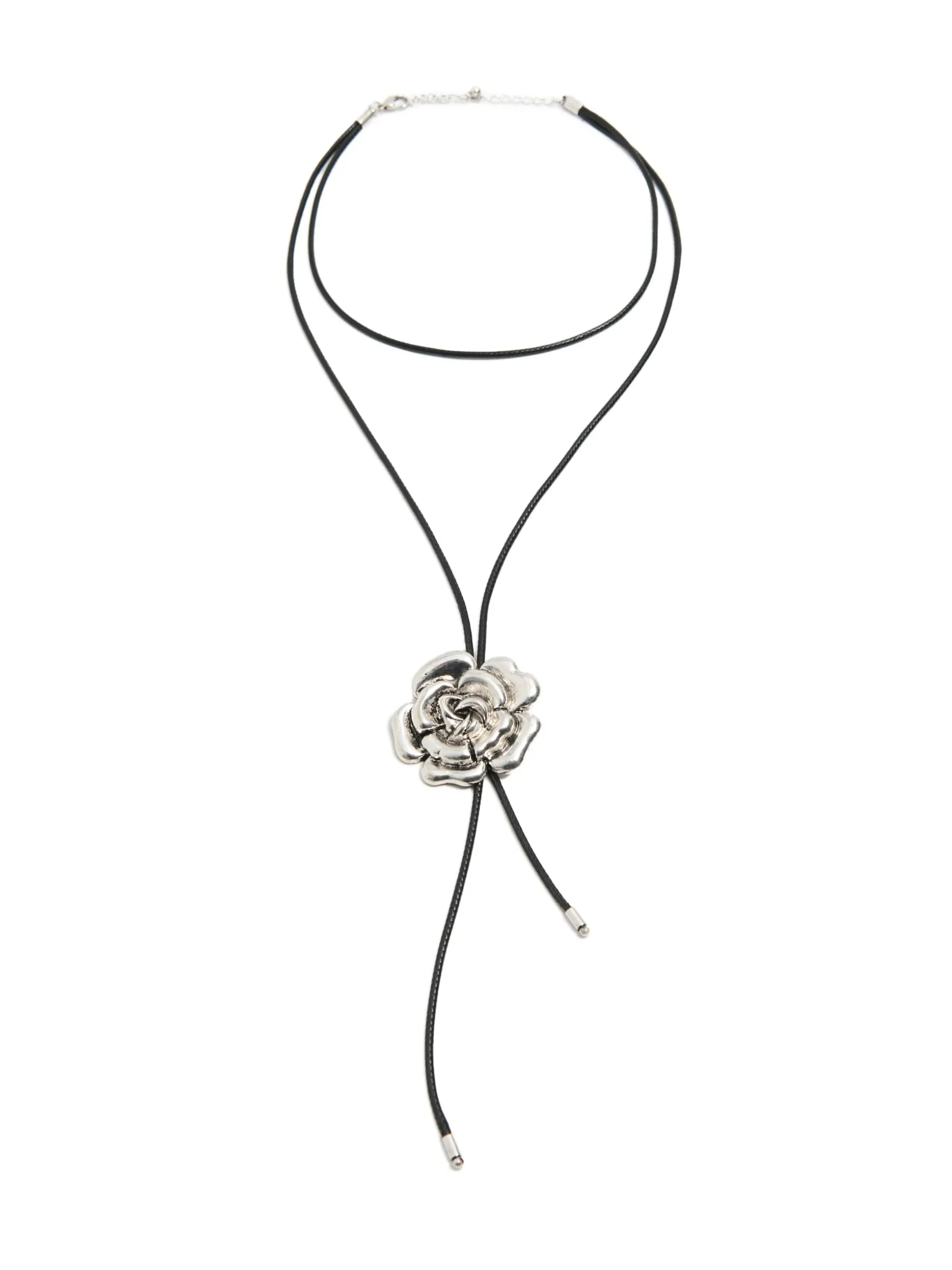 Damski naszyjnik z podwójną pętlą, zapinany na karabińczyk z możliwością regulacji obwodu. Ozdobą są detale w srebrnym kolorze, w tym unikatowa zawieszka w kształcie róży.