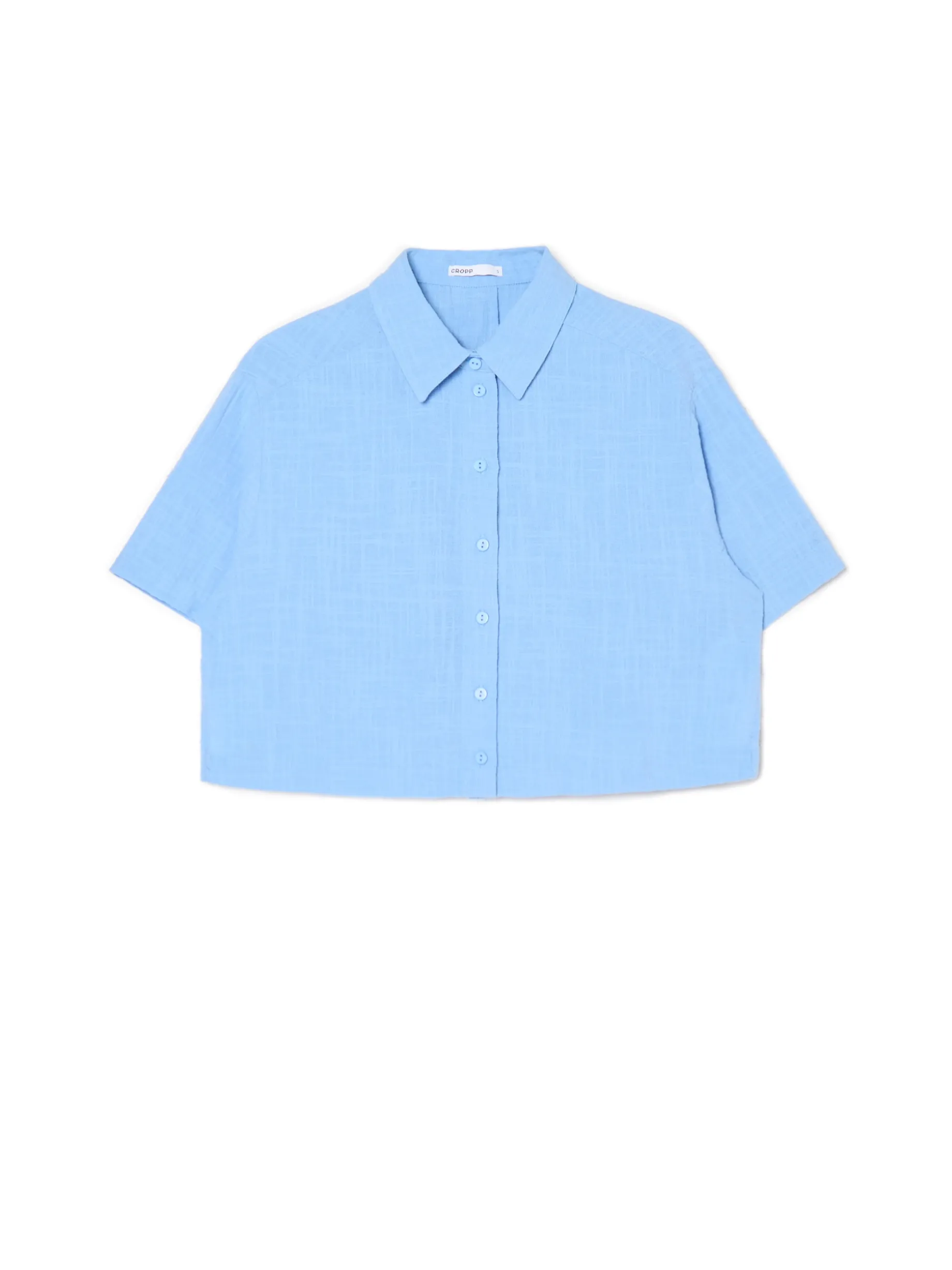 Damska luźna koszula, uszyta z bawełnianej tkaniny o wyjątkowej fakturze. krótki, obszerny krój oversize krótkie, luźne rękawy zapięcie na drobne guziki klasyczny kołnierzyk Wzrost modelki: 177 cm