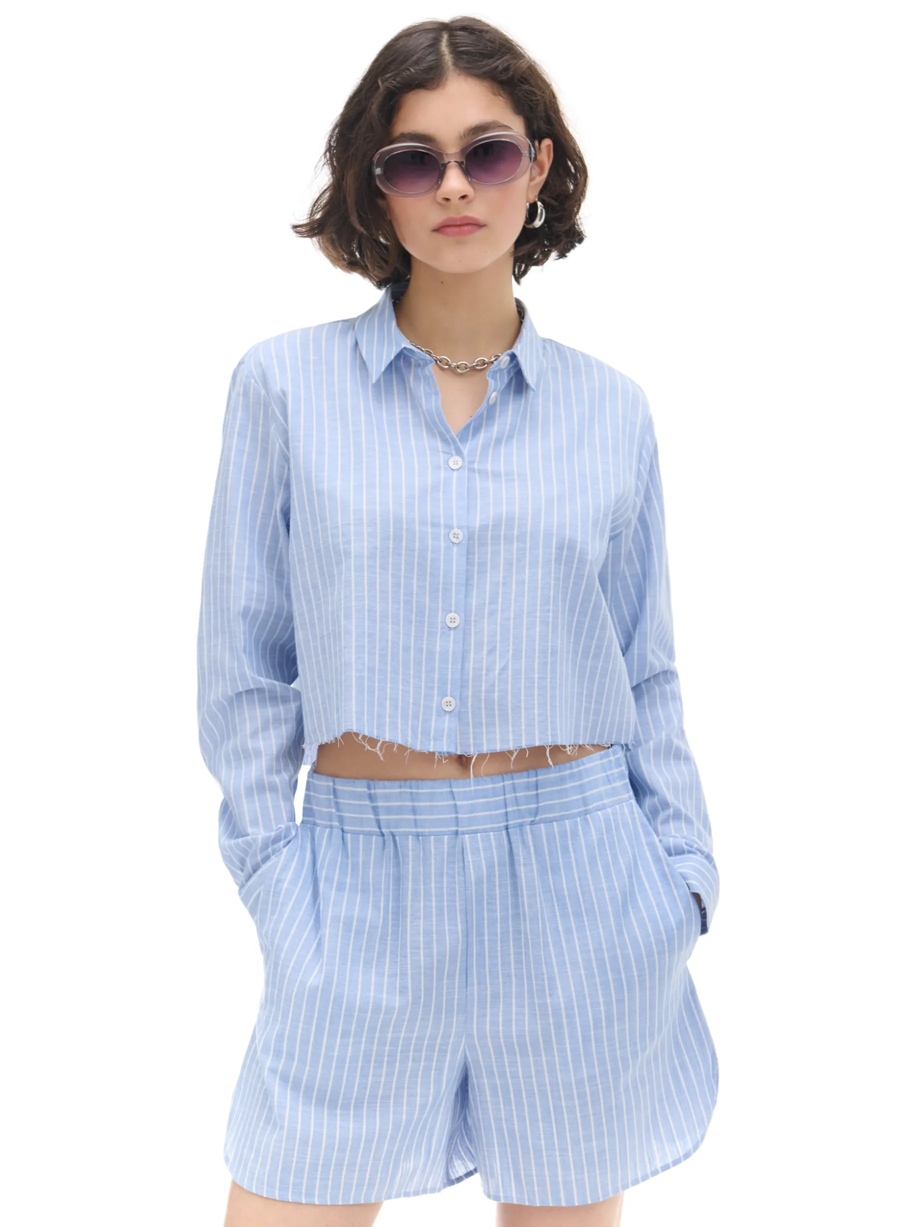 Oryginalna damska koszula w naturalnym faosnie, uszyta z bawełny w biało-niebieskie paski. 100% bawełny krótki krój długie, proste rękawy zapięcie na guziki surowe wykończenie brzegów tworzy zestaw z szortami z tego samego materiału Wzrost modelki: 172 cm