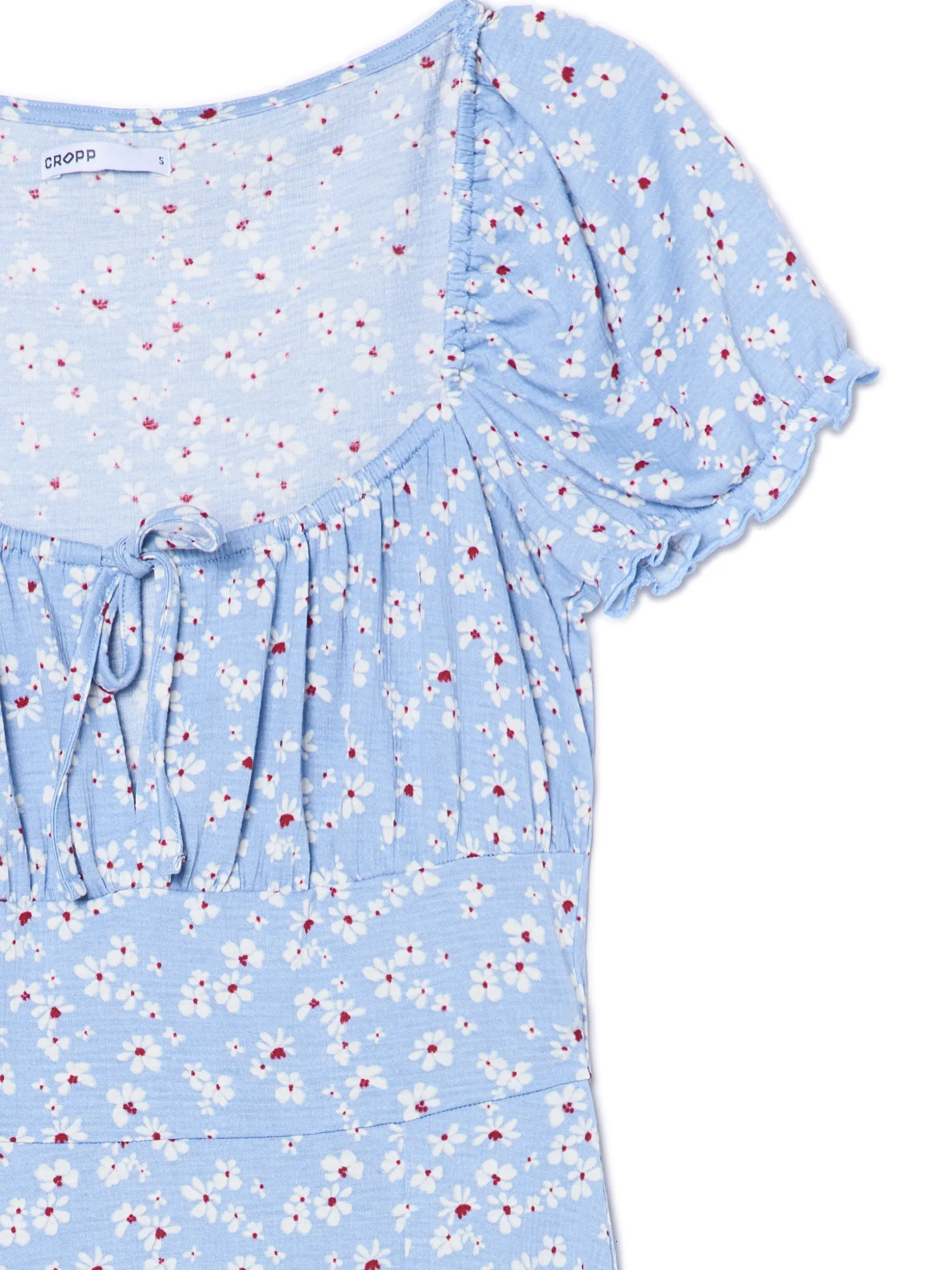 Lekka sukienka, uszyta z wzorzystej dzianiny, utrzymana w niebieskiej kolorystyce. Dostępne inne warianty kolorystyczne. długość midi fason typu empire – odcięcie tuż po biustem krótkie, bufiaste rękawy dekolt z rozcięciem i wiązaniem lekko rozkloszowana spódnica z rozcięciem nadruk w stokrotki na całej powierzchni