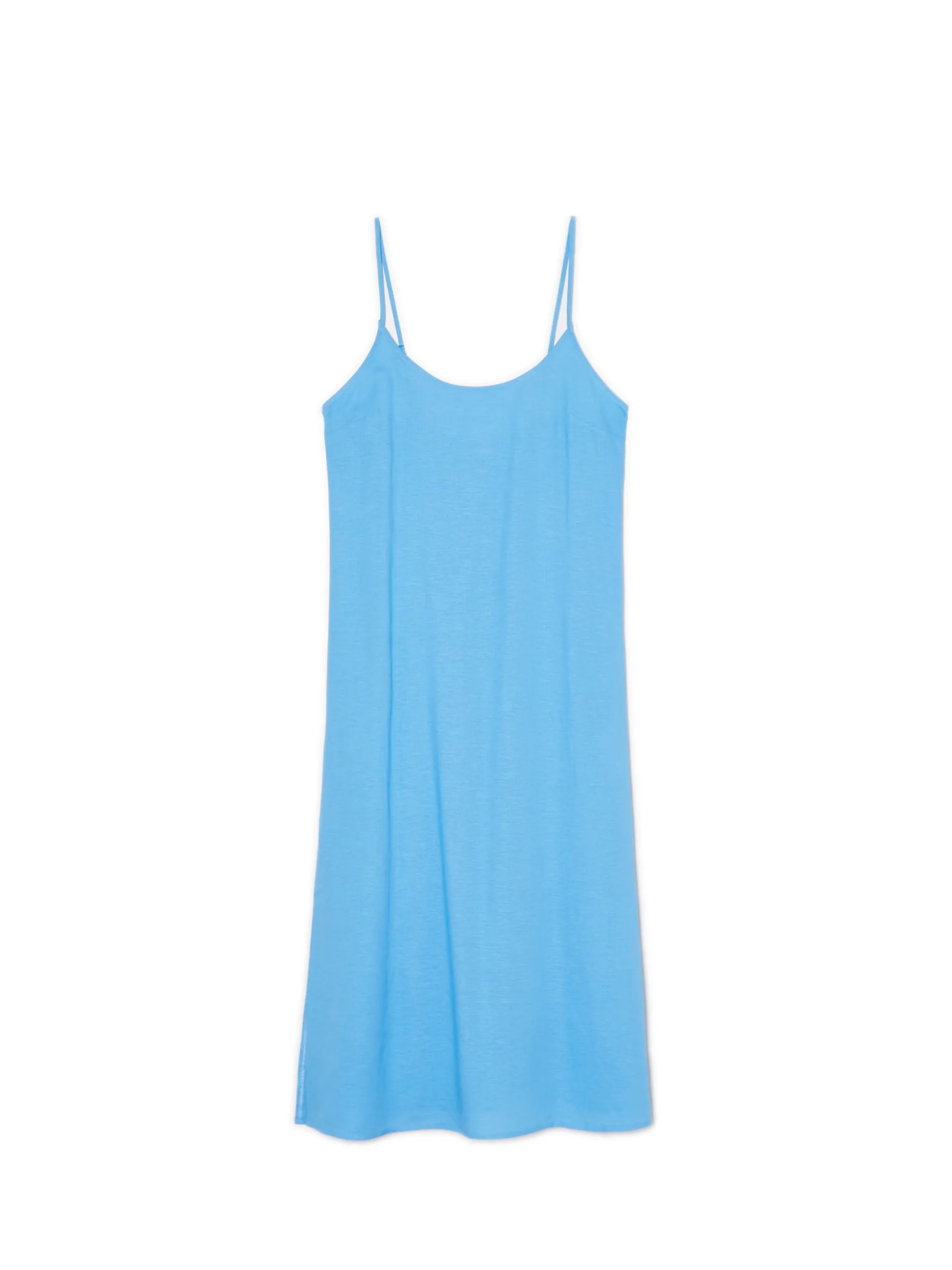 Zwiewna damska sukienka midi w niebieskim odcieniu uszyta z mieszanki wiskozy i lnu. Regulowane cienkie ramiączka, rozcięcia po bokach i luźny krój stawiają ją na topce letnich stylizacji. lekki materiał z wiskozą długość midi swobodny, luźny krój wąskie ramiączka z regulacją długości delikatne rozcięcia po bokach