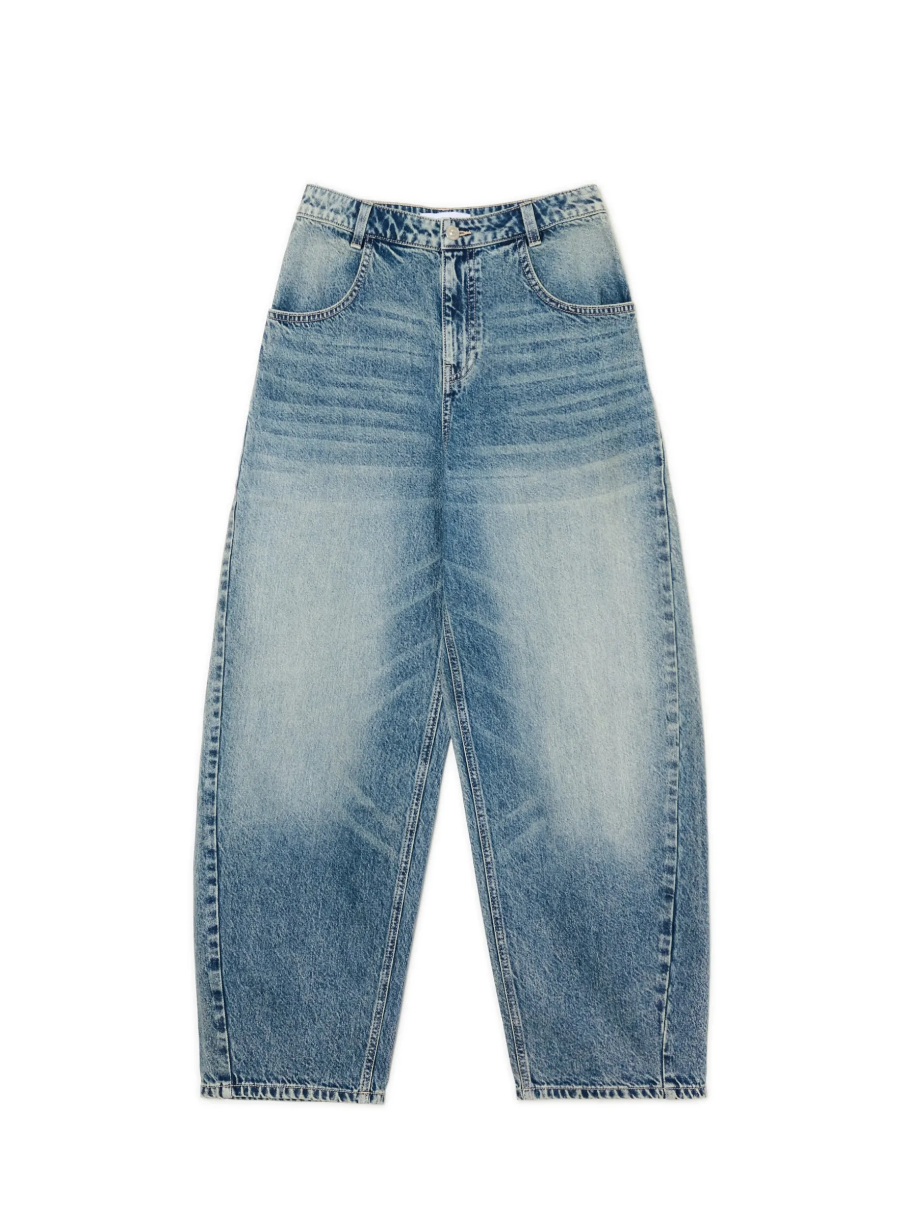 Damskie spodnie jeansowe o luźnym kroju, uszyte z bawełnianej tkaniny. Po obu stronach nieregularny efekt sprania. Item dobrze trzyma się na biodrach i fituje z dopasowanymi topami. 100% bawełny denimowe spodnie o kroju skater zapięcie na zamek i guzik długie, szerokie nogawki cztery kieszenie szlufki na pasek efekt sprania na całości