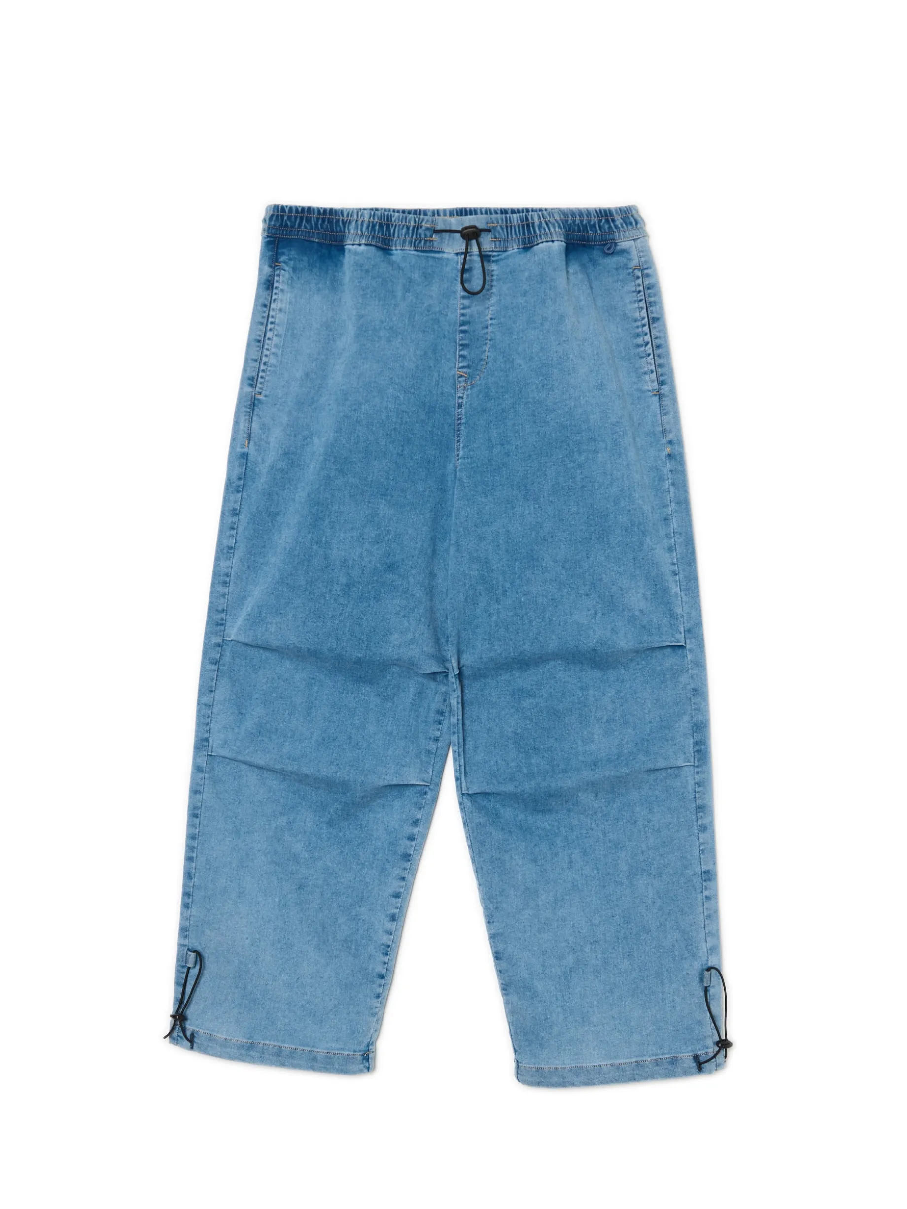 Męskie spodnie jeansowe o kroju parachute, uszyte z lekkiej tkaniny. elastyczny pas z gumką – regulacja za pomocą stopera bardzo szeroka nogawka elastyczny dół nogawek z regulacją