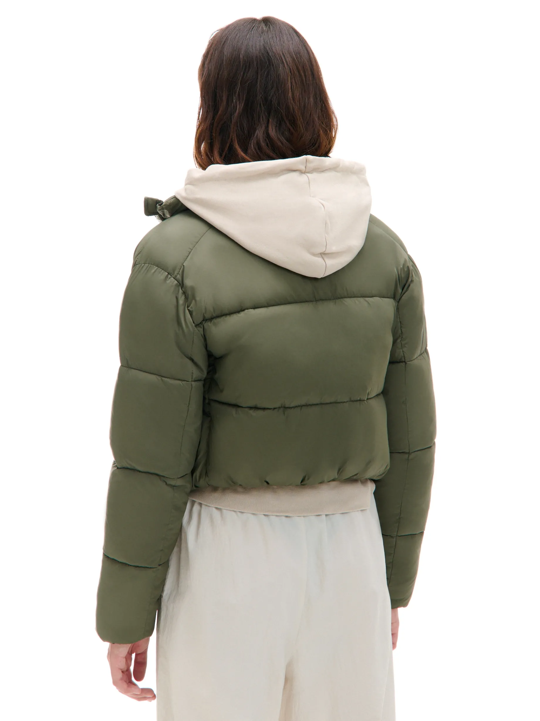 Pikowana damska kurtka typu puffer, uszyta z tkaniny w kolorze oliwkowym. Wewnątrz ocieplenie z recyklingowanego puchu syntetycznego. Ten outerwear ogrzeje Cię w sezonie zimowym! basicowa kurtka typu puffer zapinana na zamek na całej długości wewnątrz wykończenie na podszewce ocieplenie wysoki kołnierz szerokie rękawy zakończone gumką kieszenie boczne z zamkami zapięcia z wygodnymi pullerami