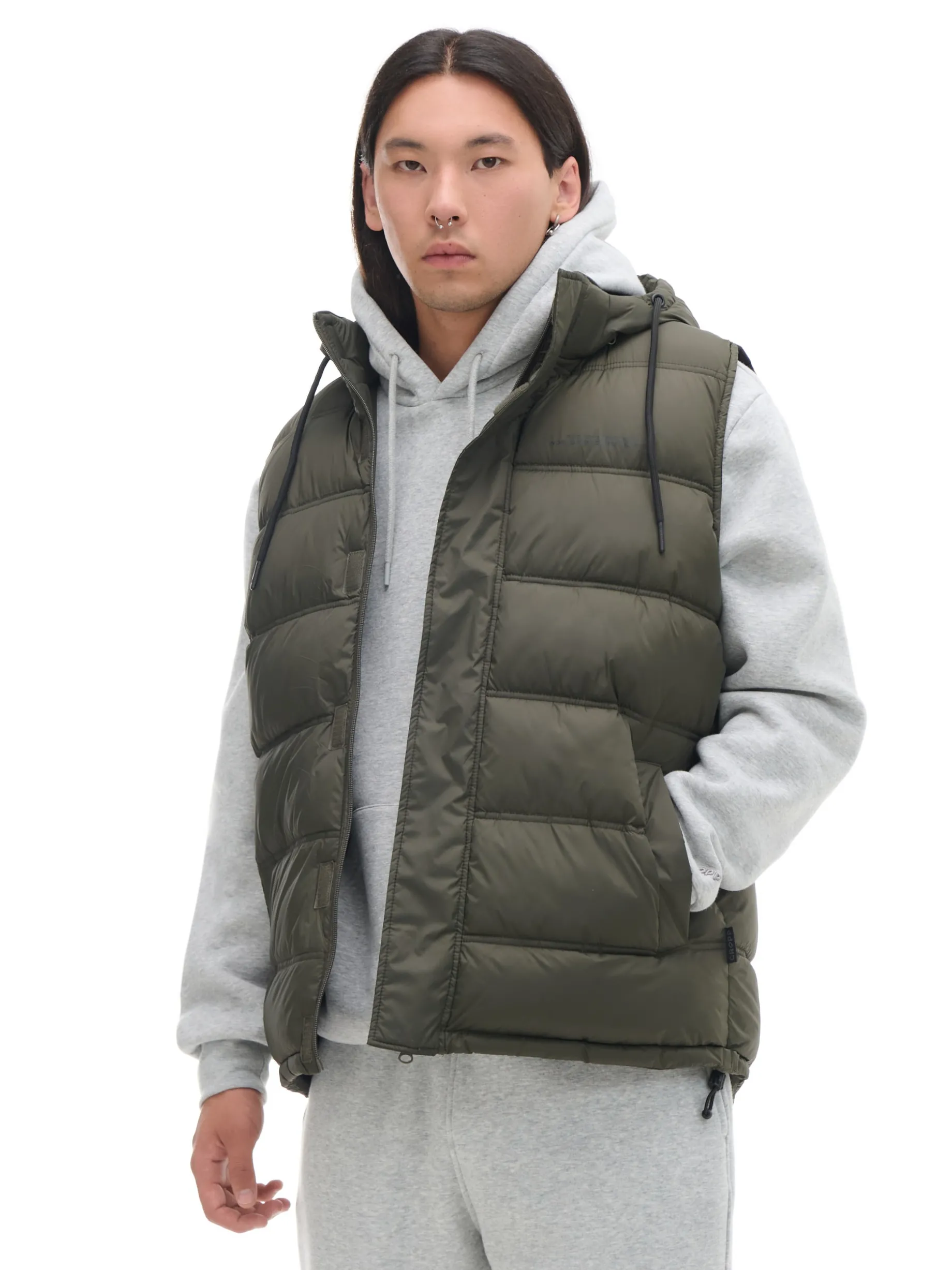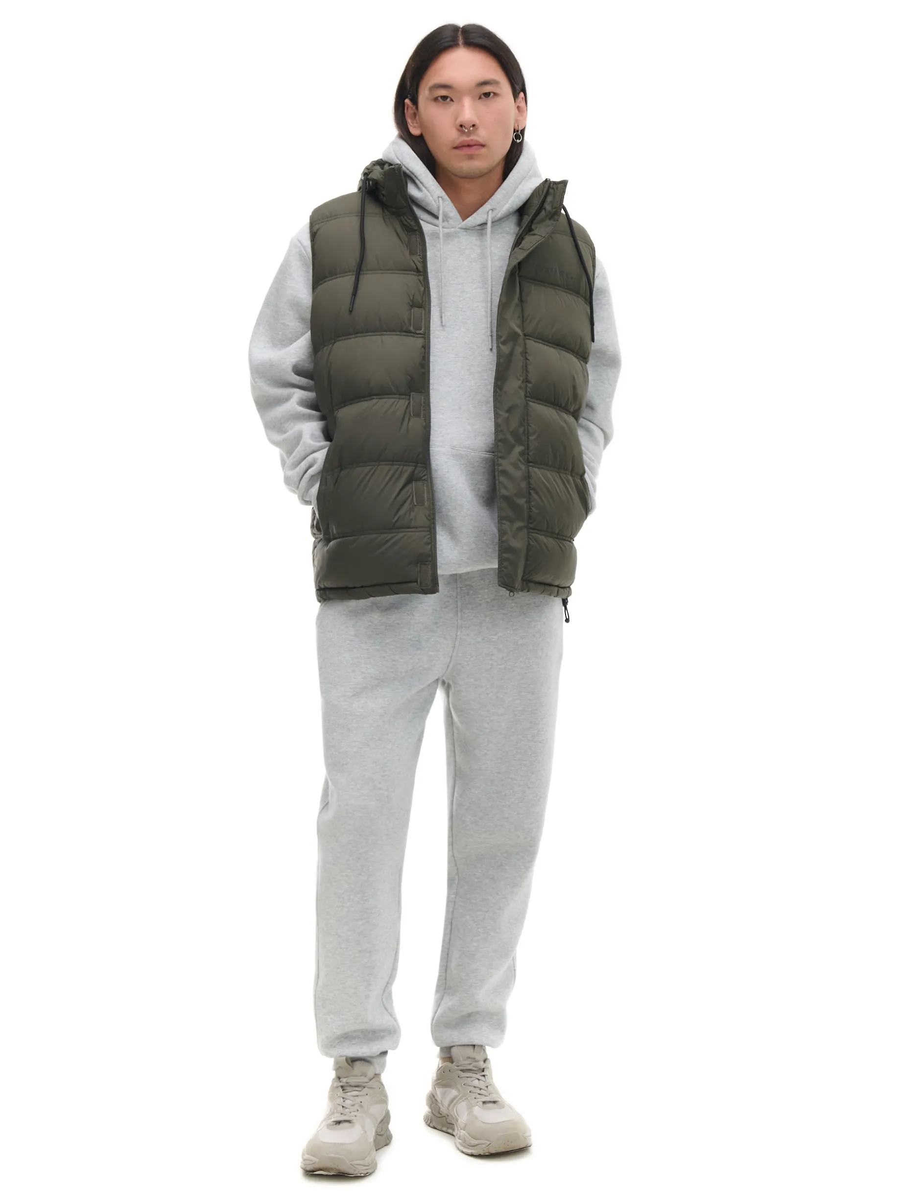 Męska kamizelka z kapturem, uszyta z trwałego, pikowanego materiału. Wygodne zapięcie, praktyczne kieszenie i regulacje zapewnią Ci komfort noszenia. pikowanie na całości zapięcie na zamek na całej długości listwa kryjąca z zapięciem na rzepy miękki, odpinany kaptur z troczkami wysoki kołnierz ściągacz tunelowy ze stoperami na dole otwarte kieszenie po bokach wewnętrzna kieszeń na rzep ozdobny nadruk tekstowy na piersi PROTECTION LEVEL 2 Kamizelka uszyta z tkaniny z lekkim wypełnieniem, której właściwości zapewnią Ci ochronę przed wiatrem i deszczem. Doskonale sprawdzi się w sezonie przejściowym.