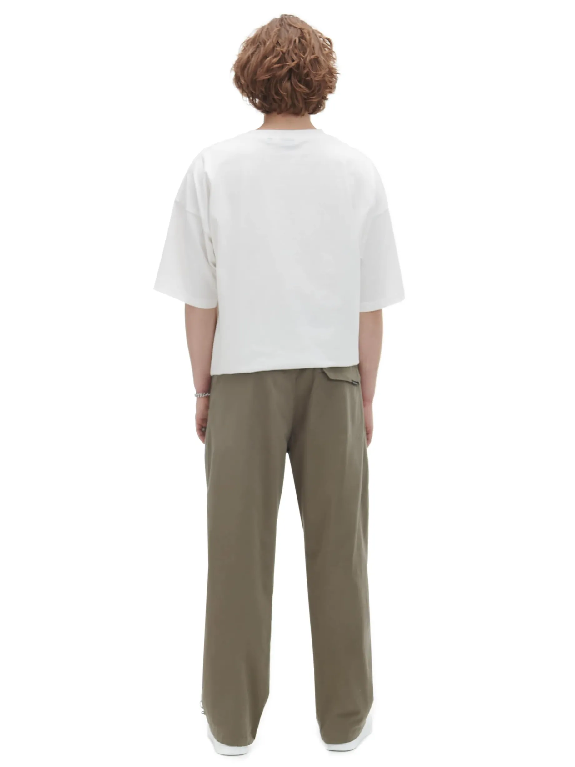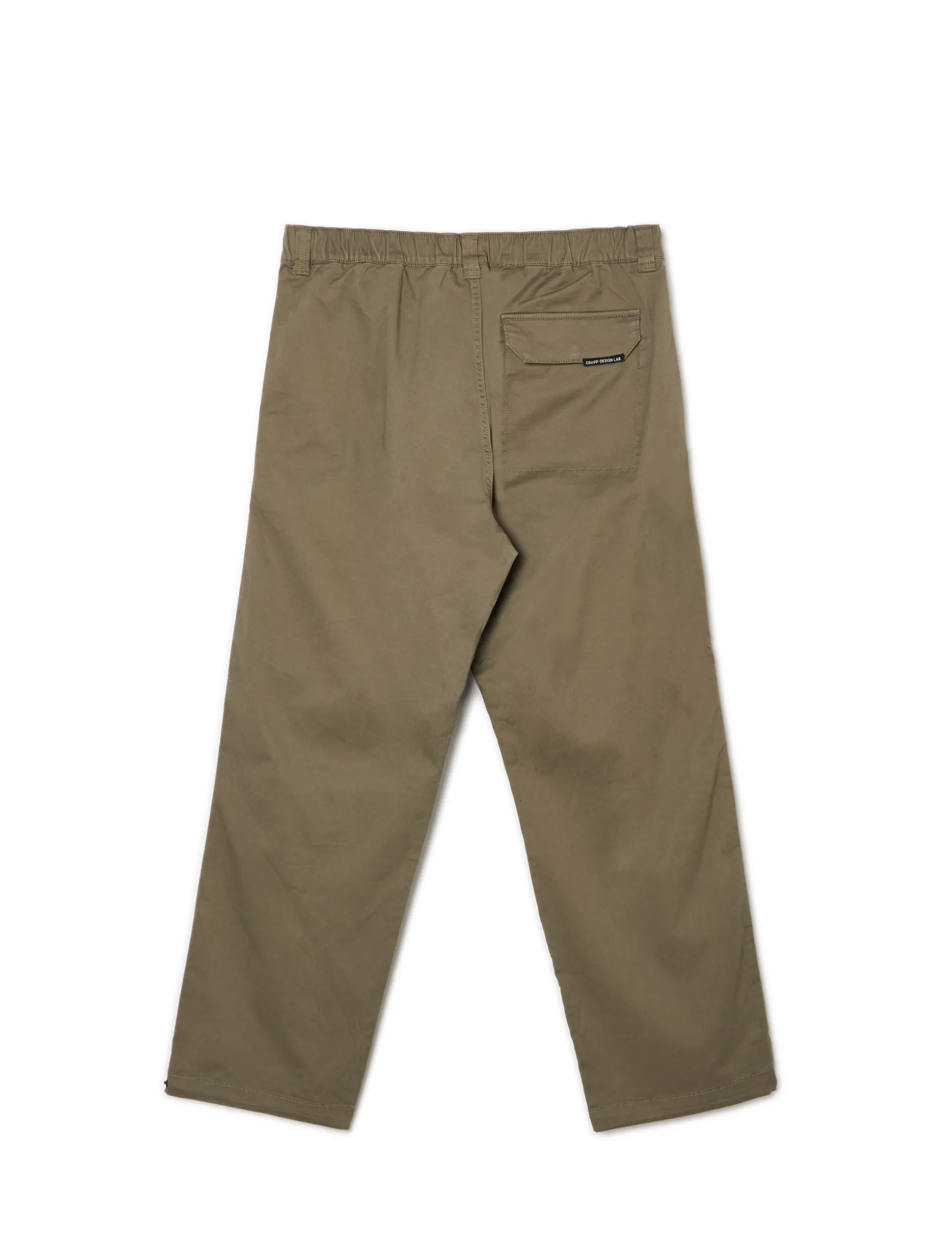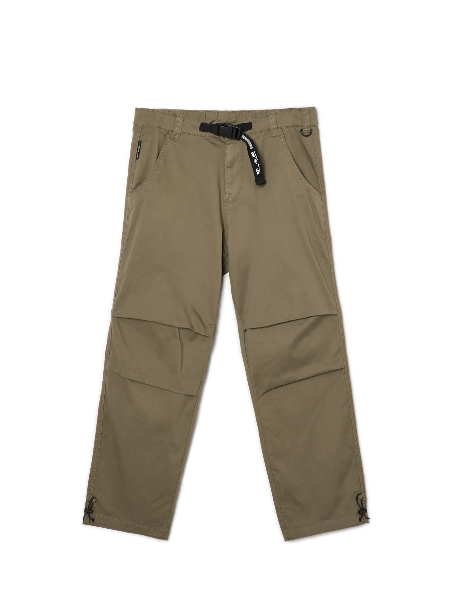 Zielone męskie spodnie o luźnym fasonie parachute, uszyte z lekkiej bawełnianej tkaniny. regularny stan rozporek z suwakiem wbudowany pasek zapinany na plastikową klamrę luźna nogawka zakończona regulacją za pomocą elastycznej gumki ze stoperem trzy kieszenie, w tym jedna z tyłu, zapinana na zatrzask Wzrost modela: 184 cm