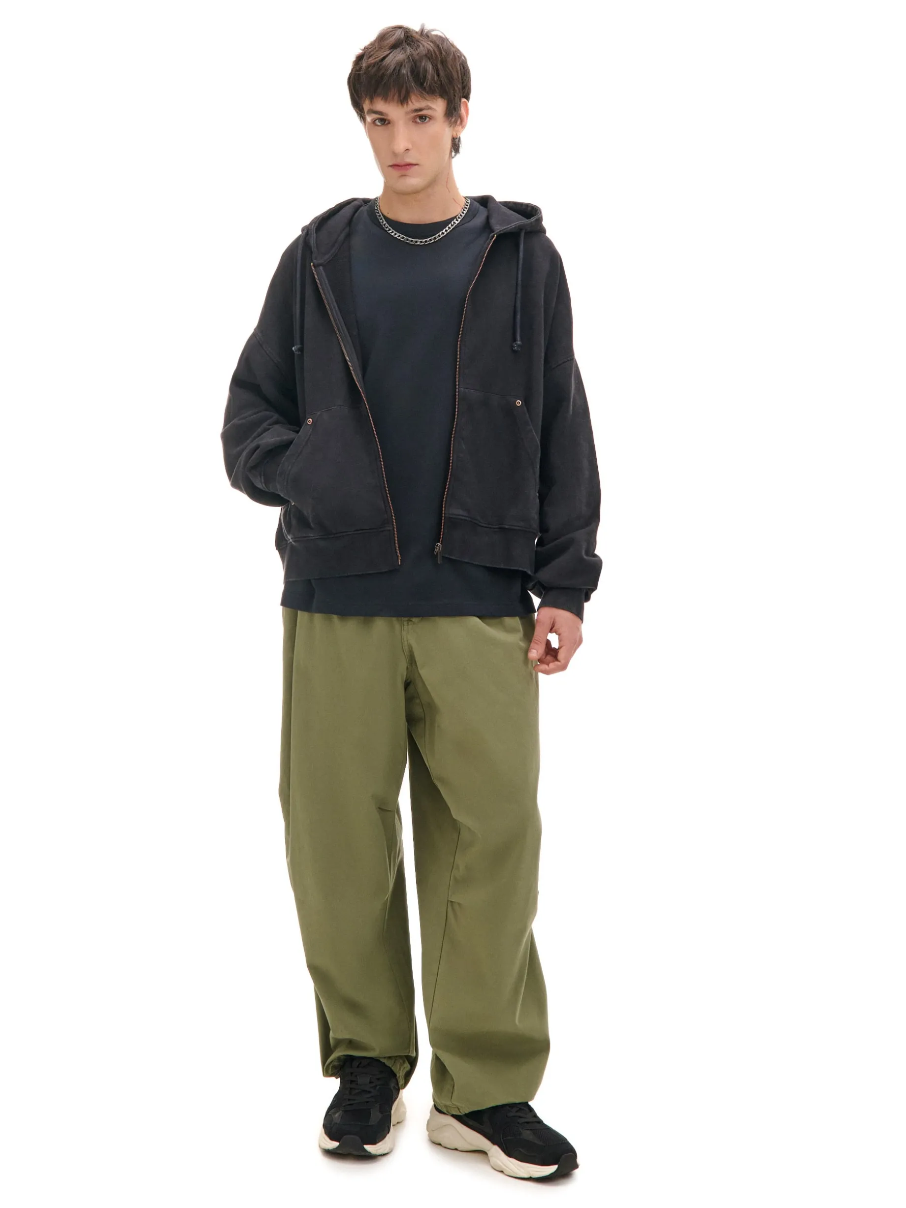 Męskie spodnie typu parachute, uszyte z bawełny w kolorze oliwkowym. Wygodna regulacja w pasie, oryginalne zakładki i pojemne kieszenie to must have spontanicznych wypadów. 100% bawełny swobodny, luźny krój zapięcie na zatrzask i zamek regulacja dołu i pasa za pomocą sznurka ze stoperem trzy kieszenie, jedna zapinana na zatrzask ozdobne zakładki