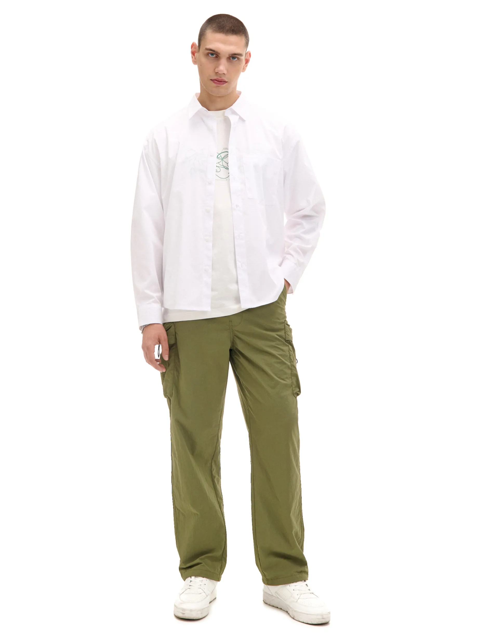 Męskie spodnie o kroju comfort uszyte z gładkiej tkaniny. Wyposażone w 6 praktycznych kieszeni – otwartych i z patkami. Regulacje za pomocą elastycznej gumy ze stoperami w pasie i przy nogawkach zapewniają dopasowanie do sylwetki. wygodny fason comfort długa, luźna nogawka zakończona gumką ze stoperem ściągacz tunelowy ze stoperami w talii dwie kieszenie z patkami i zapięciem na zatrzaski kieszenie z patkami na udach regulacja kieszeni za pomocą elastycznej gumki ze stoperem skośne kieszenie z przodu