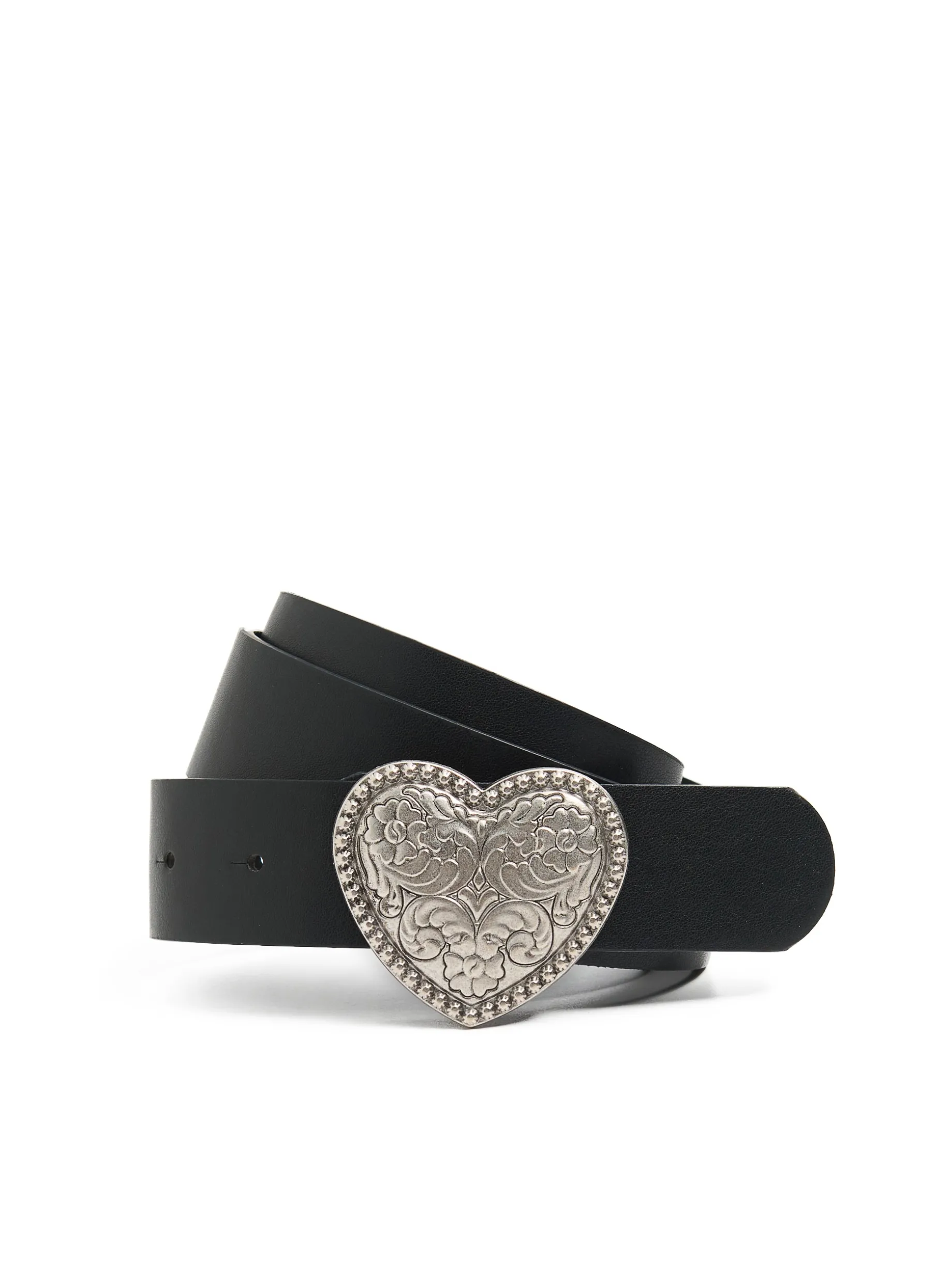 Damski pasek do spodni z dekoracyjną klamrą w kształcie serca ułatwiającą regulację. Wykonany z imitacji skóry w klasycznym, czarnym kolorze. Idealny dodatek do wielu stylizacji. imitacja skóry możliwość regulacji szerokości obwodu, dzięki zapięciu z przodu dekoracyjna klamra