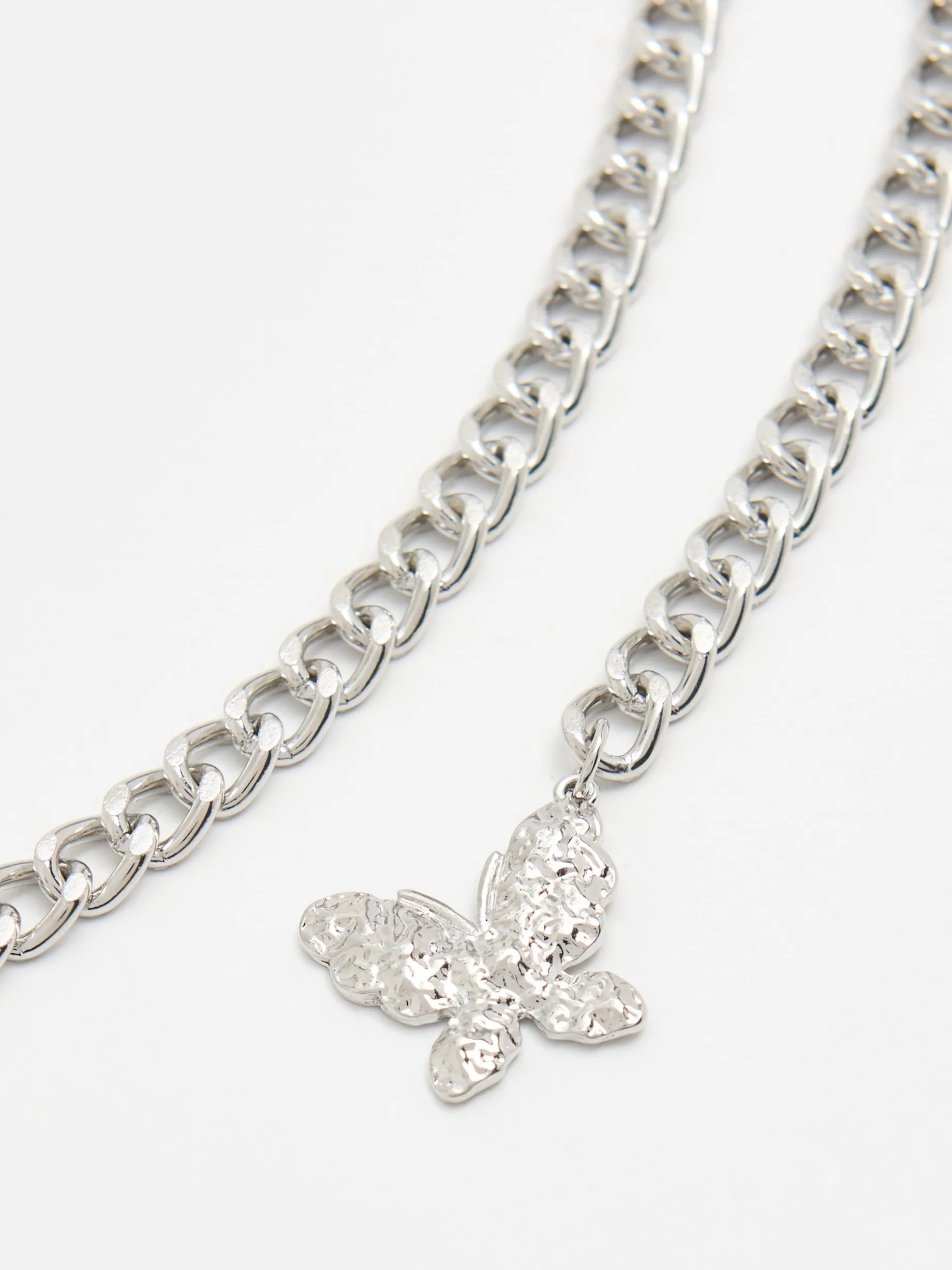 Damski metalowy pasek typu łańcuch z wygodną regulacją i praktycznym zapięciem na pomocą karabińczyka. Model uzupełnia delikatny splot w kolorze srebrnym i ozdobna naszywka w kształcie motyla.