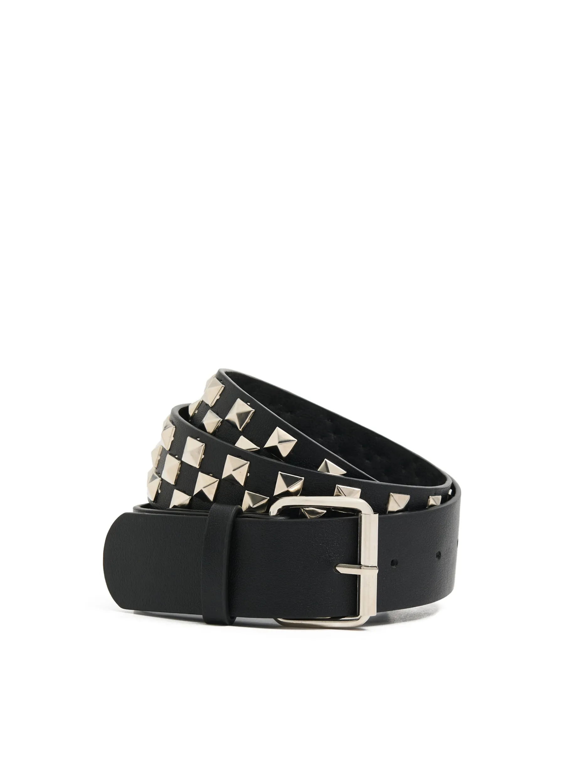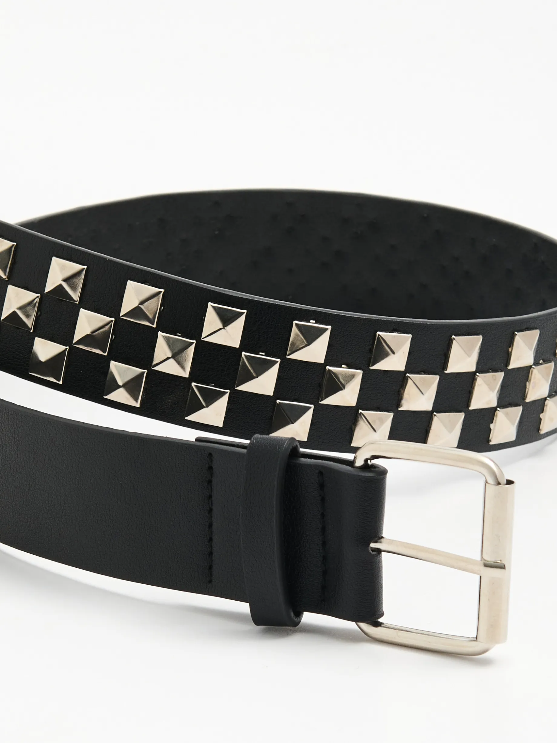Czarny damski pasek do spodni wykonany z imitacji skóry. Te metalowe ćwieki i klamra będą wyglądały sztosowo jako dodatek do wielu stylizacji.