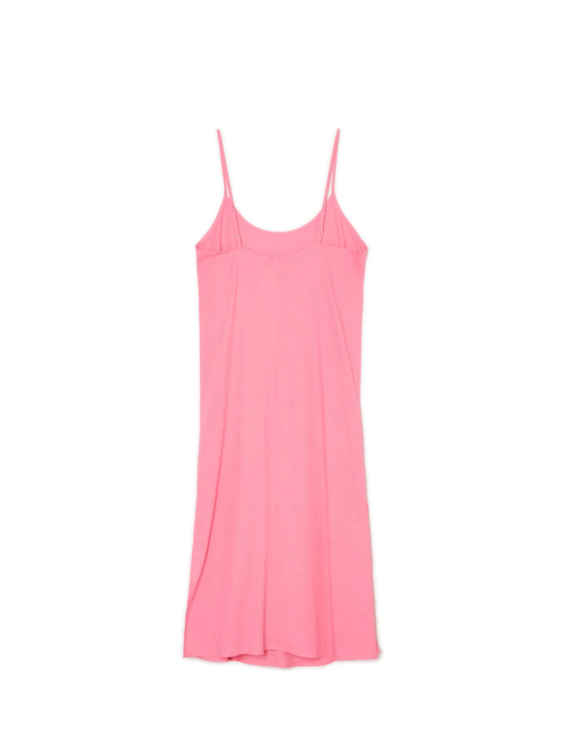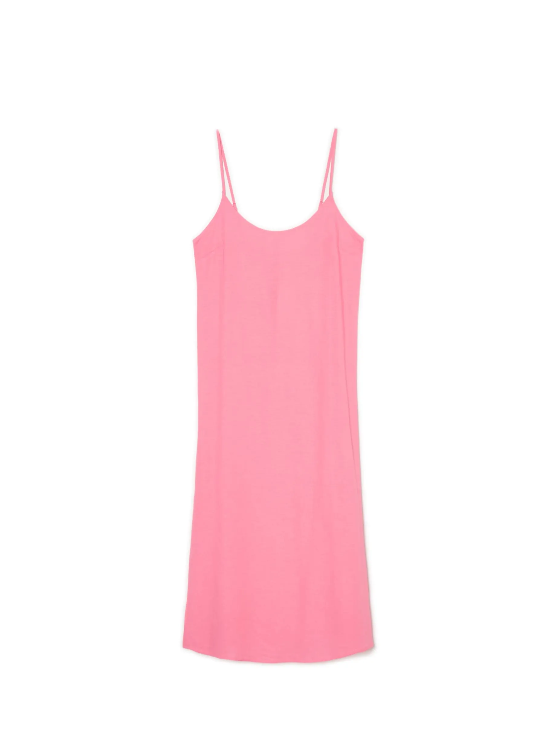 Zwiewna damska sukienka midi w różowym odcieniu uszyta z mieszanki wiskozy i lnu. Regulowane cienkie ramiączka, rozcięcia po bokach i luźny krój stawiają ją na topce letnich stylizacji. lekki materiał z wiskozą długość midi swobodny, luźny krój wąskie ramiączka z regulacją długości delikatne rozcięcia po bokach