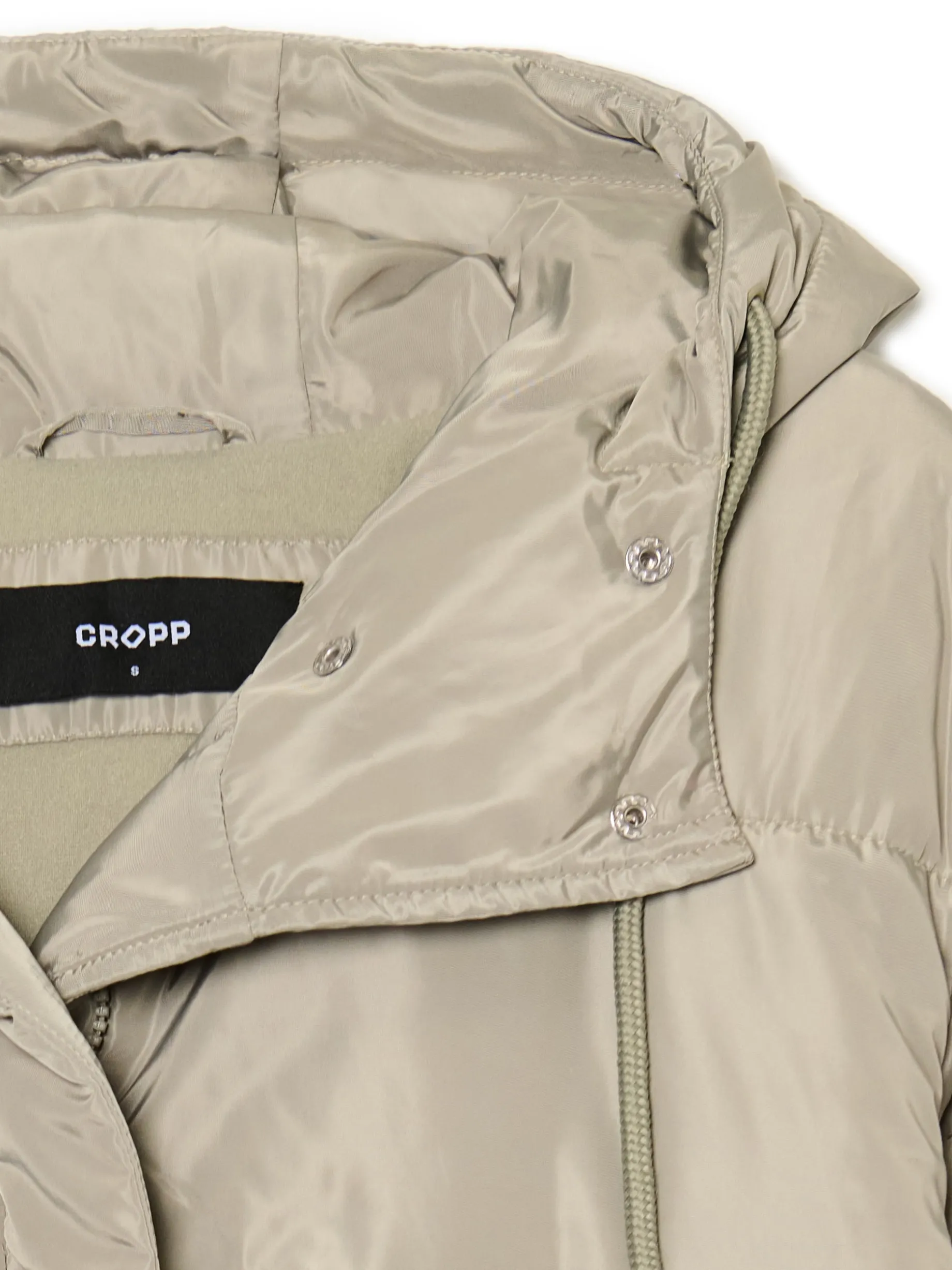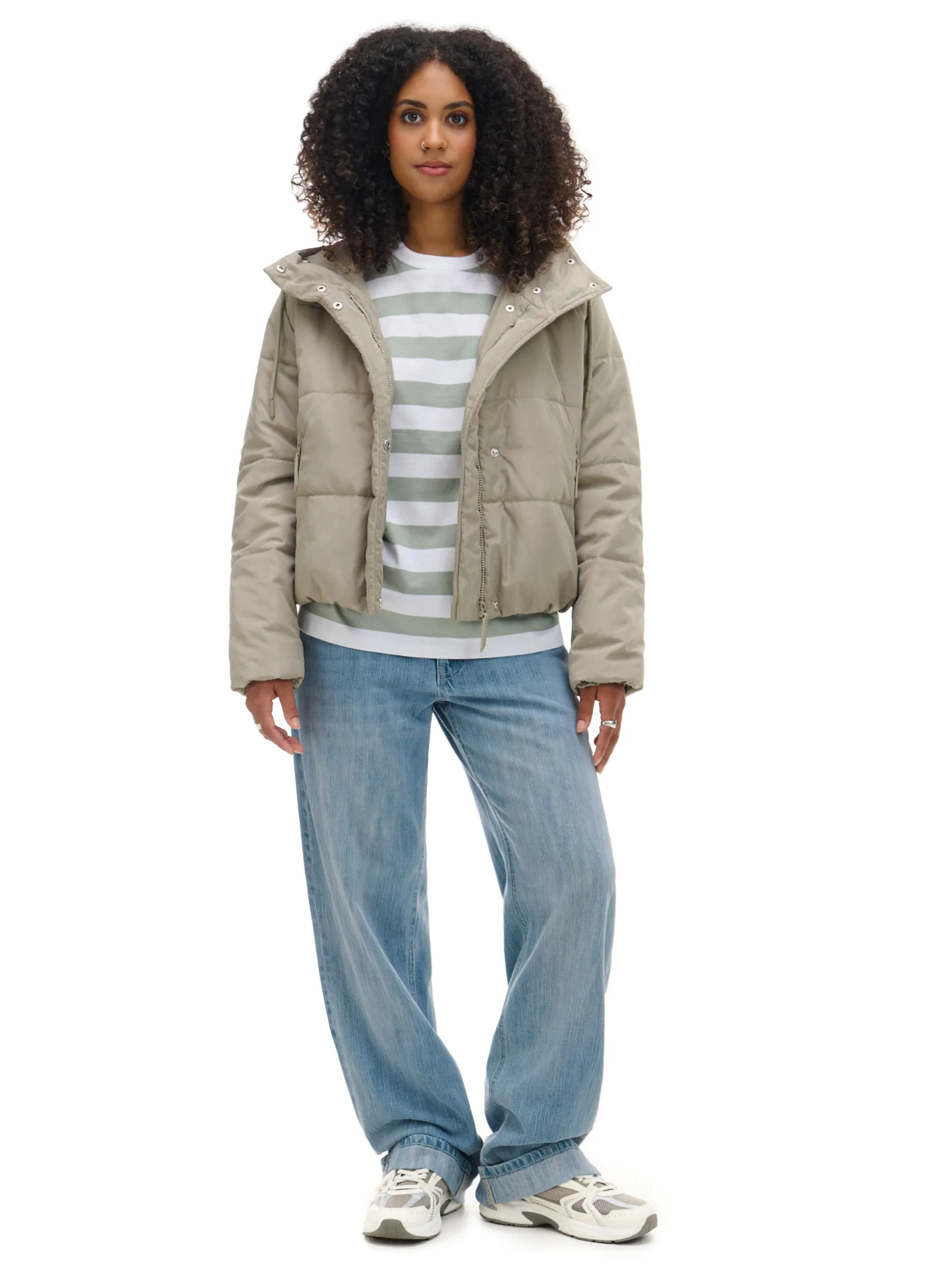 Damska biała kurtka puffer, uszyta z wodoodpornej tkaniny. Idealna na jesienny sezon przejściowy. średnia długość, regularny krój pikowanie na całej powierzchni zapięcie na suwak, kryty panelem zapinanym na zatrzaski stójka zapinana na zatrzaski kaptur regulowany sznurkiem rękawy i dolny brzeg zakończone ściągaczem z wszytą elastyczną gumką dwie kieszenie podszewka z polarowego, przyjemnego w dotyku materiału wypełnienie z poliestru