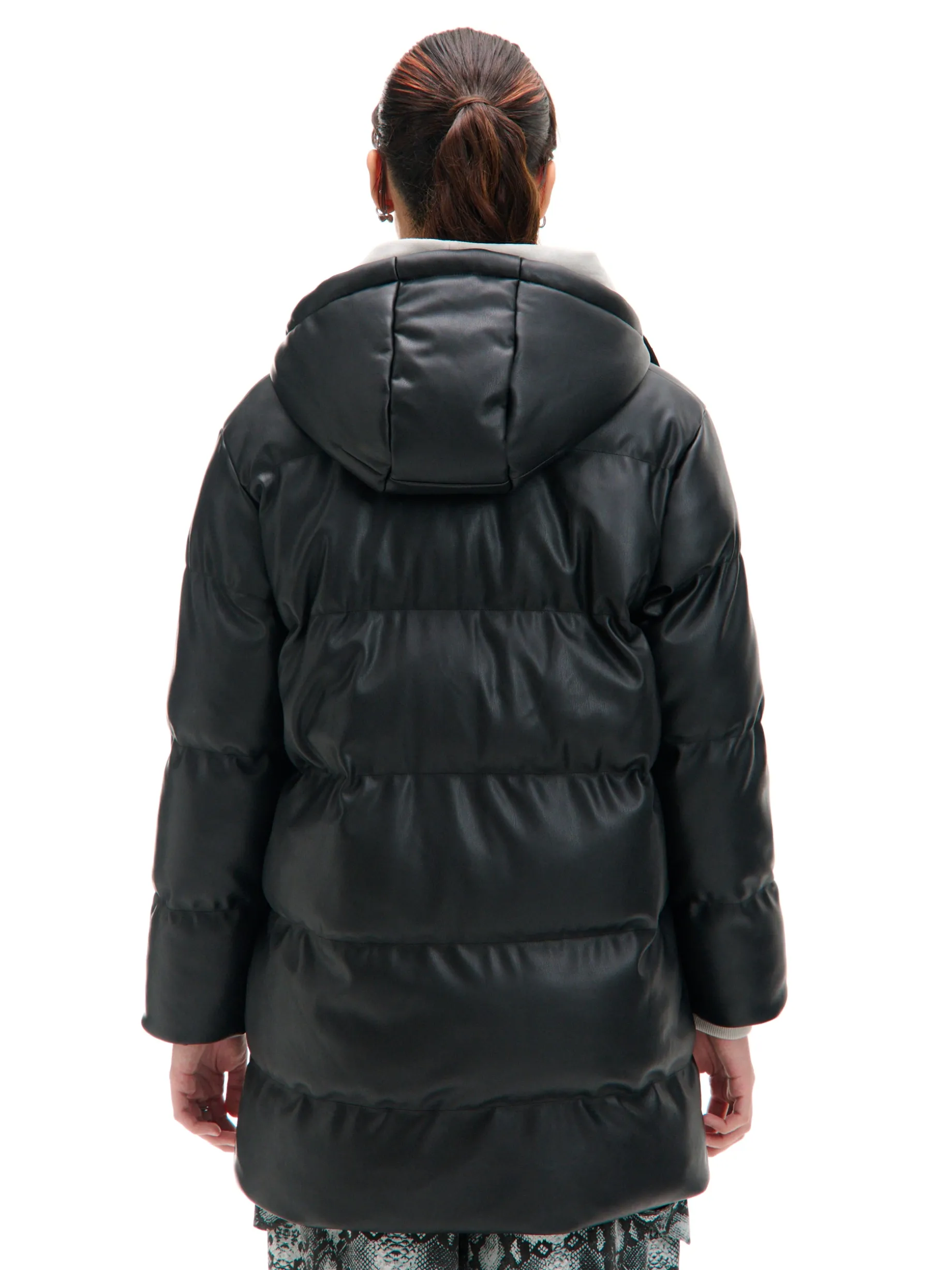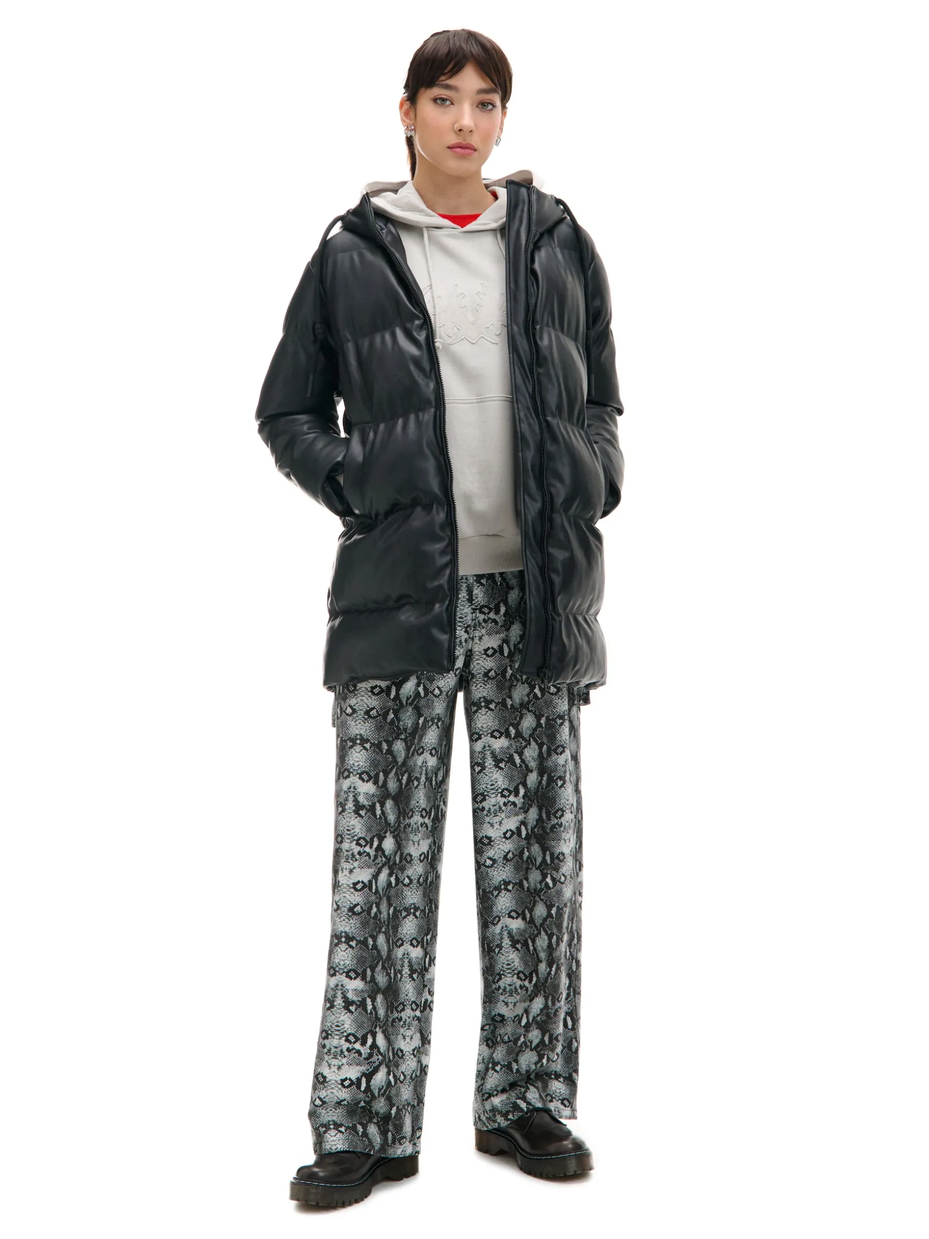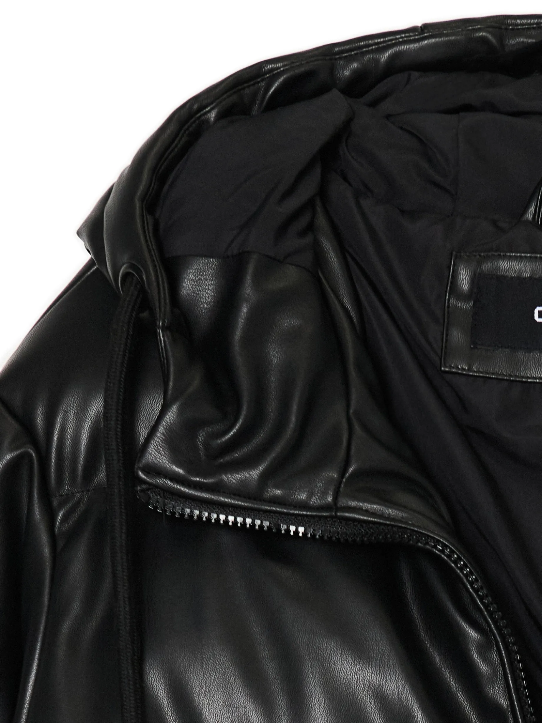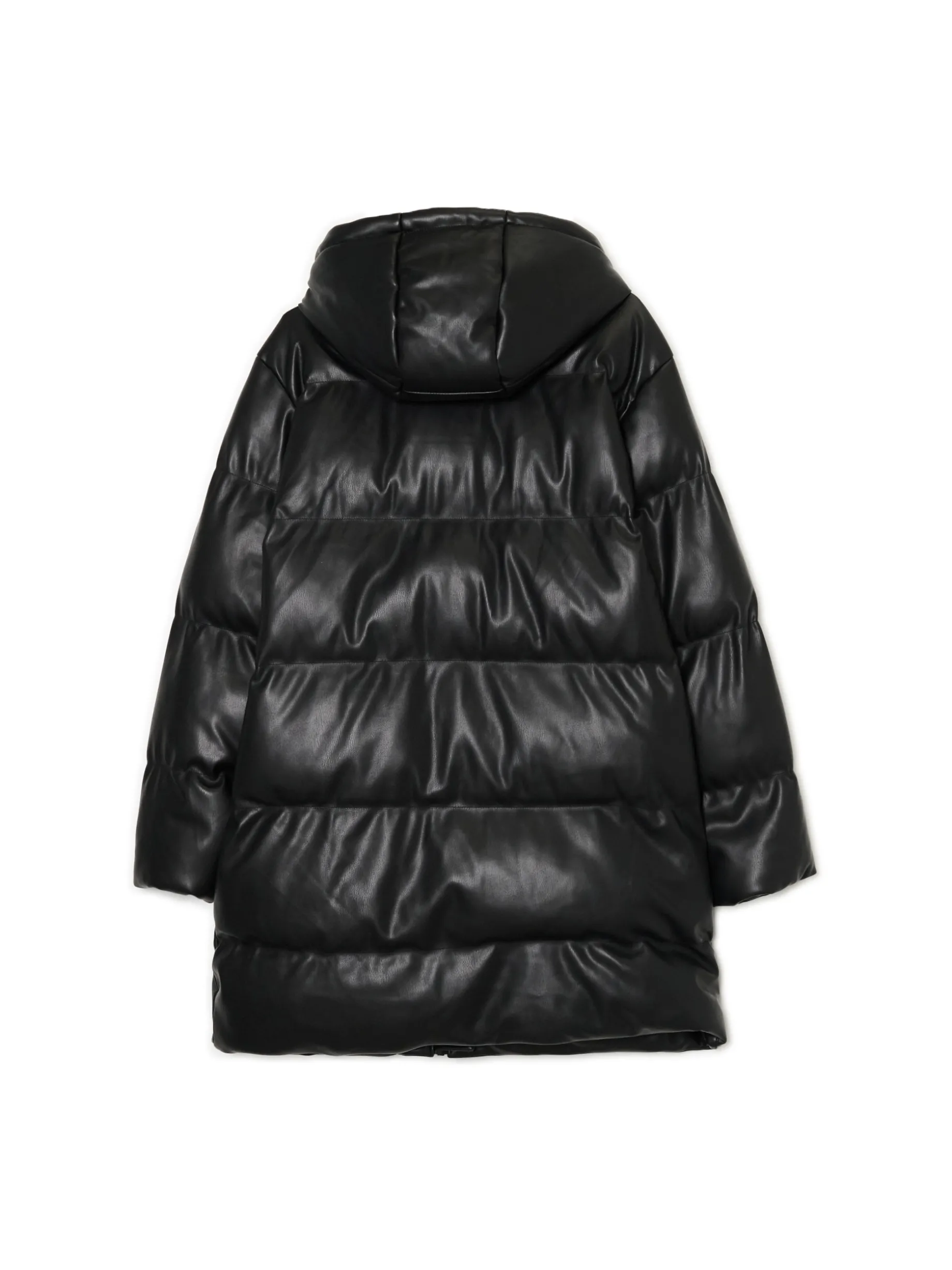 Nie możesz tego przegapić! Oversize’owy pikowany damski płaszcz typu puffer wykonany z imitacji skóry. W wyposażeniu kaptur z regulacją obwodu i kieszenie na zamek. Zimowy casual w klasycznym, czarnym kolorze na każdą okazję! długi pikowany płaszcz typu puffer imitacja skóry wewnątrz wykończenie na podszewce syntetyczne wypełnienie krój oversize zapięcie na zamek na całej długości obszerny kaptur z troczkami długie, swobodne rękawy dwie kieszenie z przodu
