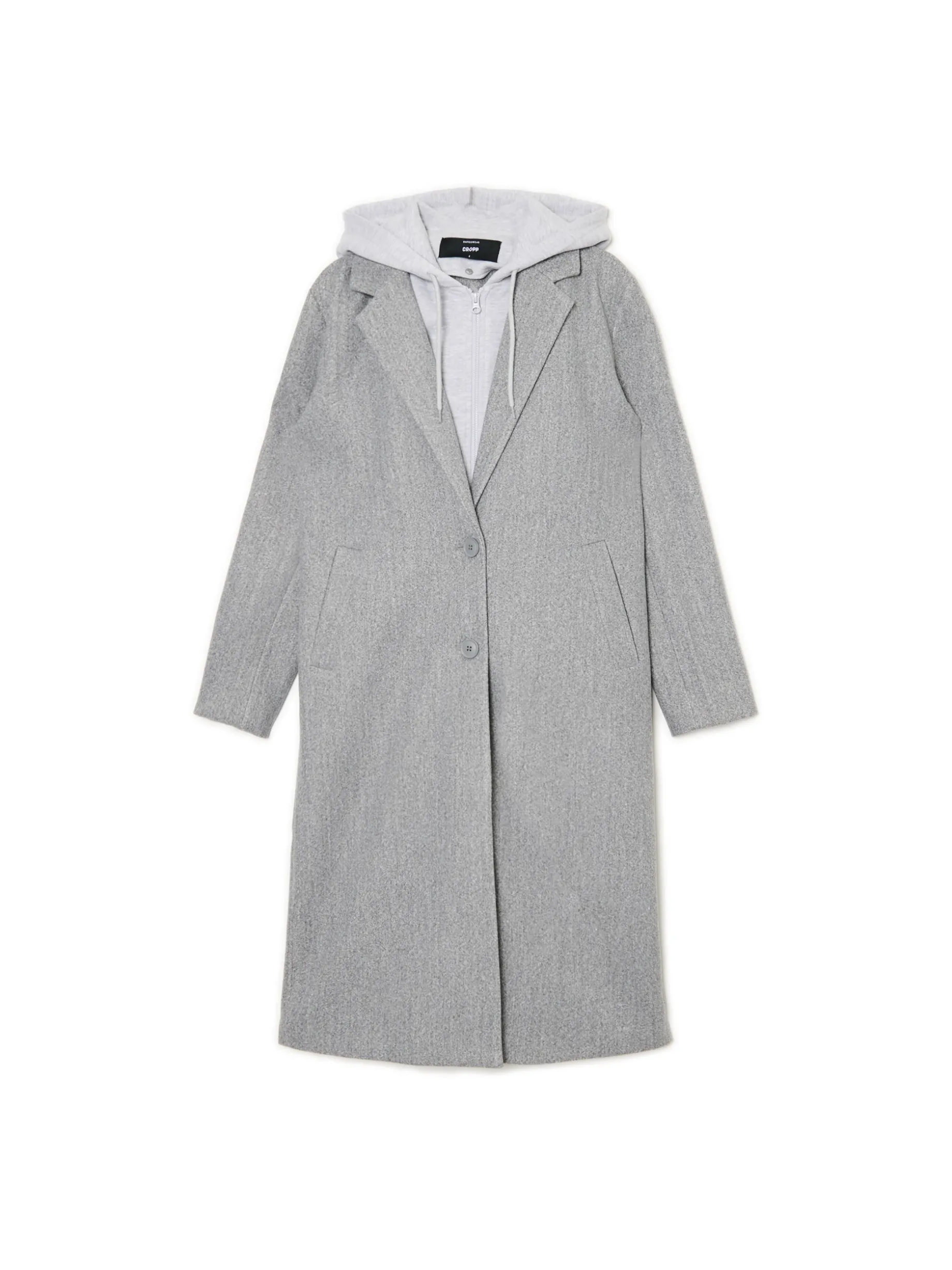 Melanżowy damski płaszcz uszyty z łączonych materiałów w kolorze szarym. Wstawka z miękkiej bluzy hoodie zapinanej na suwak nadaje jej sportowego charakteru. Oryginalny item na jesienne dni! regularny krój jednorzędowe zapięcie na guziki wykończenie na podszewce wykładany kołnierz miękki kaptur z troczkami długie rękawy dwie kieszenie po bokach praktyczne rozcięcie z tyłu