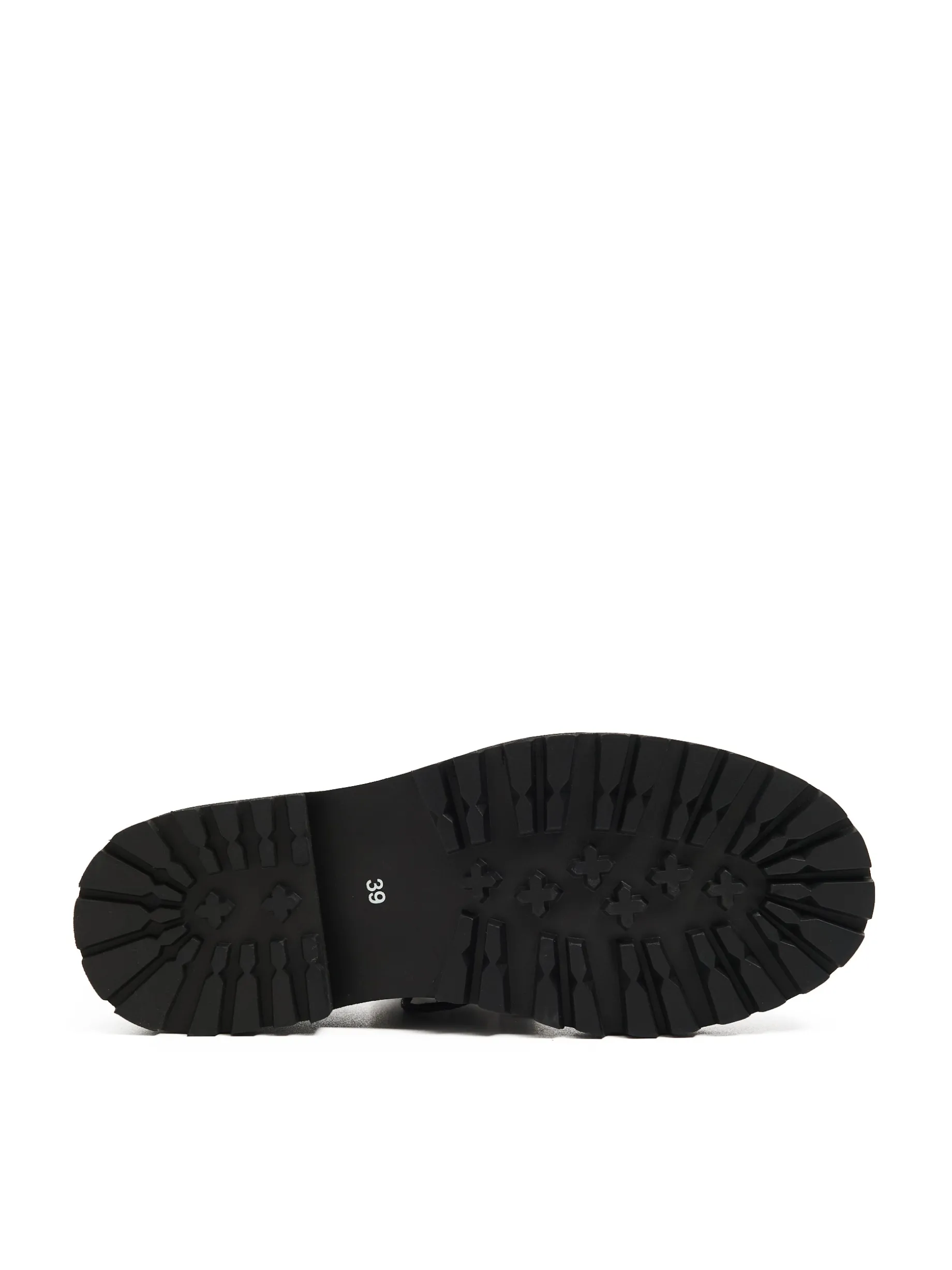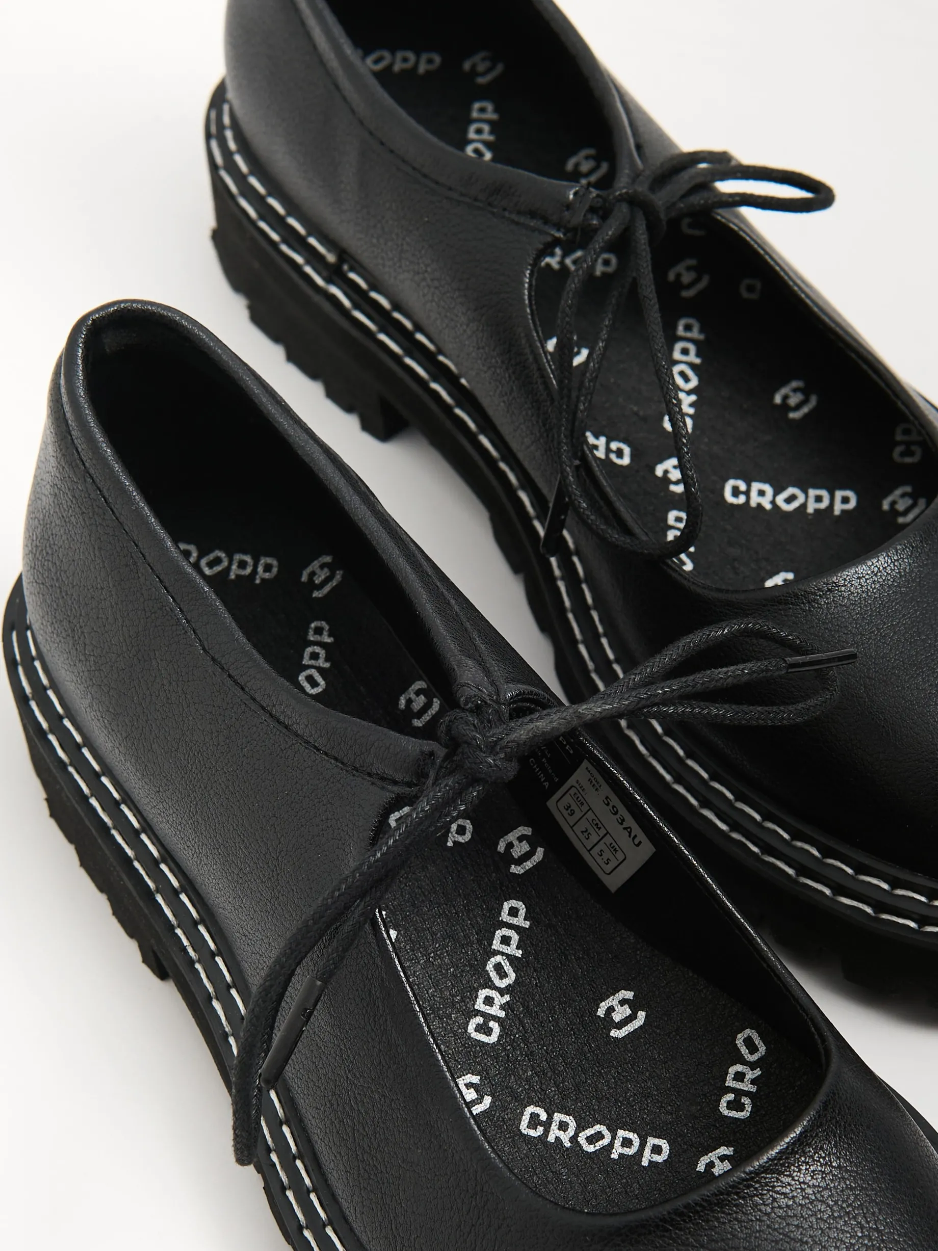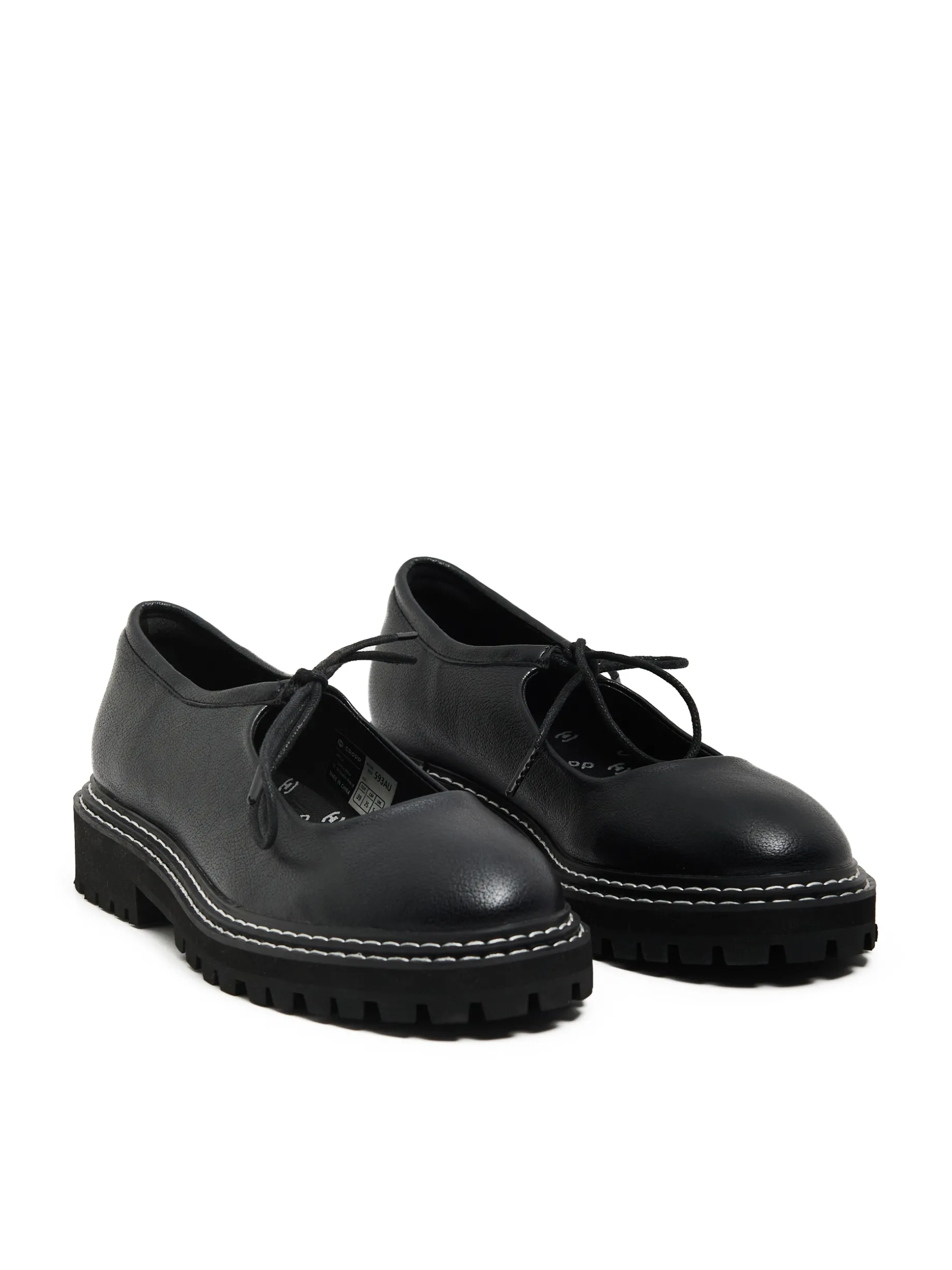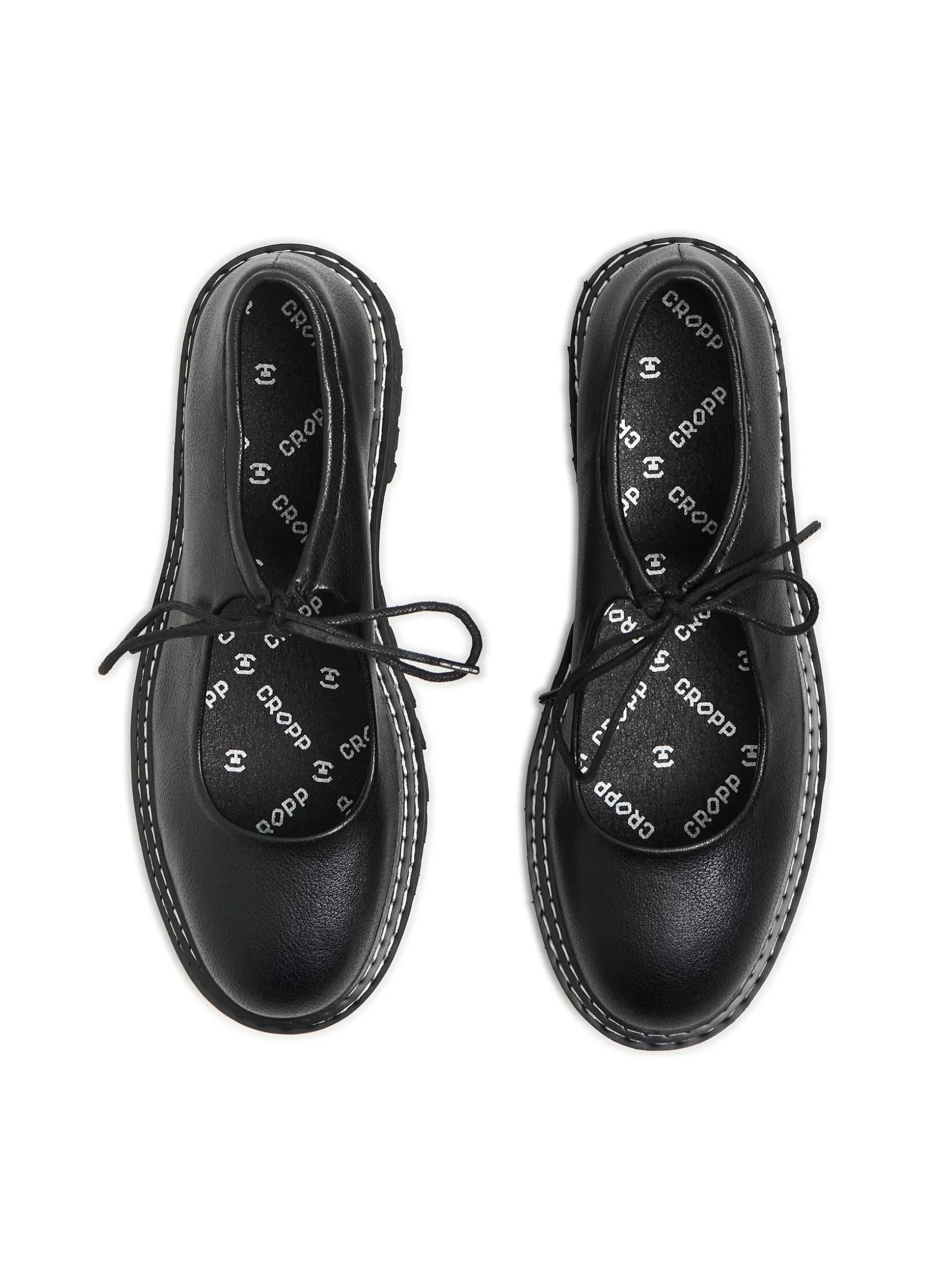 Półbuty damskie w kolorze czarnym, wykonane z imitacji skóry. Płaska podeszwa z niskim obcasem, ozdobne sznurowanie i kontrastowe przeszycia. Para idealna na ciepłe wieczory! cholewka z imitacji skóry wiązane na czarne sznurowadła traperowa, masywna podeszwa i obcas kontrastowe przeszycia