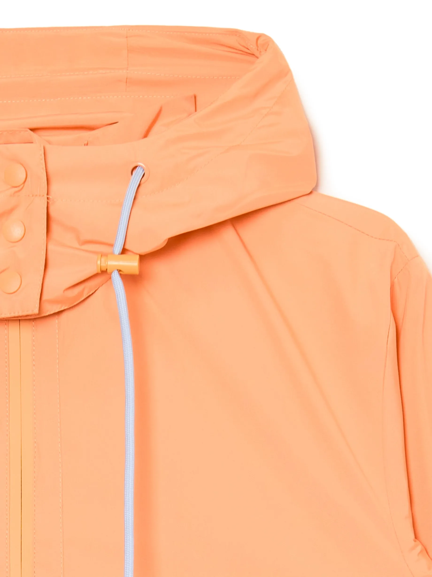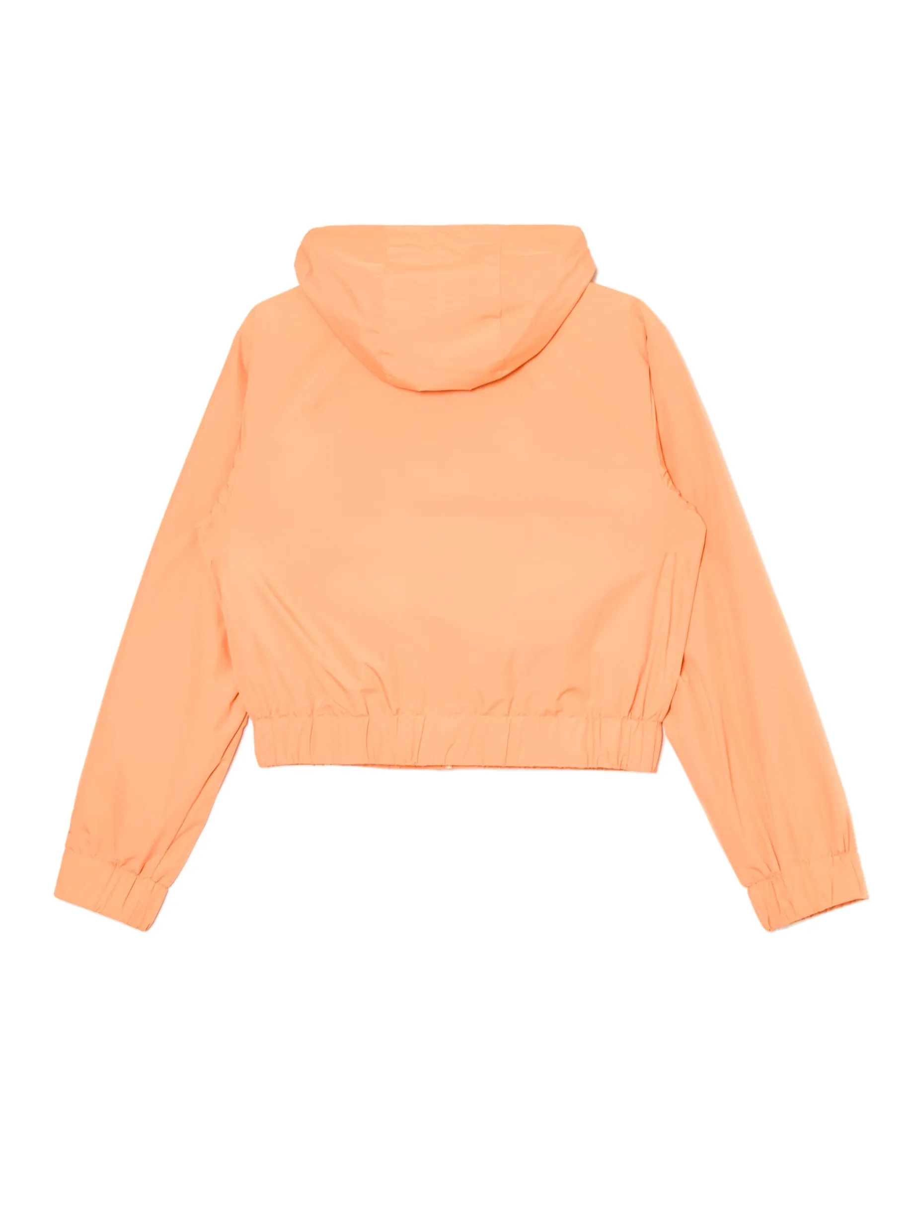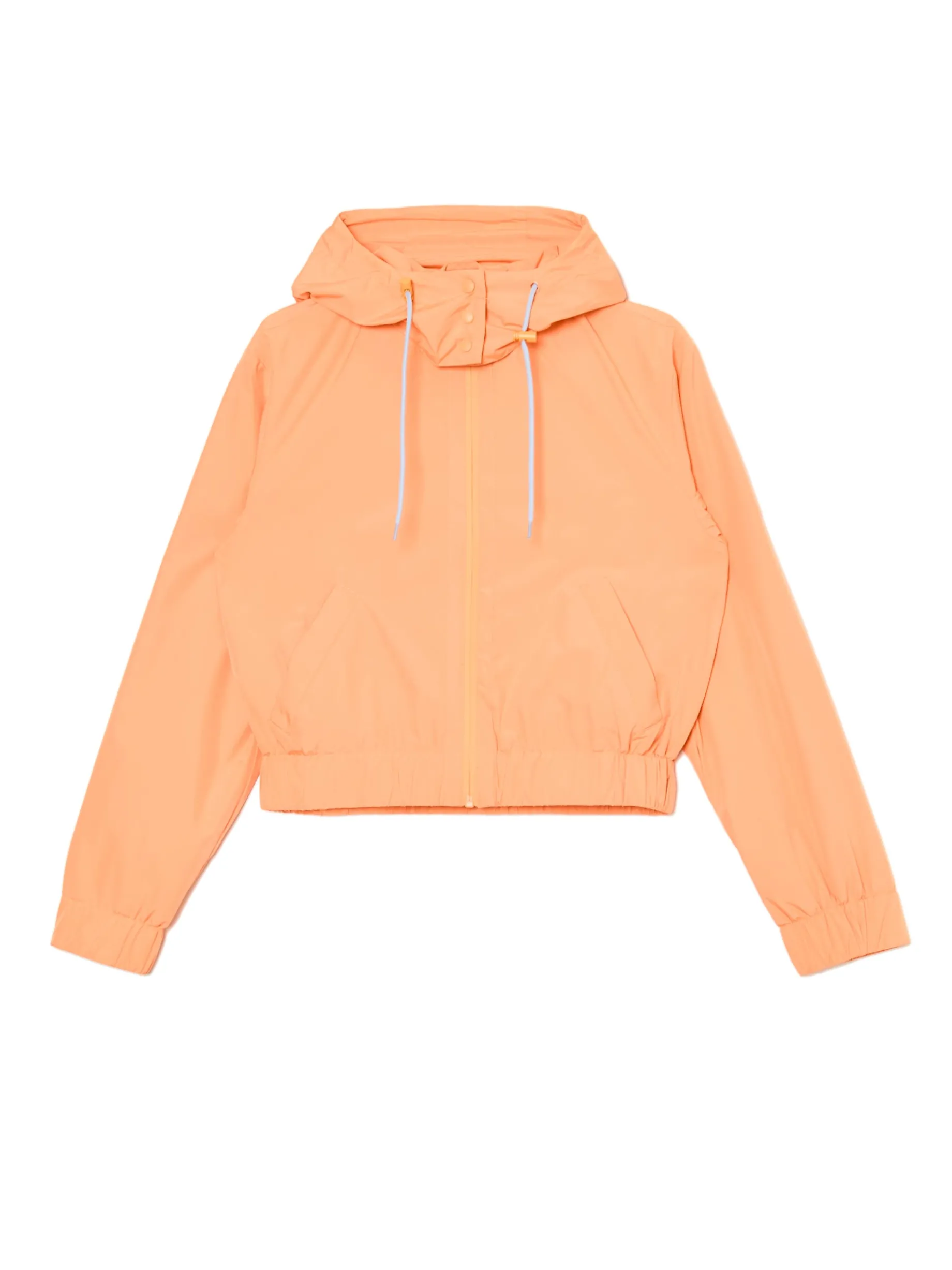 Damska kurtka, uszyta z gładkiej, lekkiej tkaniny w energetycznym pomarańczowym kolorze. regularny krój z przodu zapięcie na suwak kaptur regulowany sznurkami ze stoperami klapy kaptura zapinane na zatrzaski dolny brzeg i rękawy zakończone wszytą elastyczną gumką dwie kieszenie