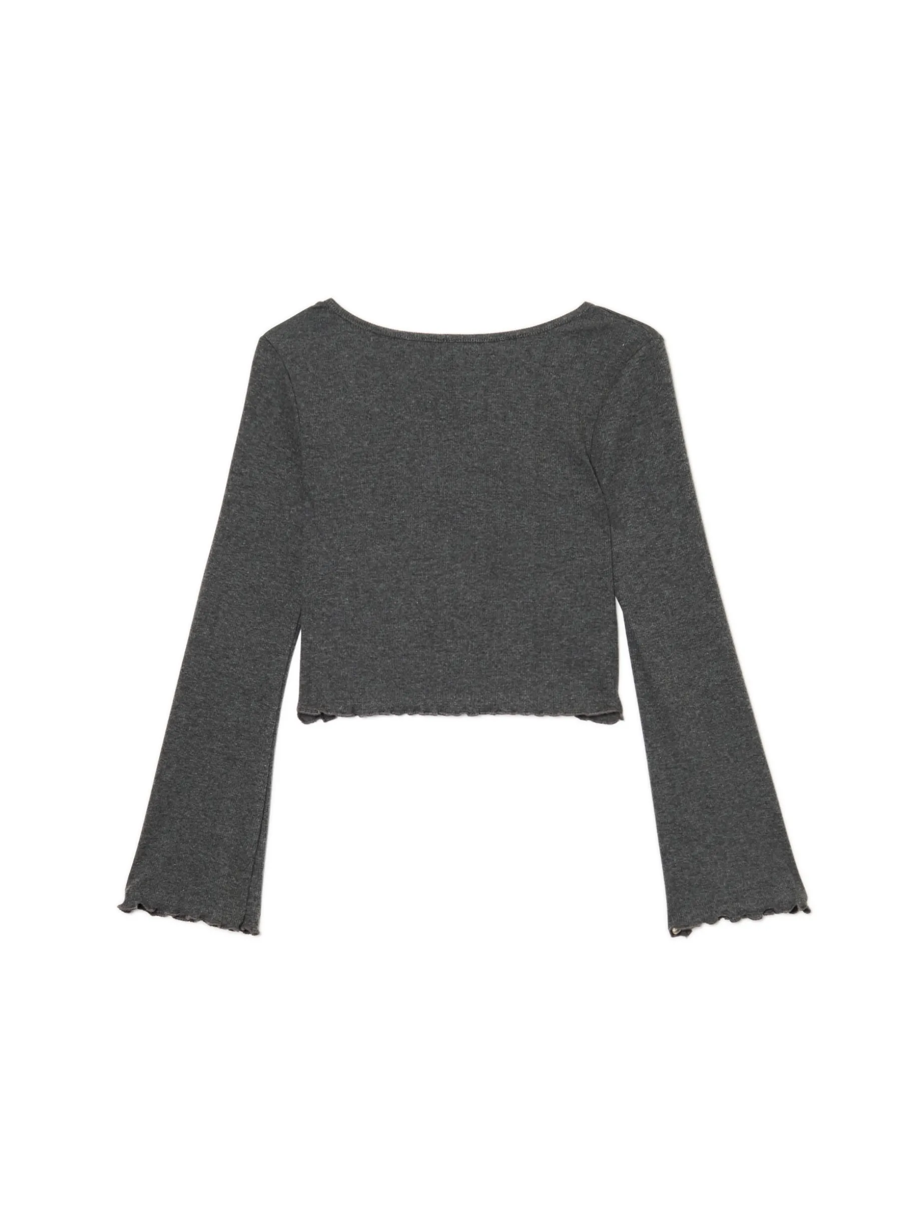 Koszulka damska z długimi rękawami uszyta z mieszanki dzianin z dodatkiem elastycznych włókien. Wyposażona w ozdobne falbanki przy brzegach, delikatnie rozkloszowane rękawy i głęboki dekolt. Idealny item na jesienny vibe! uszyta z prążkowanej dzianiny koszulka o krótszym, dopasowanym fasonie głęboki dekolt lekko rozszerzane rękawy dekoracyjne wykończenie brzegu