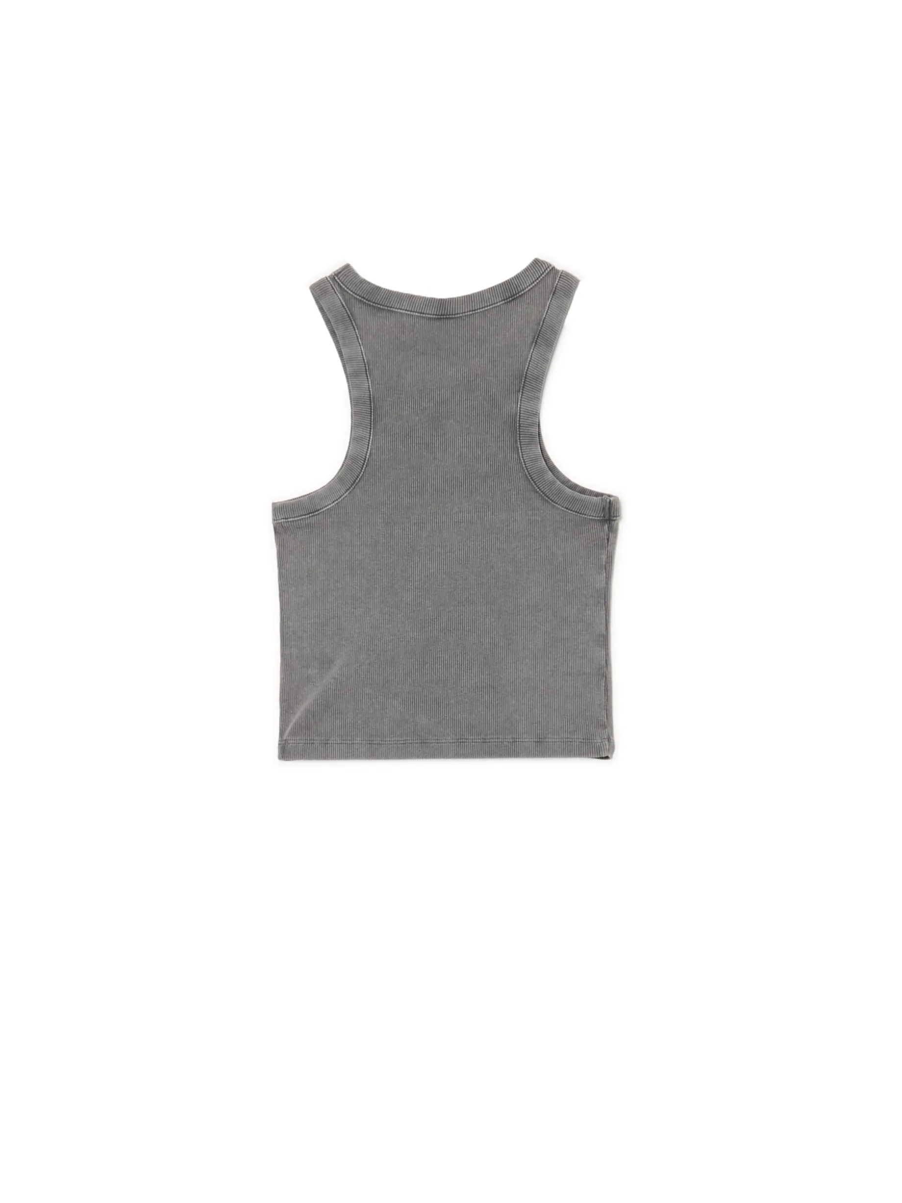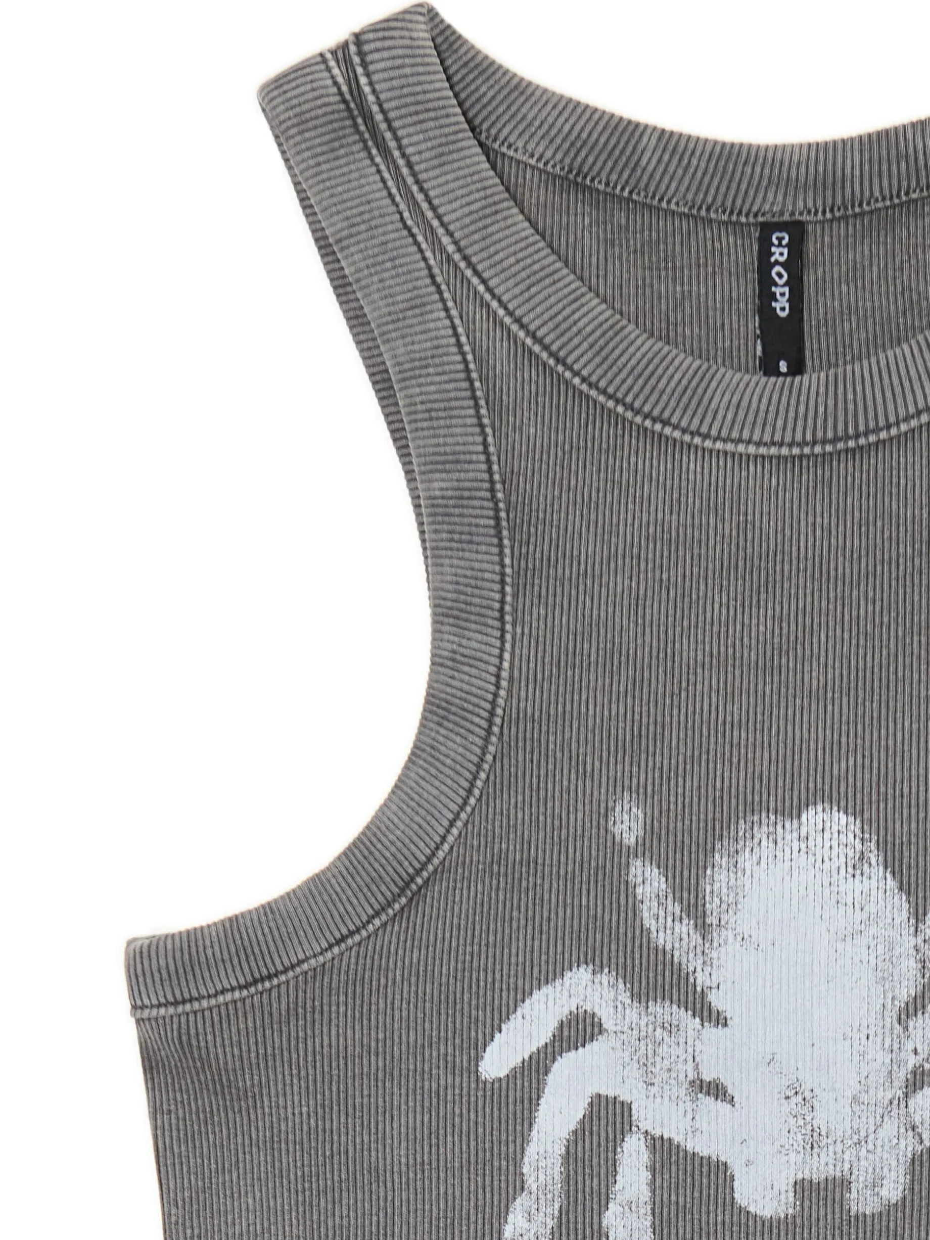 Szary damski top uszyty z mieszanki bawełny i elastycznych włókien. Na przodzie nadruk ze zwierzęcym motywem. uszyty z prążkowanej dzianiny dopasowany krój podkreślający sylwetkę na ramiączkach z przodu nadruk z motywem zwierzęcym