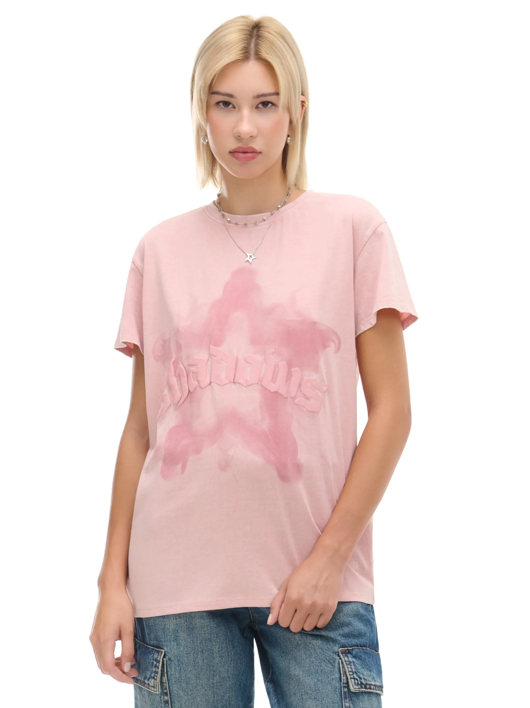 Damski t-shirt oversize, uszyty w 100% z bawełny. obszerny, luźny krój krótkie rękawy z przodu nadruk z motywem gwiazdy i wypukły puff print z napisem Wzrost modelki: 177 cm