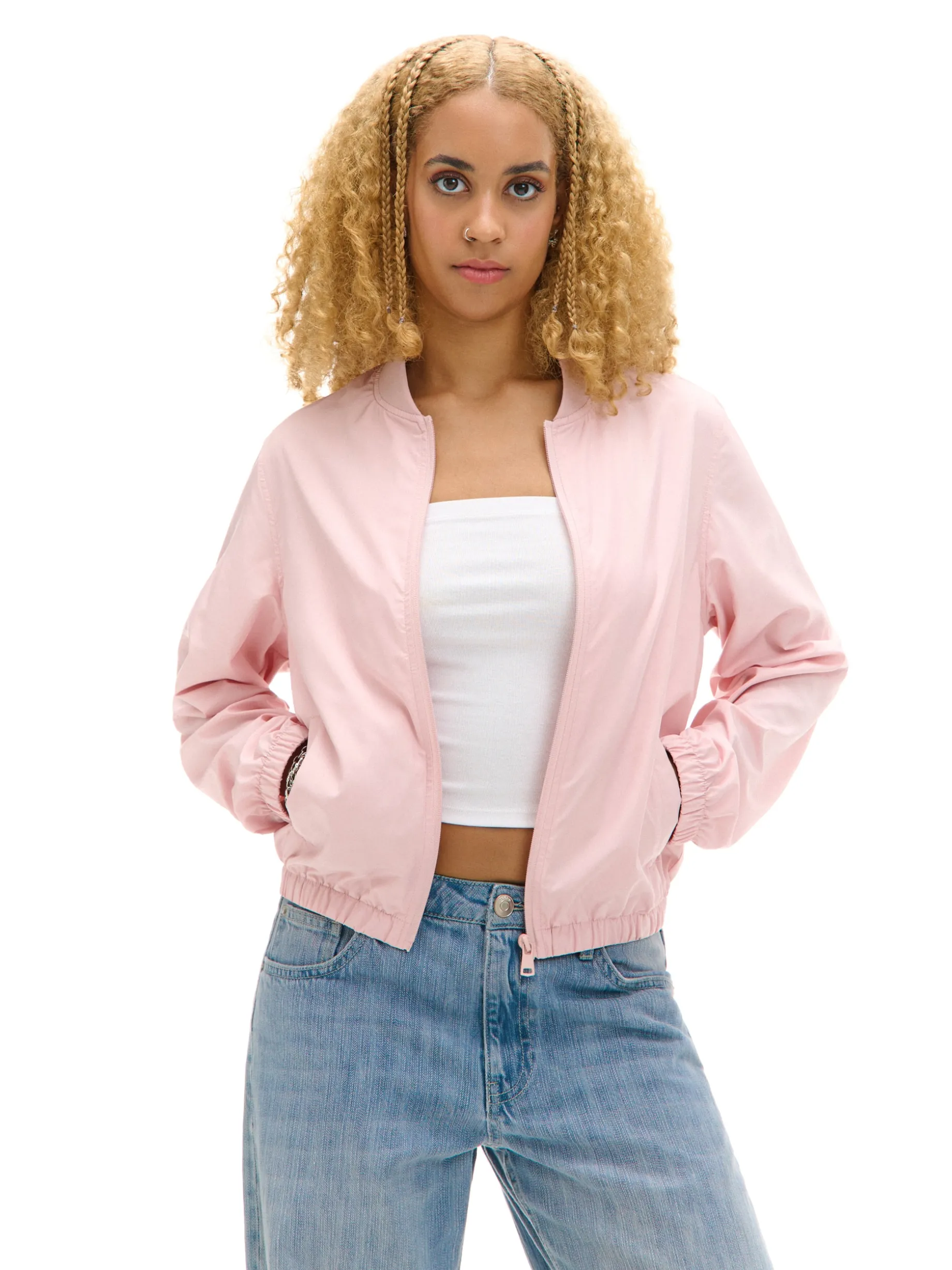 Jasnoróżowa kurtka damska o kroju bomber, uszyta z lekkiej, gładkiej tkaniny. klasyczny krój długie rękawy i dolny brzeg zakończone elastyczną gumką zapięcie na suwak dwie kieszenie dostępna w innych kolorach