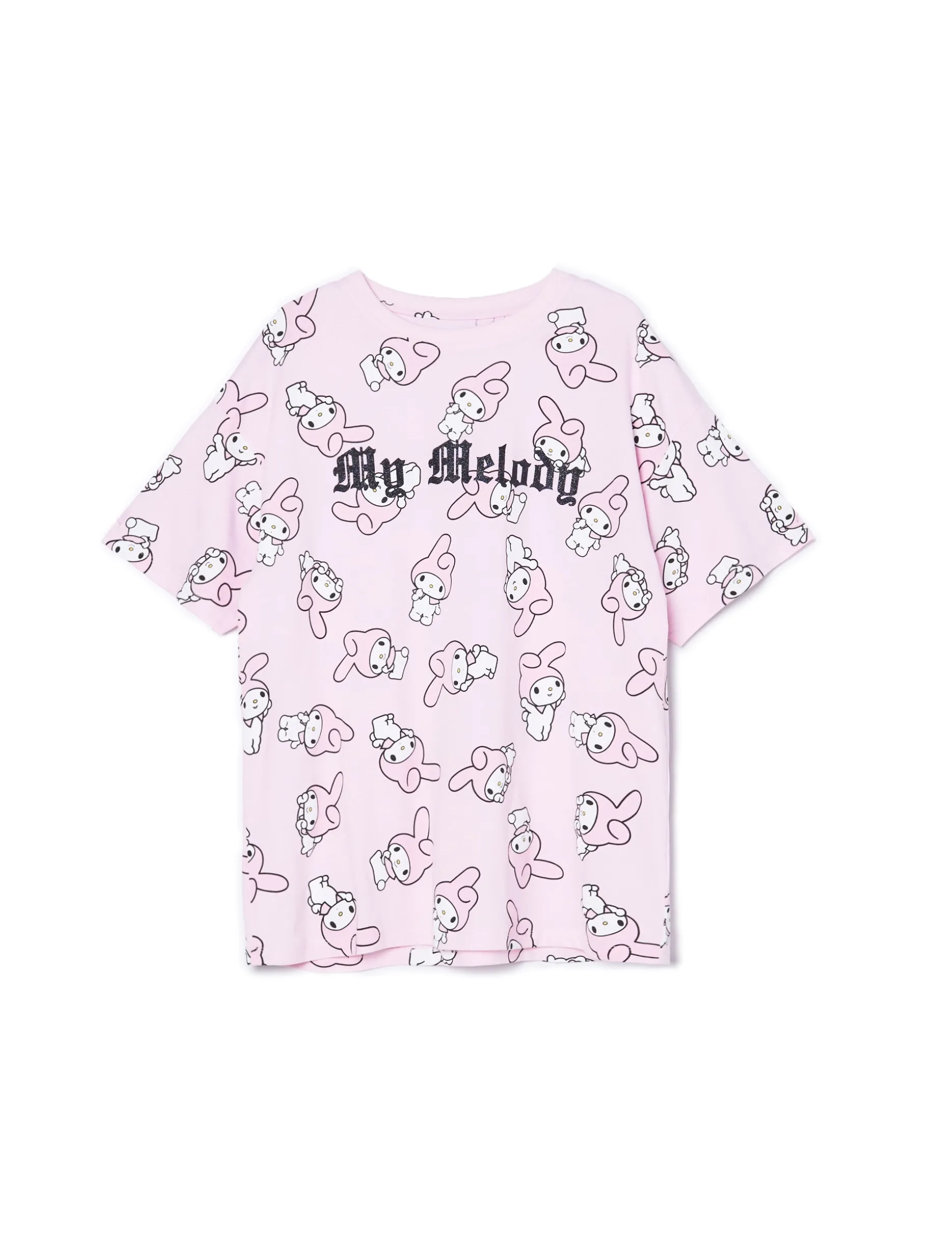Różowa damska koszulka, uszyta w 100% z bawełny. luźny krój oversize krótkie rękawy na całości nadruk z motywem My Melody Wzrost modelki: 172 cm © 2024 SANRIO CO., LTD.