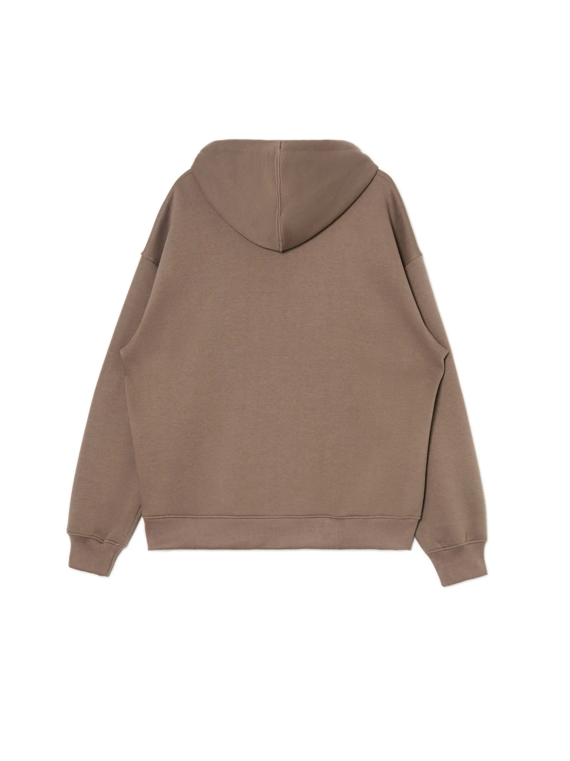 Damska bluza z kapturem, uszyta z gładkiej dzianiny. dzianina z dodatkiem miękkiej bawełny fleecy swobodny krój oversize kaptur regulowany sznurkiem zapięcie na suwak dół i rękawy wykończone ściągaczem dwie kieszenie boczne Wzrost modelki: 177 cm