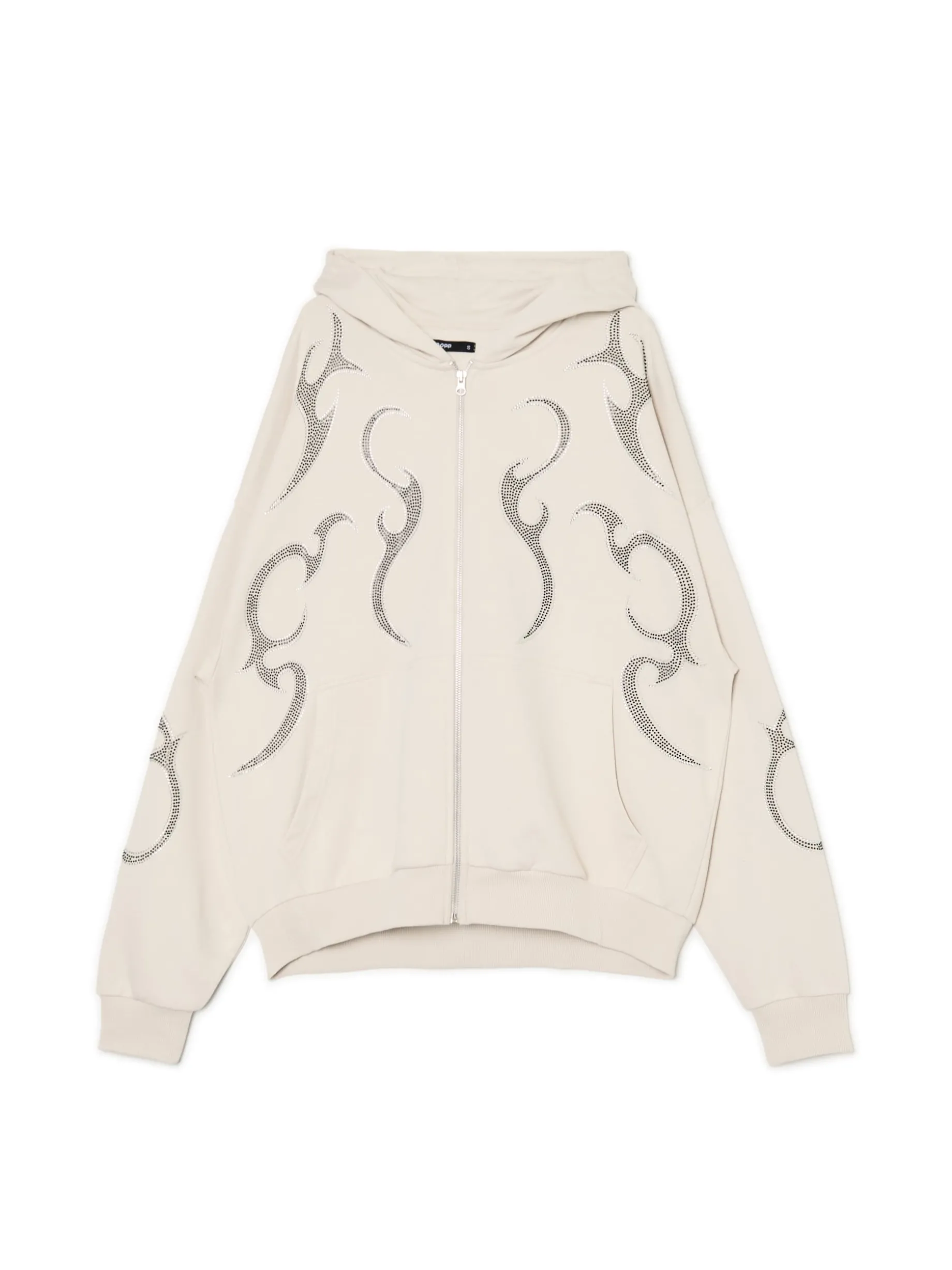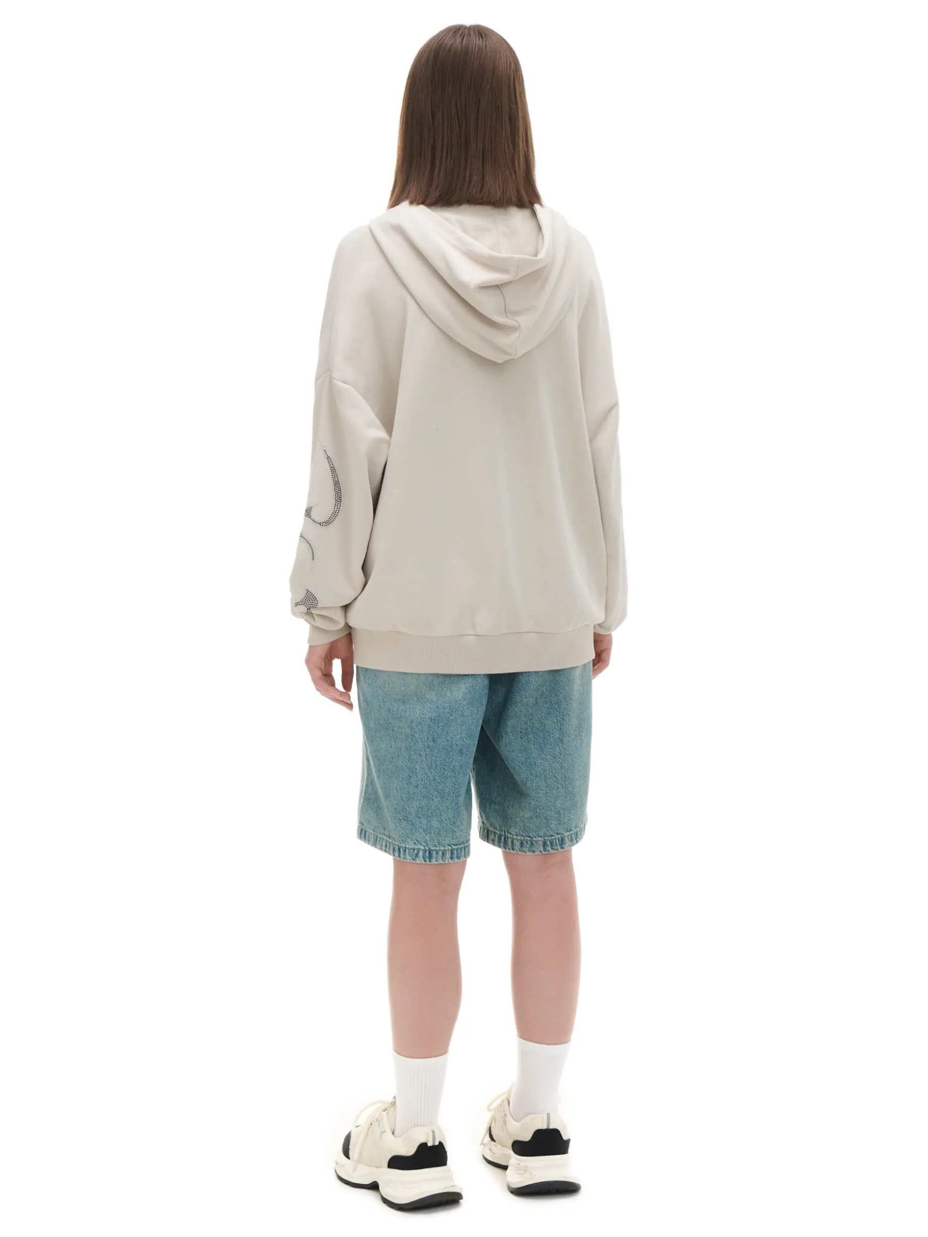 Bluza damska typu hoodie, uszyta z dzianiny z dodatkiem miękkiej bawełny french terry. Ozdobne cekinowe aplikacje to oryginalne wykończenie tego modelu. dzianinowy materiał z bawełną swobodny, luźny krój zapięcie na metalowy zamek miękki kaptur dół i mankiety wykończone ściągaczami otwarte kieszenie po bokach ozdobna aplikacja z przodu i na rękawach Wzrost modelki: 172 cm