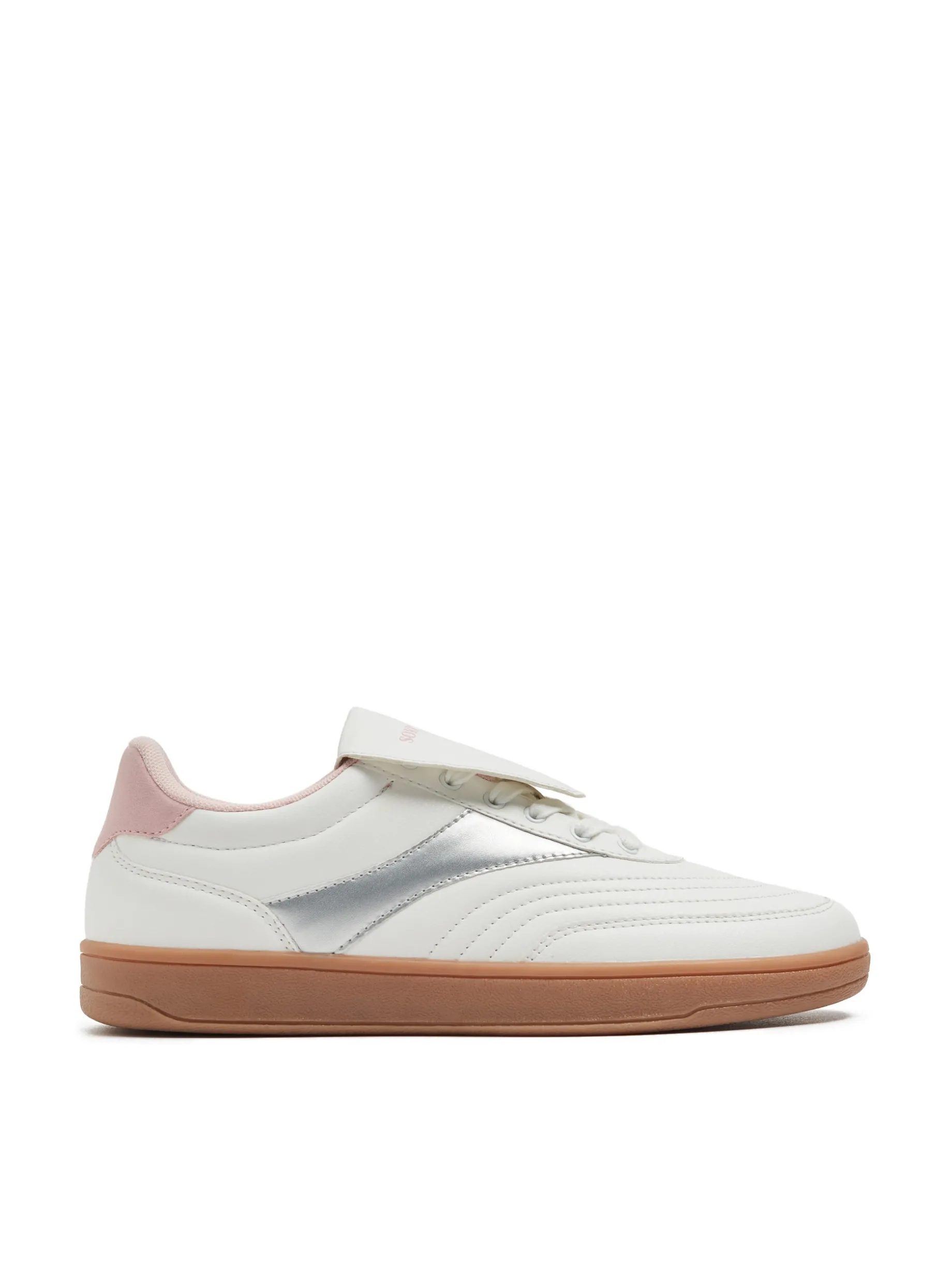 Klasyczne damskie buty typu sneakersy o sportowym fasonie z wyróżniającą się naszywką i wstawkami. Nie spóźnij się i wrzuć je do koszyka! trwały materiał wykonany m. in. z bawełny i syntetycznej gumy sportowy fason płaska, solidna podeszwa wiązane na płaskie sznurówki nakładka z nadrukiem ozdobne wstawki w kolorze srebrnym i różowym