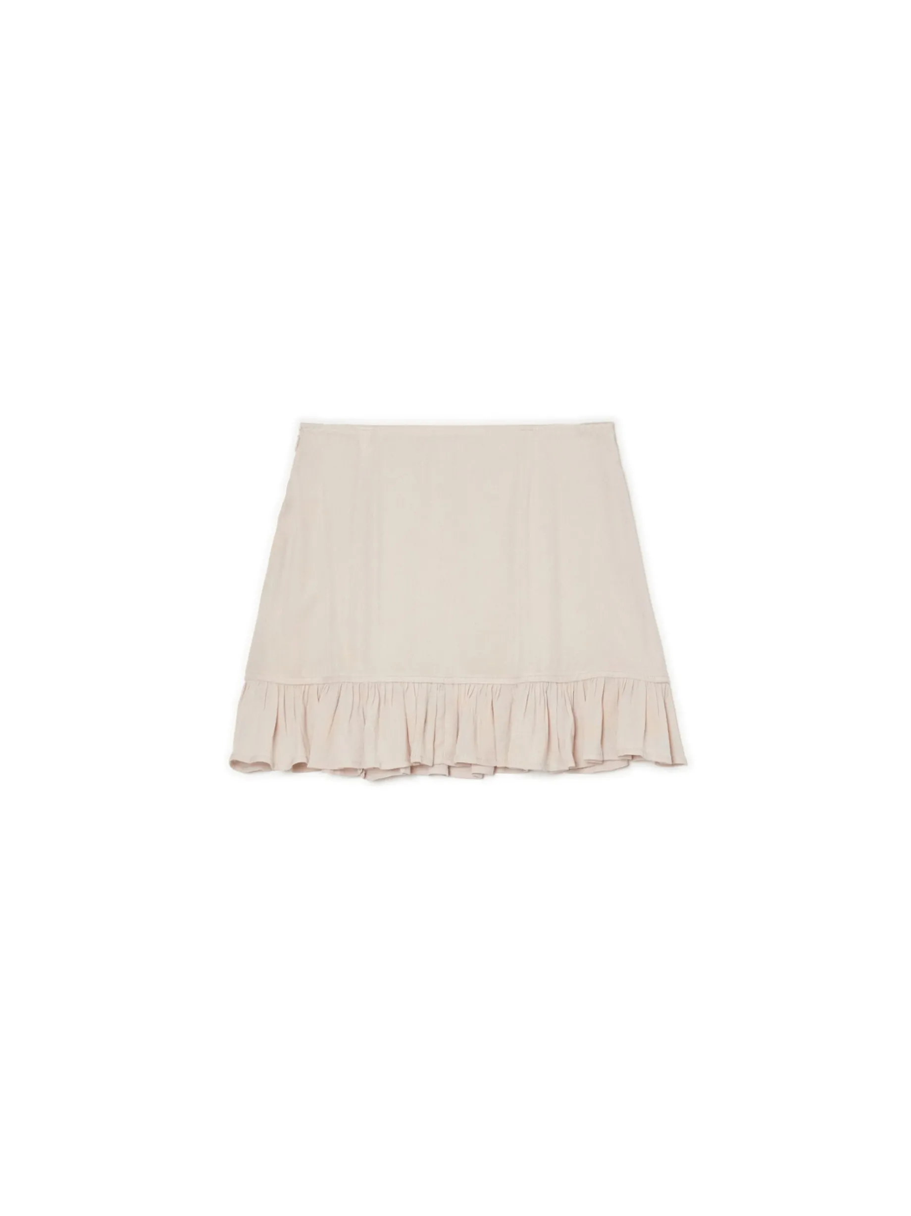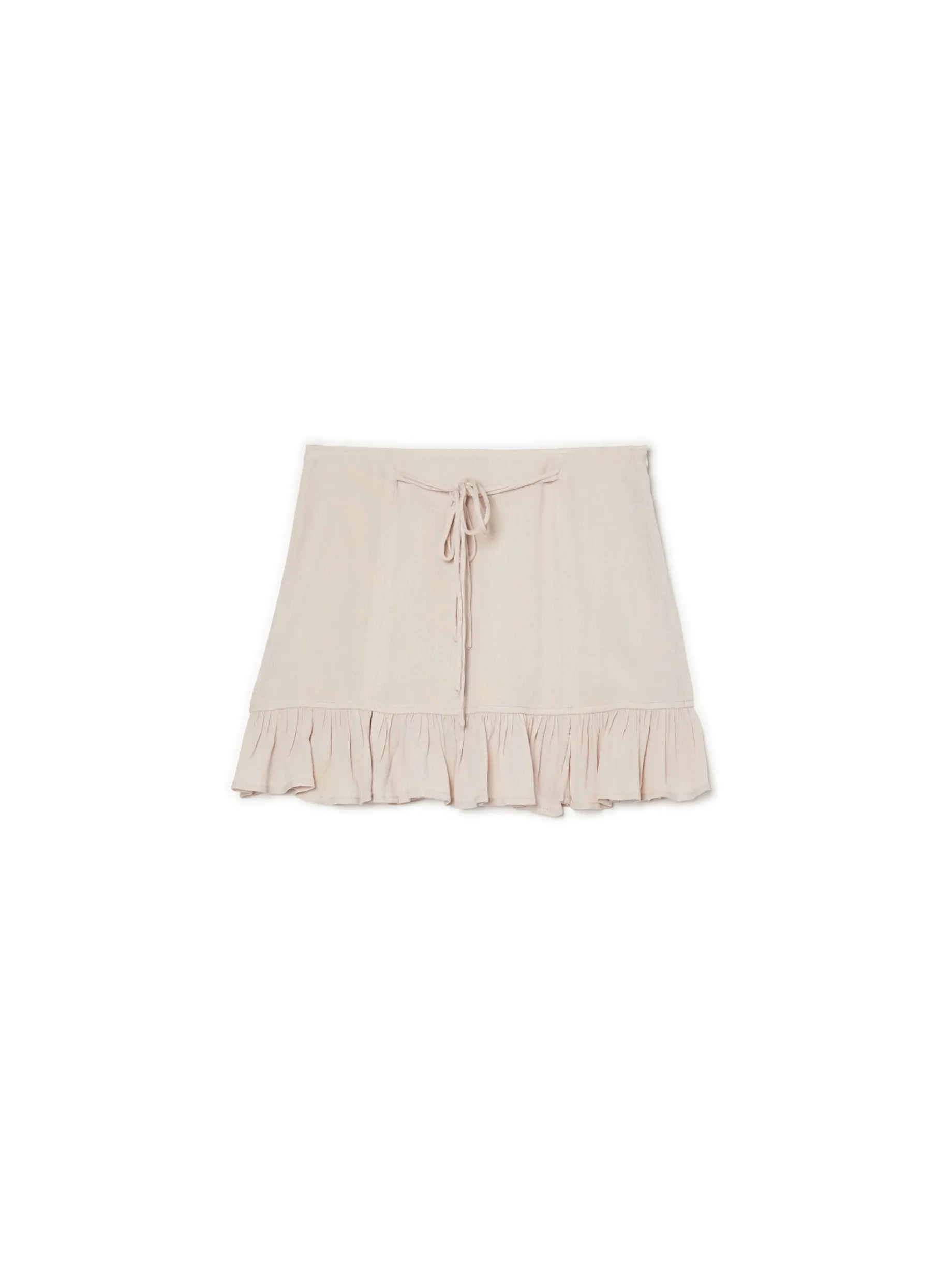 Damska spódniczka o długości mini, uszyta z tkaniny. Z przodu ozdobne wiązanie, z boku zapięcie na kryty zamek, dół wykończony falbanką. Spódnica dostępna w innej wersji kolorystycznej.