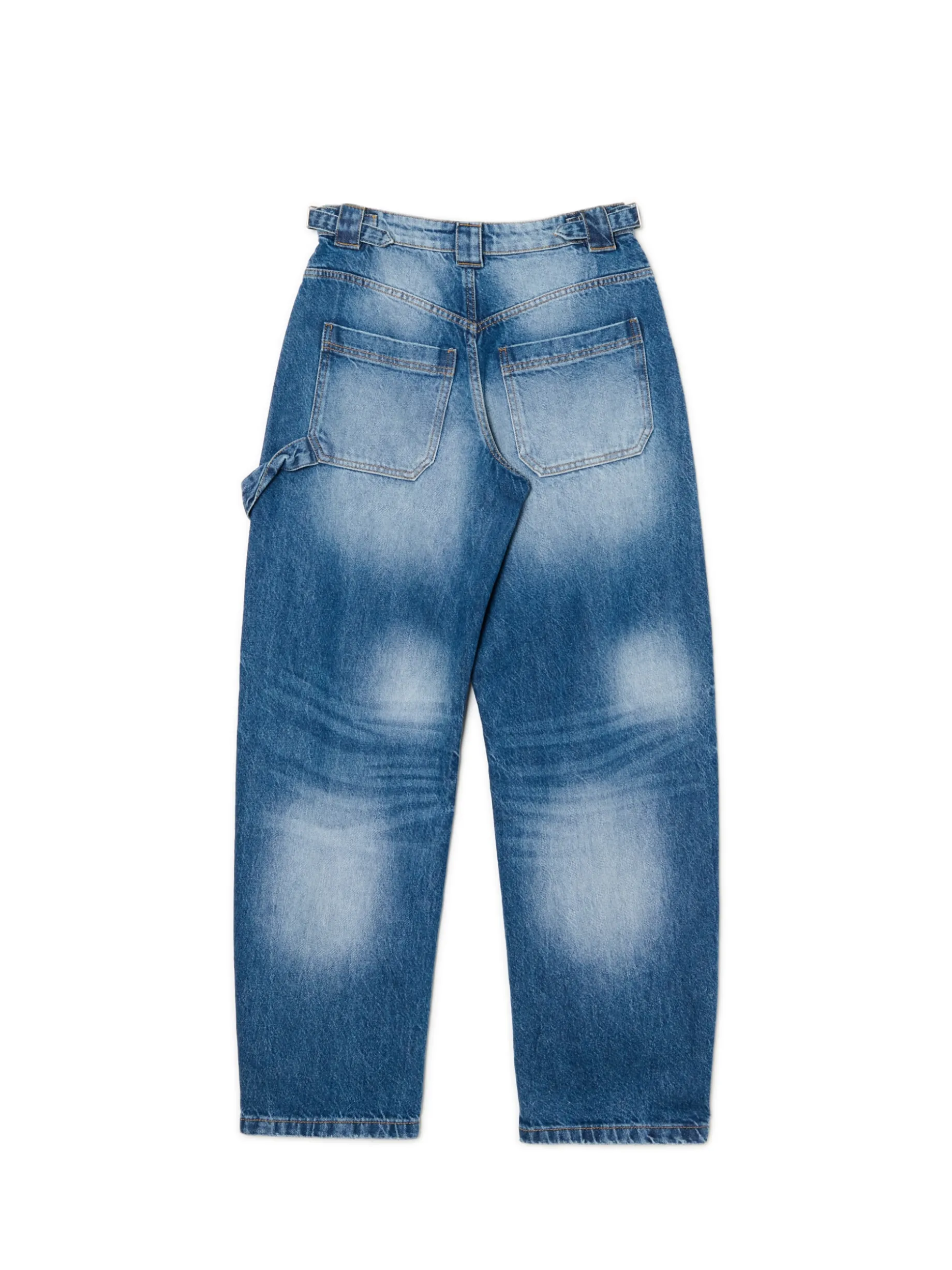 Damskie spodnie jeansowe z wysokim stanem o kroju skater, uszyte z bawełny. Ozdobą tego itemu są paski z metalowymi klamrami i efekt sprania na całości. 100% bawełny swobodny, luźny krój wysoki stan, zapięcie na zamek i guzik pięć kieszeni hammer loop na lewej nogawce dwa wąskie, regulowane paski delikatny efekt sprania Wzrost modelki: 177 cm