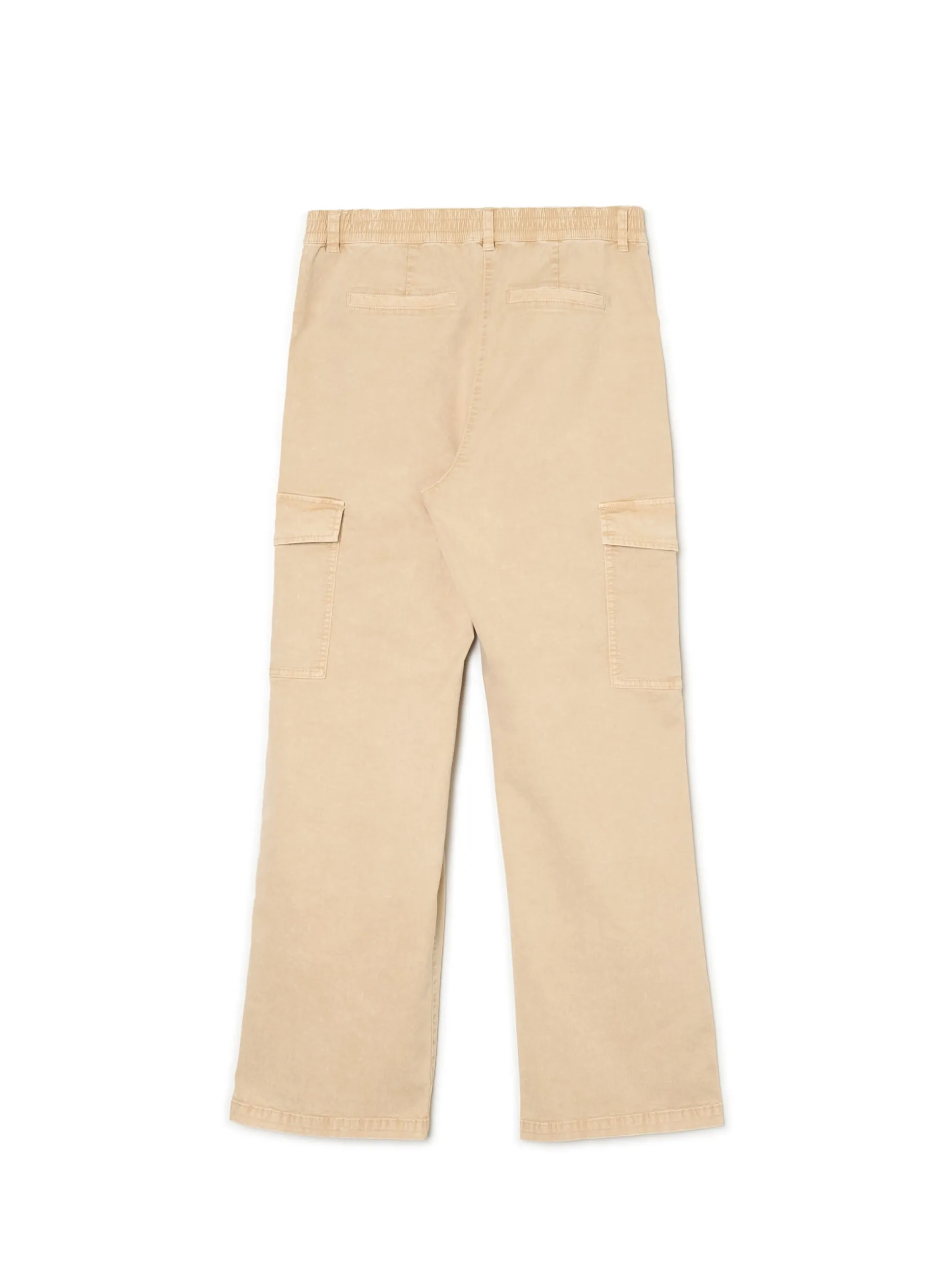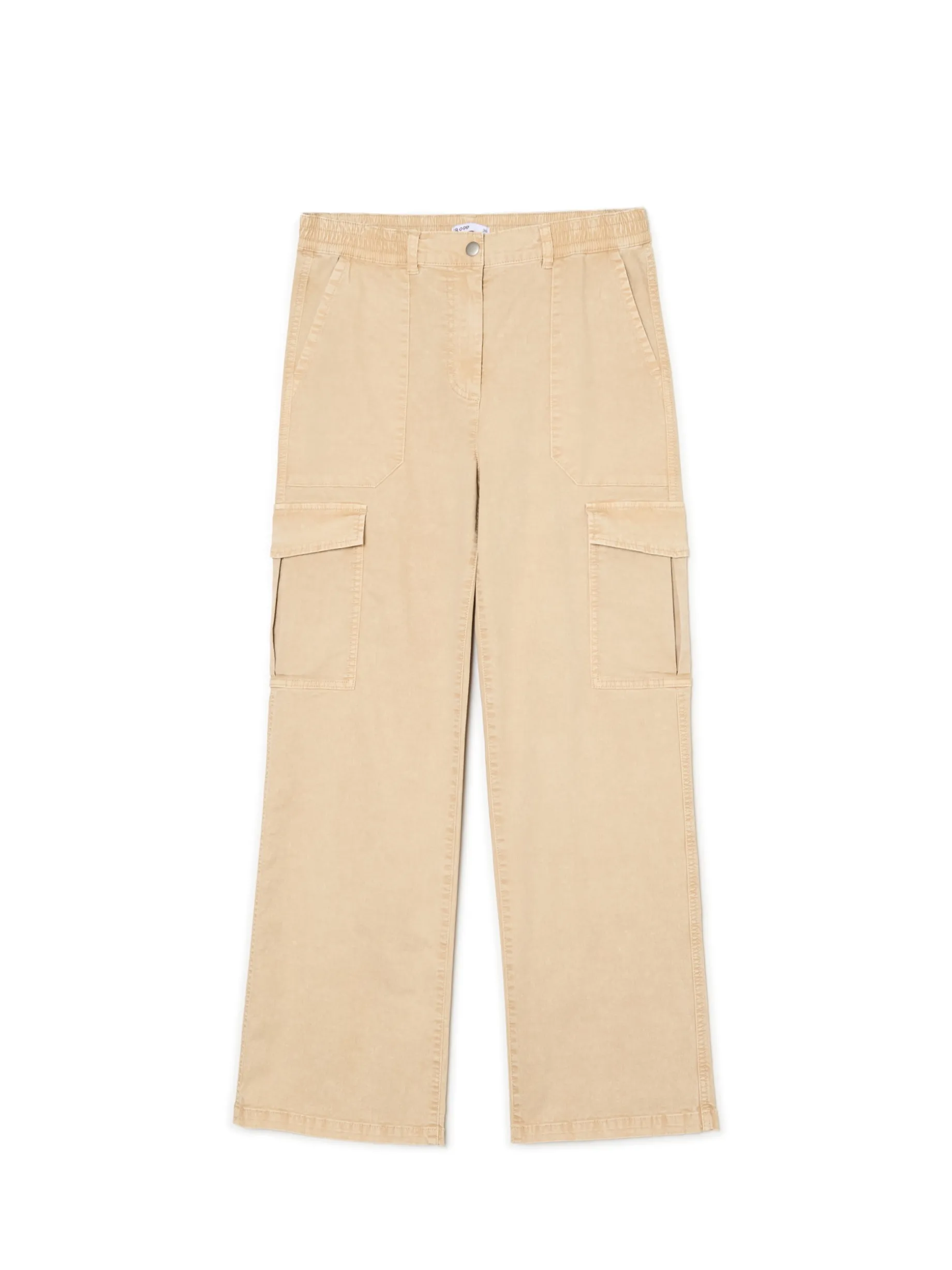 Kremowe damskie spodnie, uszyte w 100% z bawełnianej tkaniny. regularny stan zapięcie na zatrzask i zamek elastyczna gumka w pasie prosta nogawka imitacja kieszeni z tyłu 4 kieszenie, w tym kieszenie cargo szlufki na pasek
