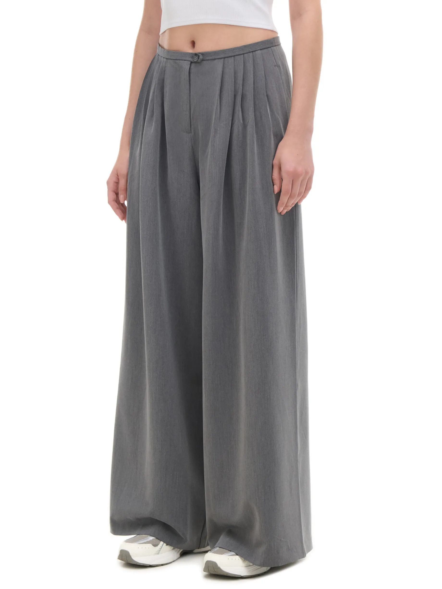 Spodnie damskie z szerokimi nogawkami, uszyte z mocnej tkaniny typu twill z dodatkiem wiskozy i elastycznych włókien. FItuje zarówno z białą koszulą, jak i bardziej casualowymi stylizacjami. spodnie o fasonie tailoring zapięcie na suwak i guzik wewnątrz dodatkowy, ukryty guzik dwie kieszenie po bokach ozdobne marszczenia z przodu zakładki modelujące z tyłu