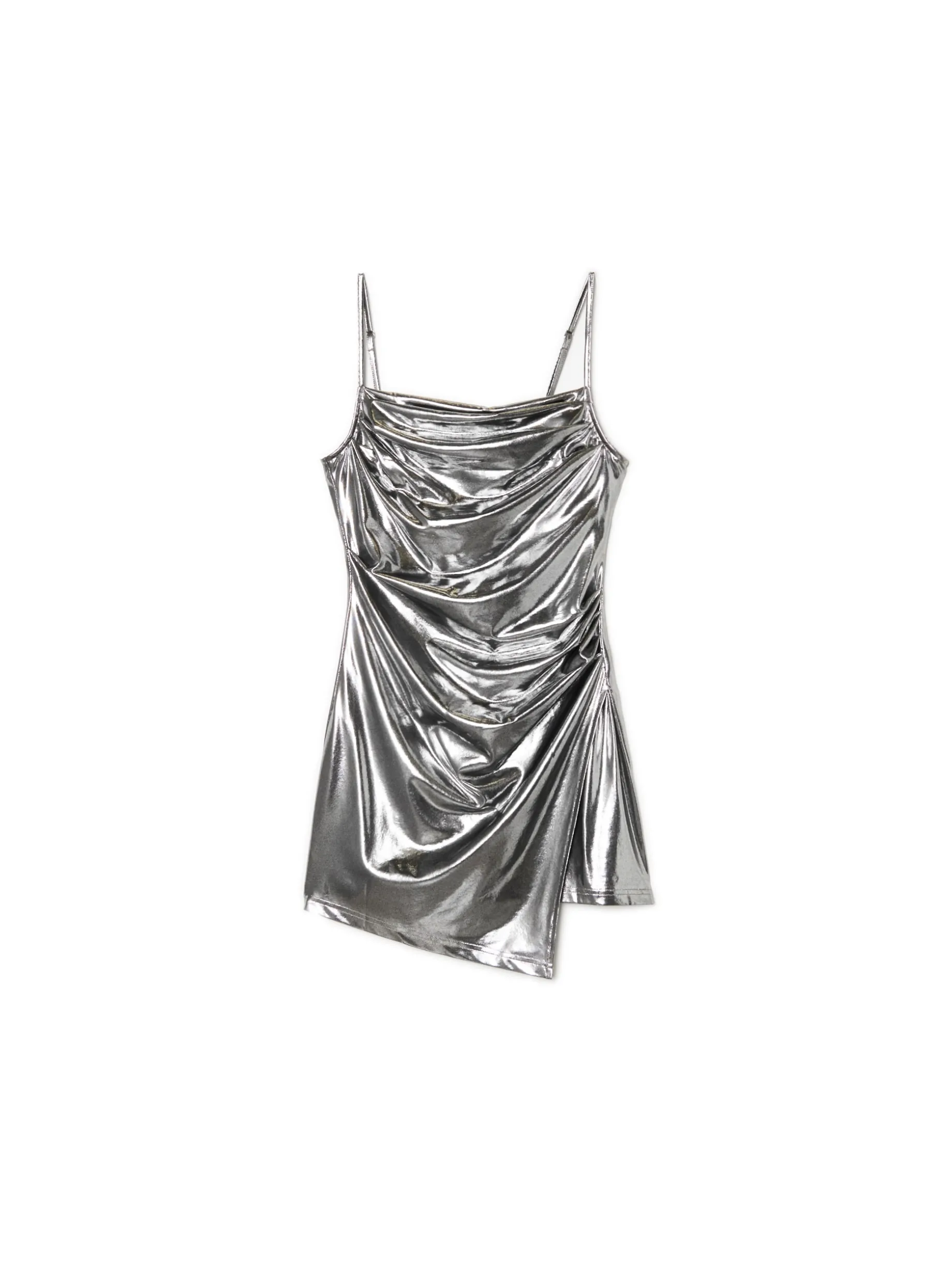 Damska sukienka mini na specjalne okazje! Uszyta z mieszanki dzianin w kolorze srebrnym. Wyposażona w wąskie, regulowane ramiączka, dekoracyjne marszczenia i zawijany dół. Sztosowy item na sylwestra lub spontany z ekipą. dzianina z domieszką elastycznych włókien dopasowany krój podkreślający sylwetkę długość mini dekolt w szpic wąskie ramiączka z regulacją długości ozdobne marszczenia dekoracyjna zakładka z przodu