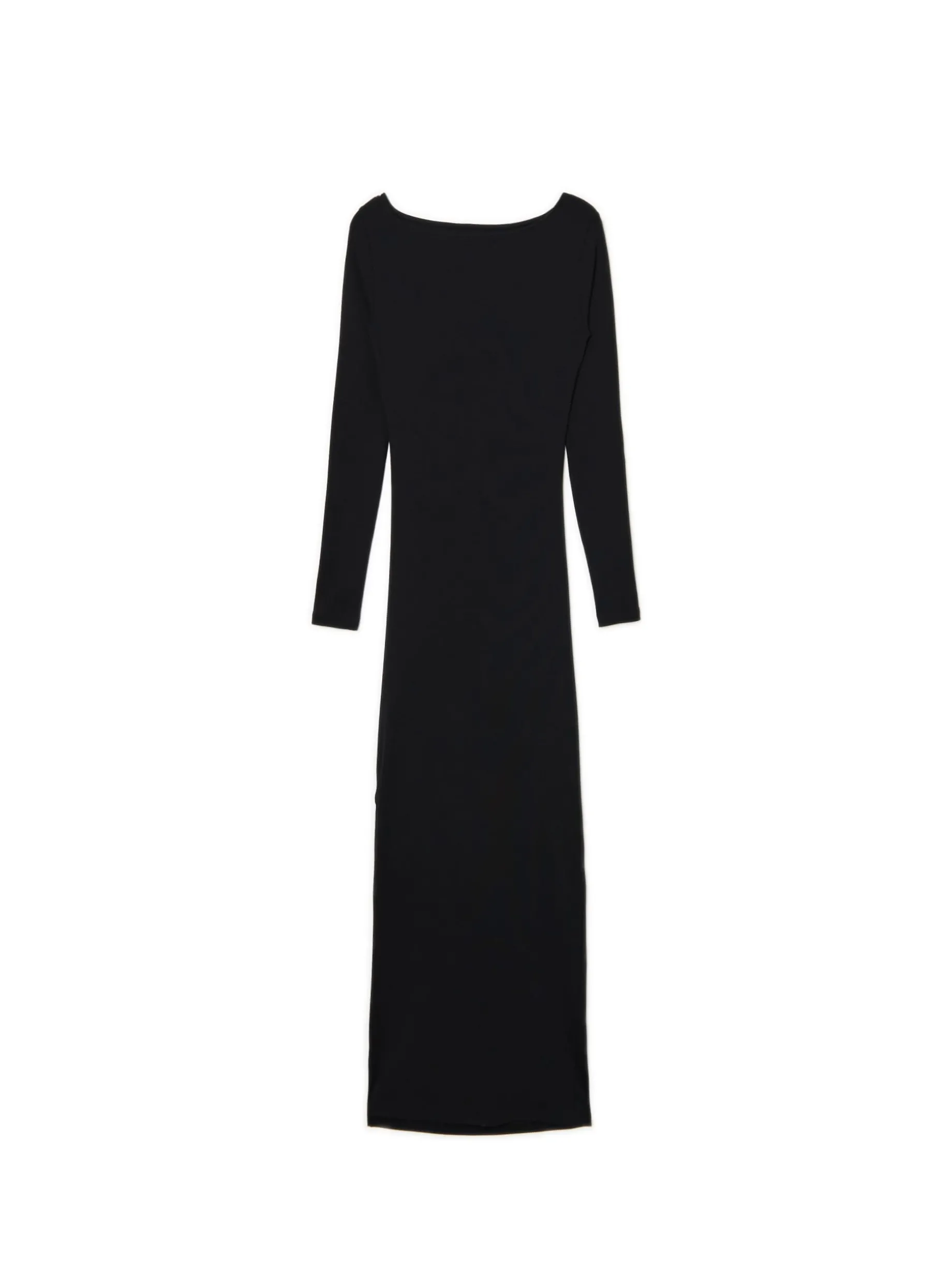 Damska sukienka idealna do pracy, na miasto czy domówkę. Długi, dopasowany krój oraz rękawy podkreślą Twoją unikatową sylwetkę. A ten klasyczny, czarny kolor fituje z nawet najbardziej zaskakującą biżuterią. bawełna z dodatkiem elastycznych włókien długość maxi dopasowany krój podkreślający sylwetkę dekolt w łódkę długie, dopasowane rękawy ozdobne marszczenia rozcięcie z boku