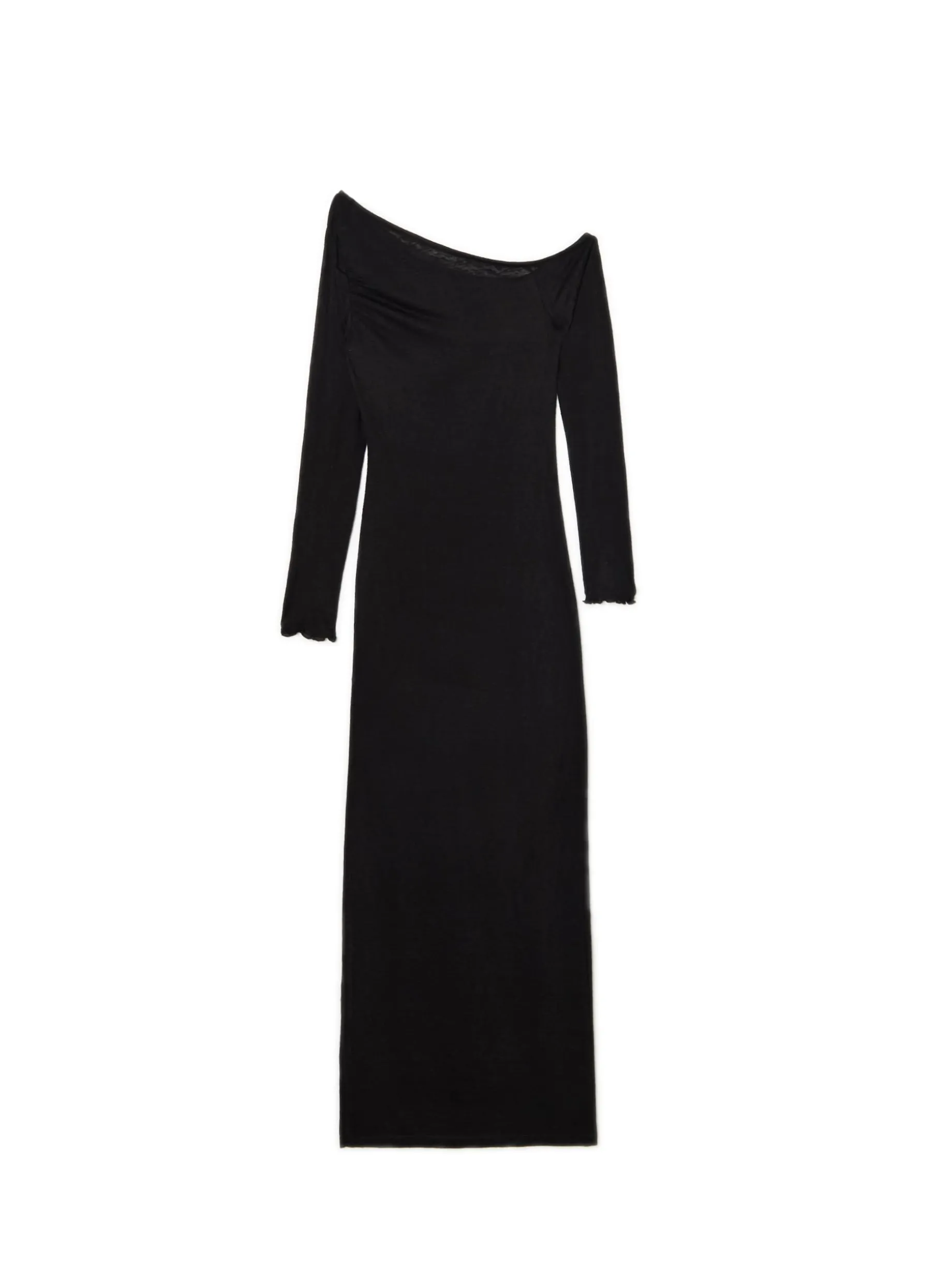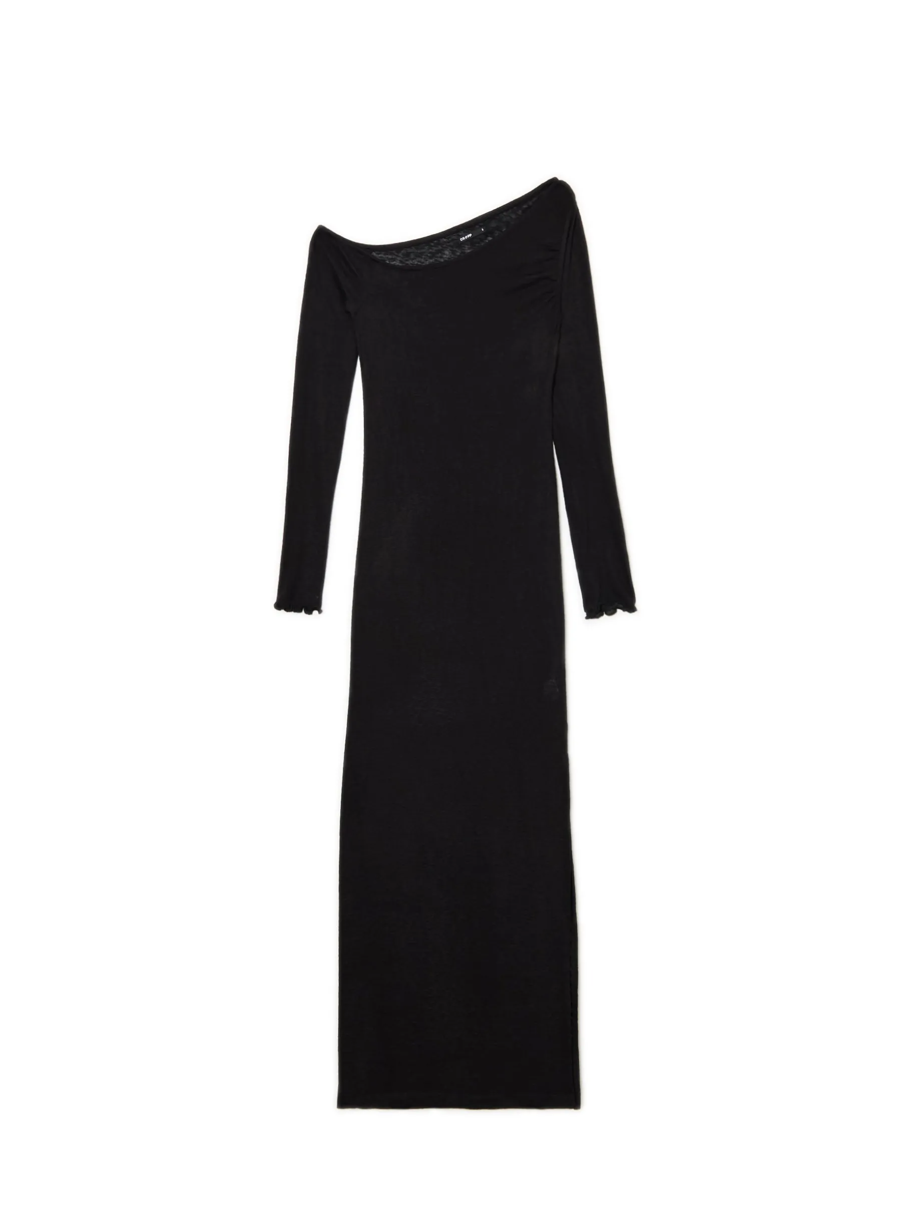 Damska sukienka o długości maxi, uszyta z lekkiej tkaniny. Efektowny dekolt i dopasowany fason zrobią wrażenie na innych! lekki materiał długość maxi i dopasowany krój długie, dopasowane rękawy nieregularny dekolt z odkrytym ramieniem ozdobne marszczenia rozcięcie z boku