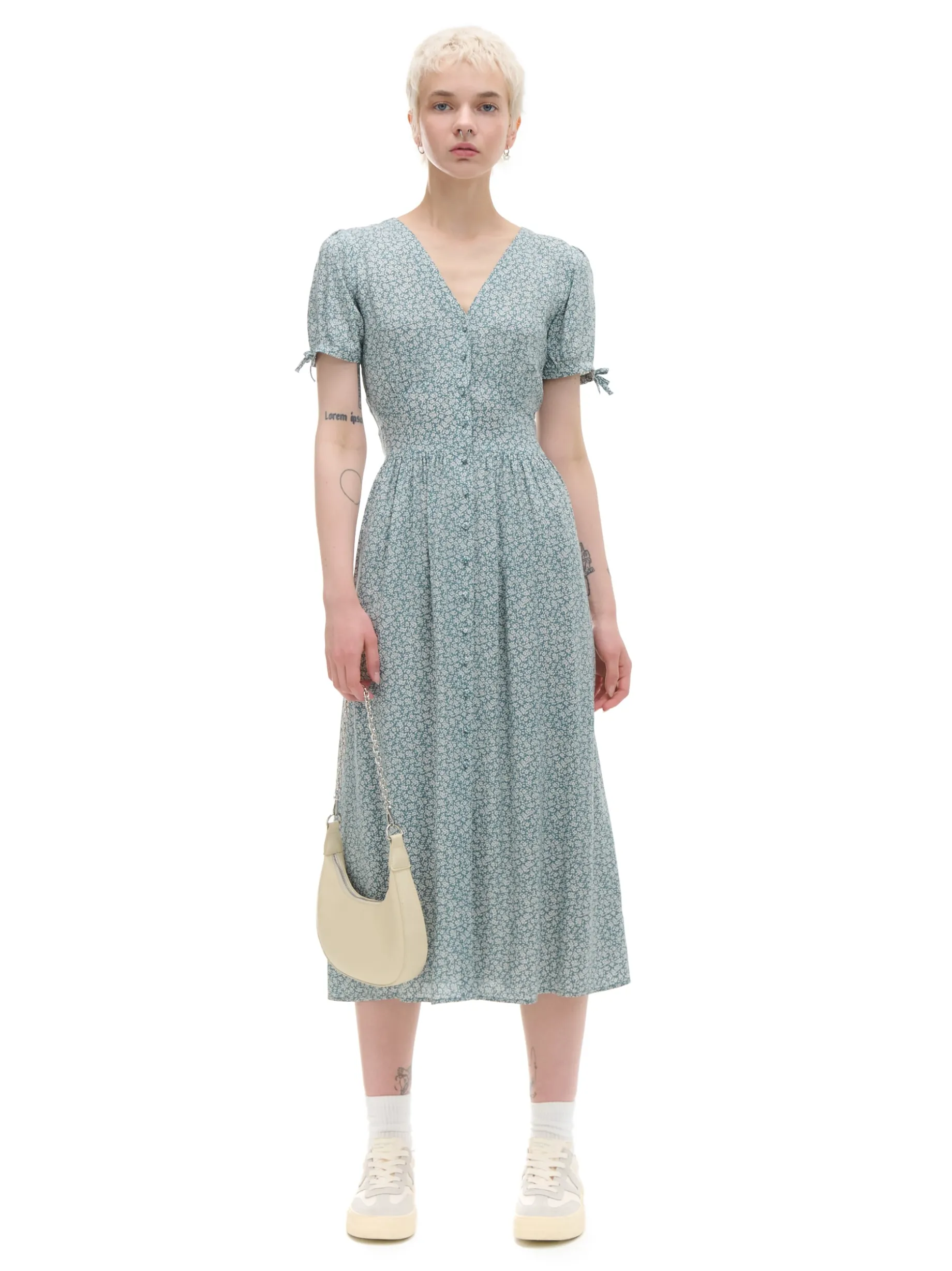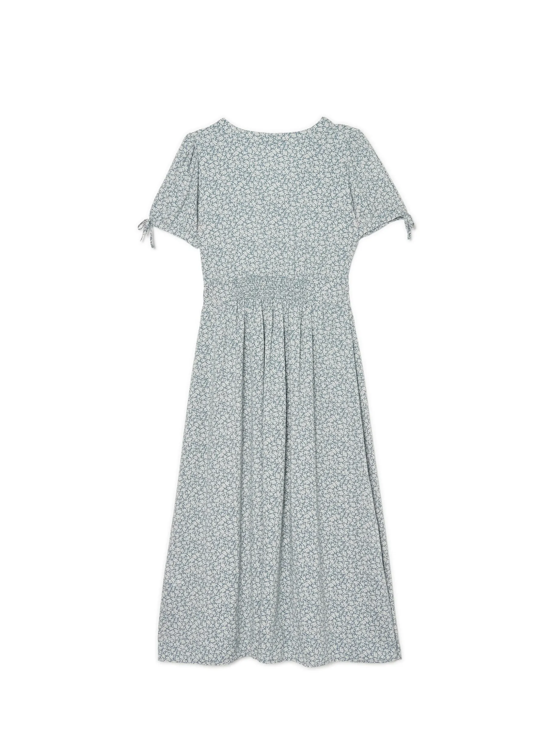 Sukienka damska o długości midi, uszyta z wiskozowej tkaniny. dekolt w kształcie litery V krótkie rękawy z ozdobnym wykończeniem zapięcie na guziki elastyczna gumka w pasie wzór w kwiaty na całości dostępne inne warianty kolorystyczne