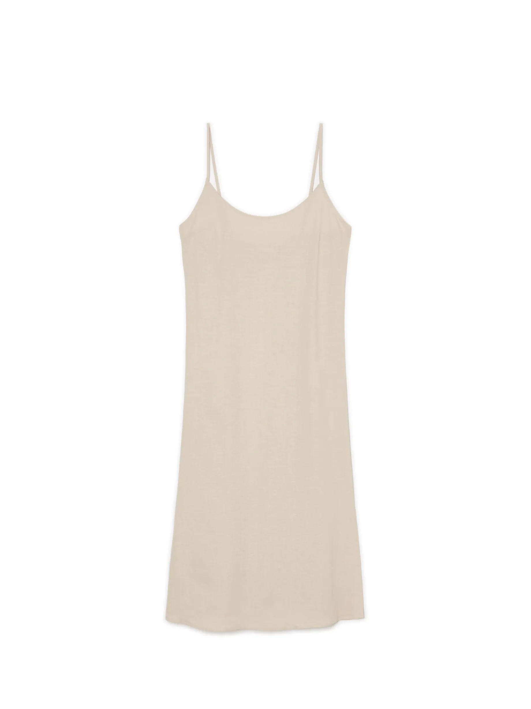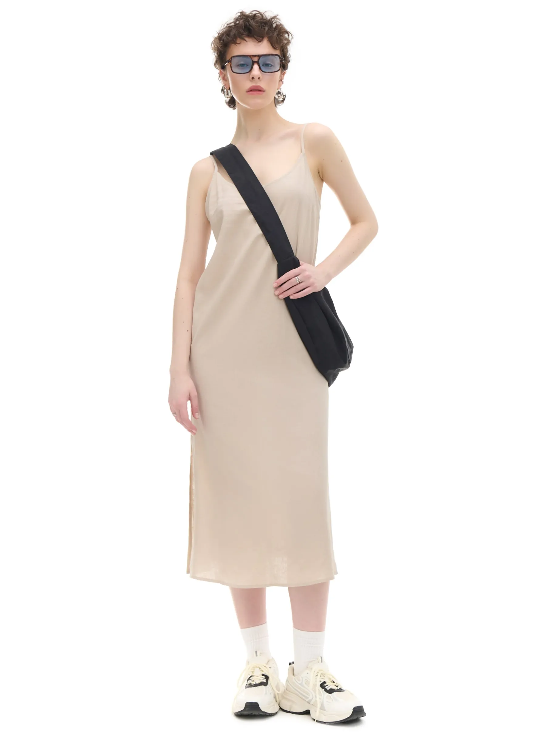 Zwiewna damska sukienka midi w kremowym odcieniu uszyta z mieszanki wiskozy i lnu. Regulowane cienkie ramiączka, rozcięcia po bokach i luźny krój stawiają ją na topce letnich stylizacji. lekki materiał z wiskozą długość midi swobodny, luźny krój wąskie ramiączka z regulacją długości delikatne rozcięcia po bokach Wzrost modelki: 176 cm