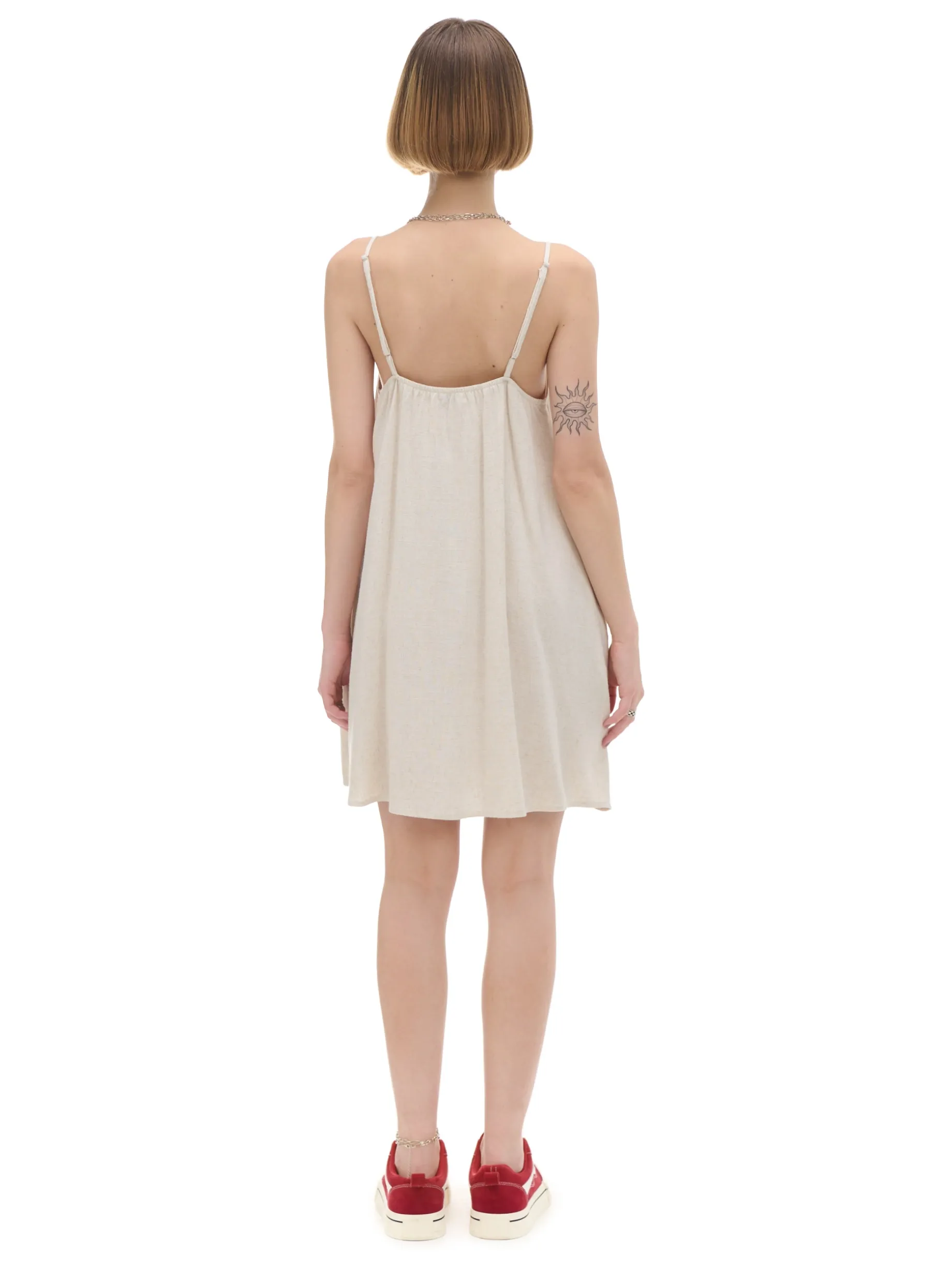 Luźna sukienka na ramiączkach o długości mini uszyta z mieszanki wiskozy i lnu. Idealna w letnie dni! lekki materiał z wiskozą swobodny, luźny krój długość mini wąskie ramiączka z regulacją długości
