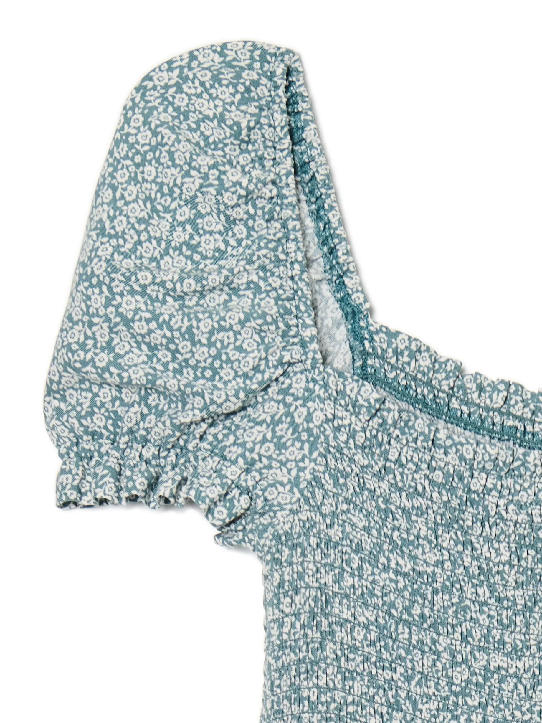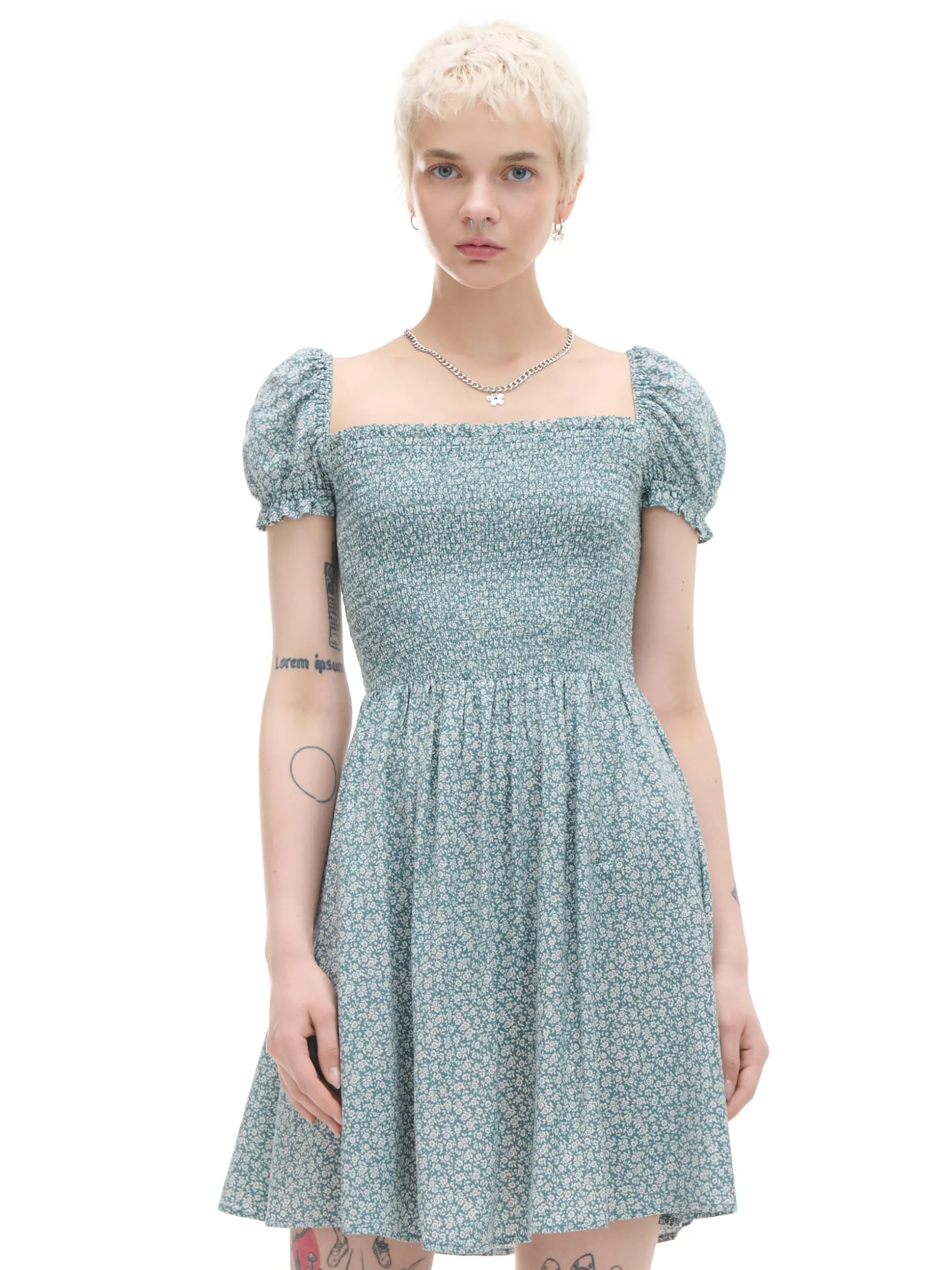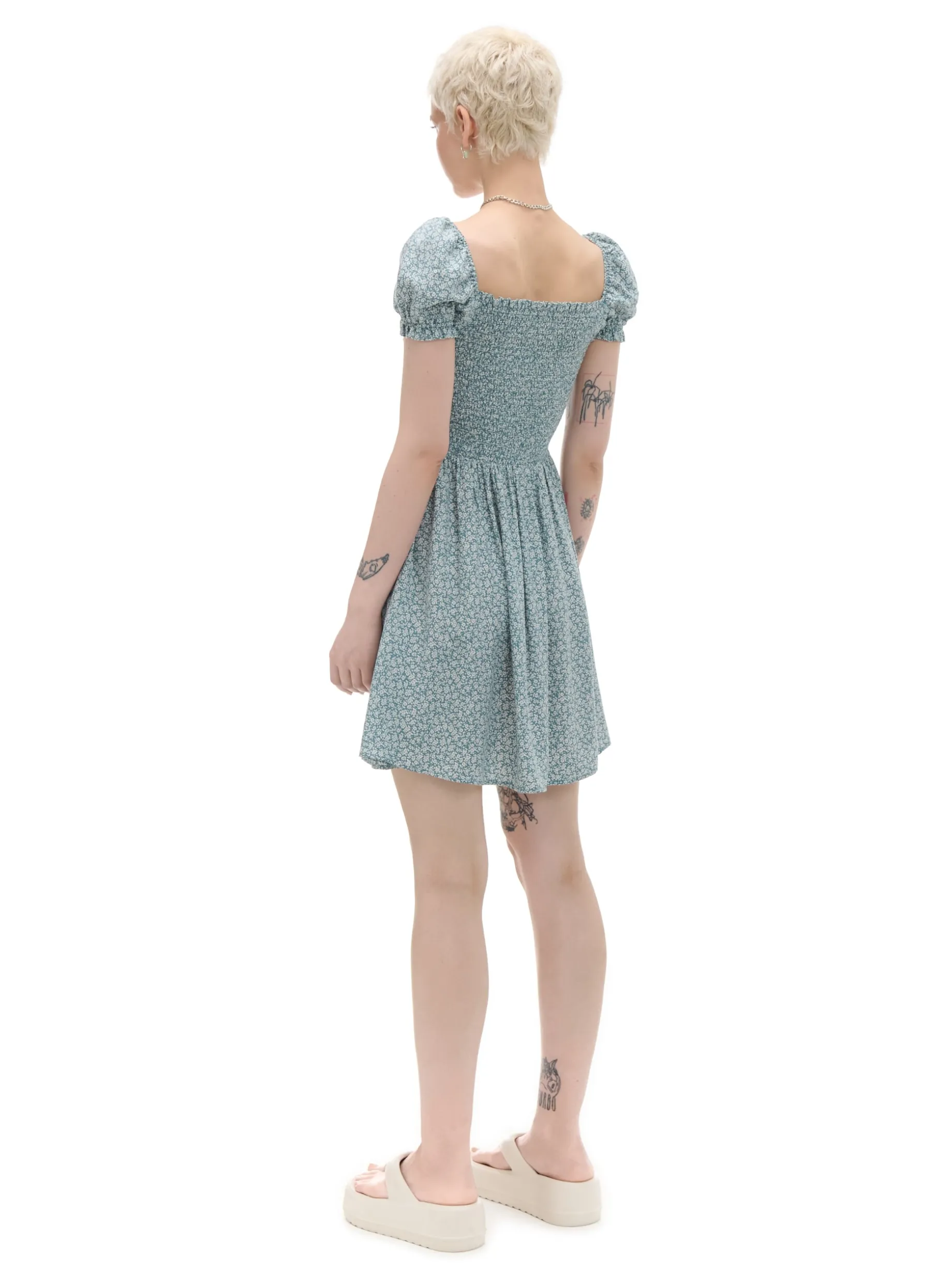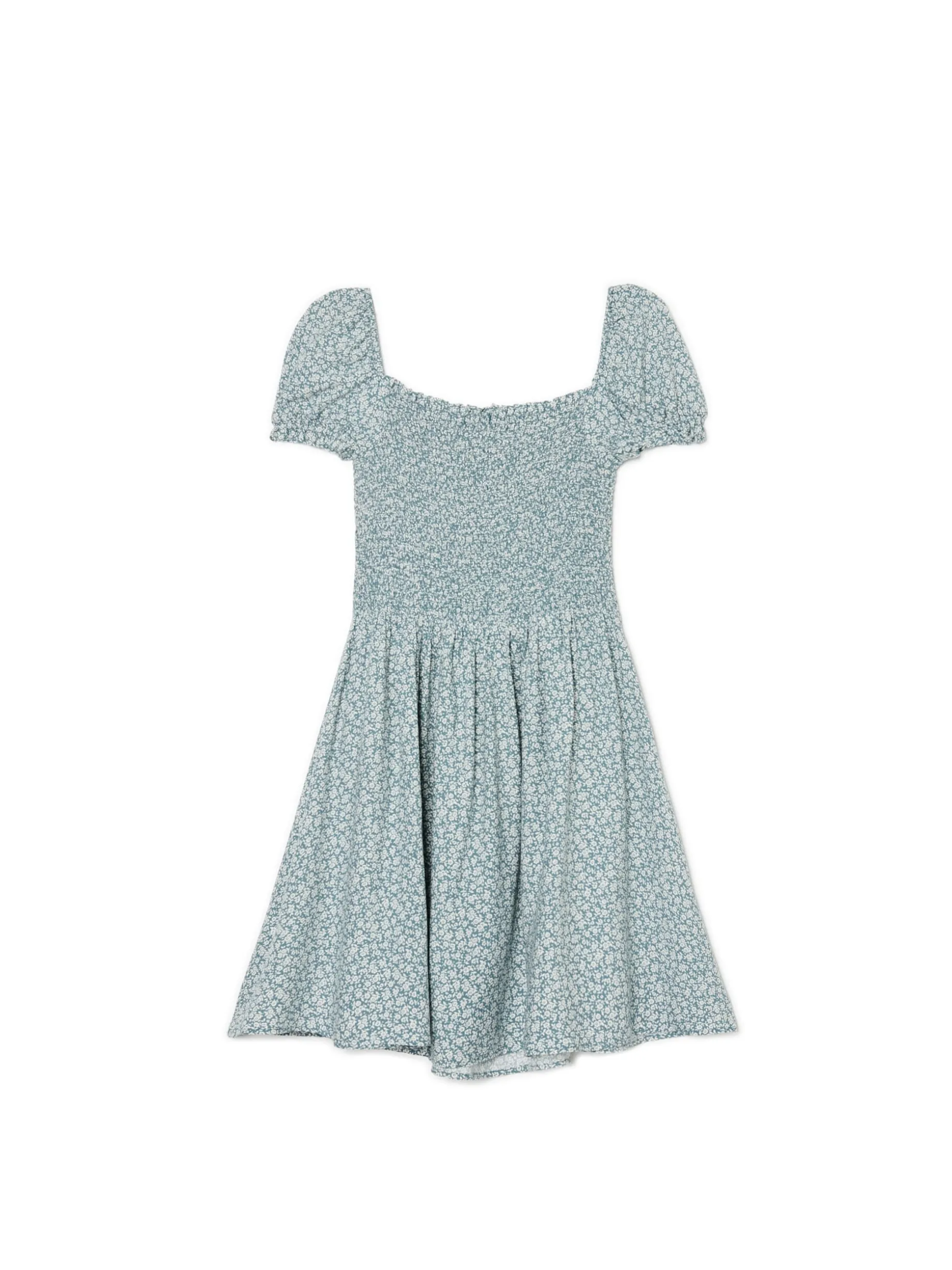 Damska sukienka w stylu coquette uszyta z lekkiego materiału o długości mini i kwiatowym wzorze. Must have letnich wypadów! 100% wiskozy długość mini w stylu coquette krótkie, bufiaste rękawy dopasowana, elastyczna góra odcięta w talii autorski, kwiatowy print na całości