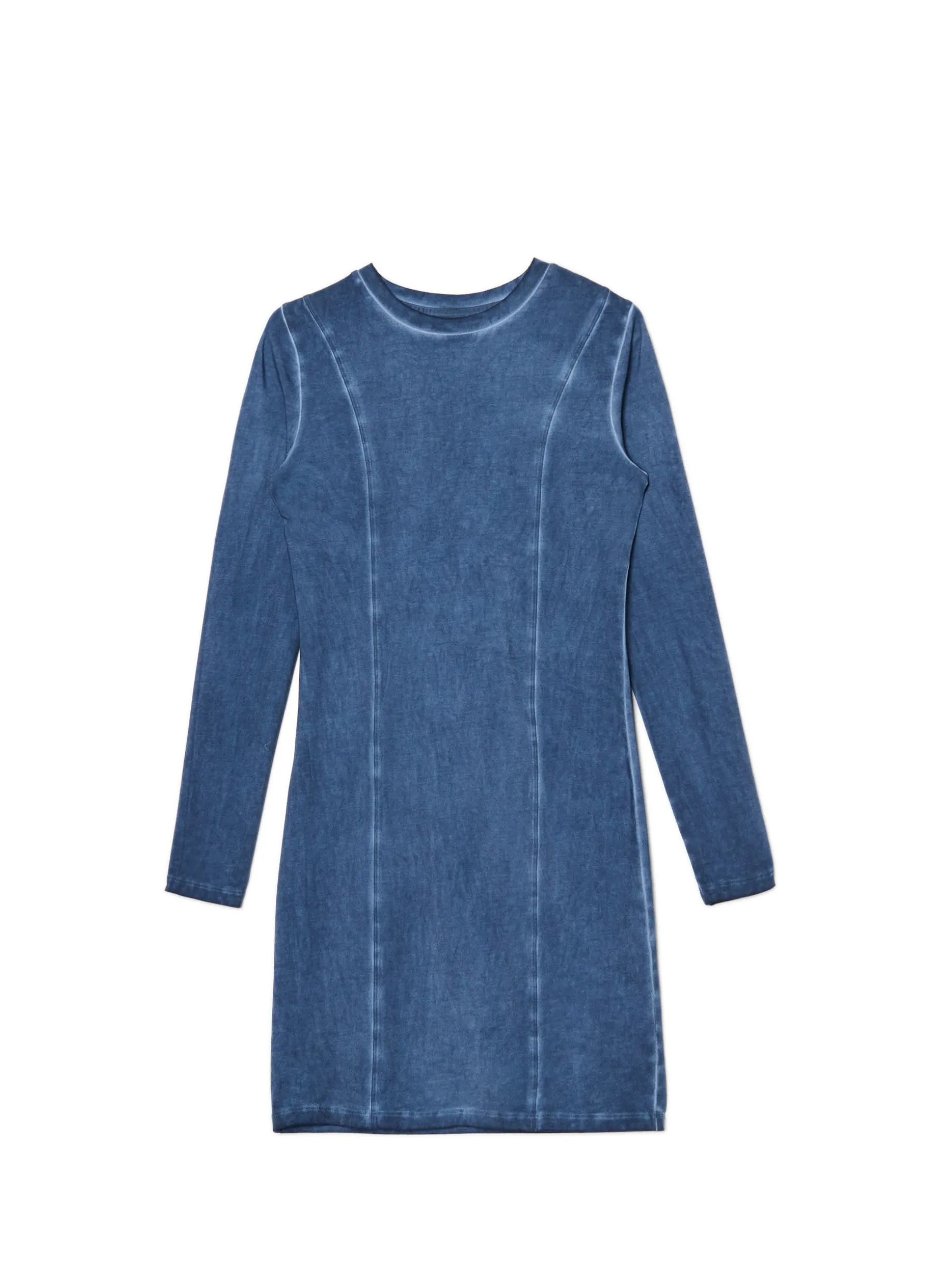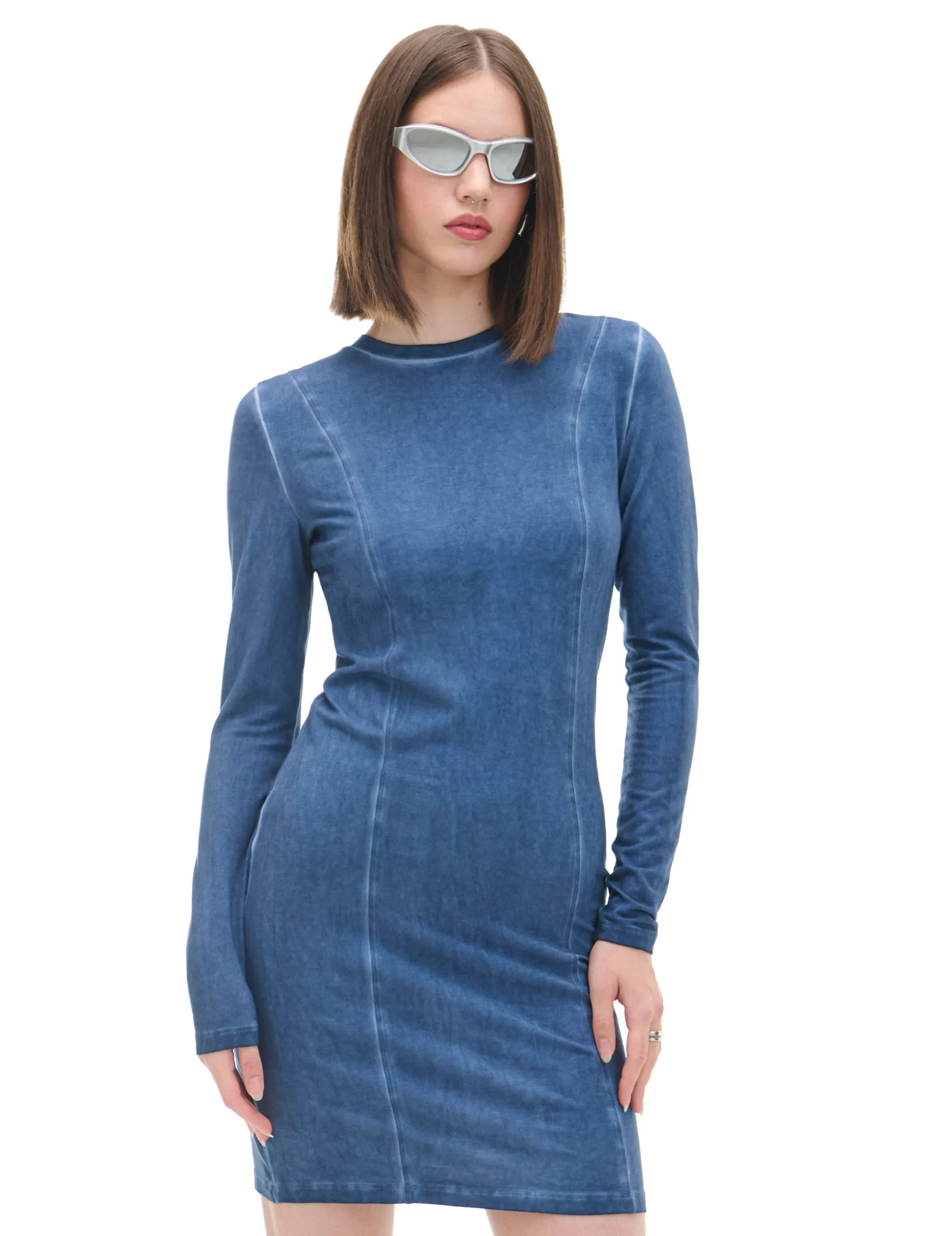 Damska sukienka uszyta z bawełny z domieszką elastycznych włókien w kolorze denimu. Ozdobą tego modelu jest efekt sprania na całości metodą oil wash. bawełna z dodatkiem elastycznych włókien dopasowany krój podkreślający sylwetkę długość mini zabudowany, okrągły dekolt z lamówką długie, dopasowane rękawy ozdobne przeszycia efekt sprania oil wash Wzrost modelki: 172 cm