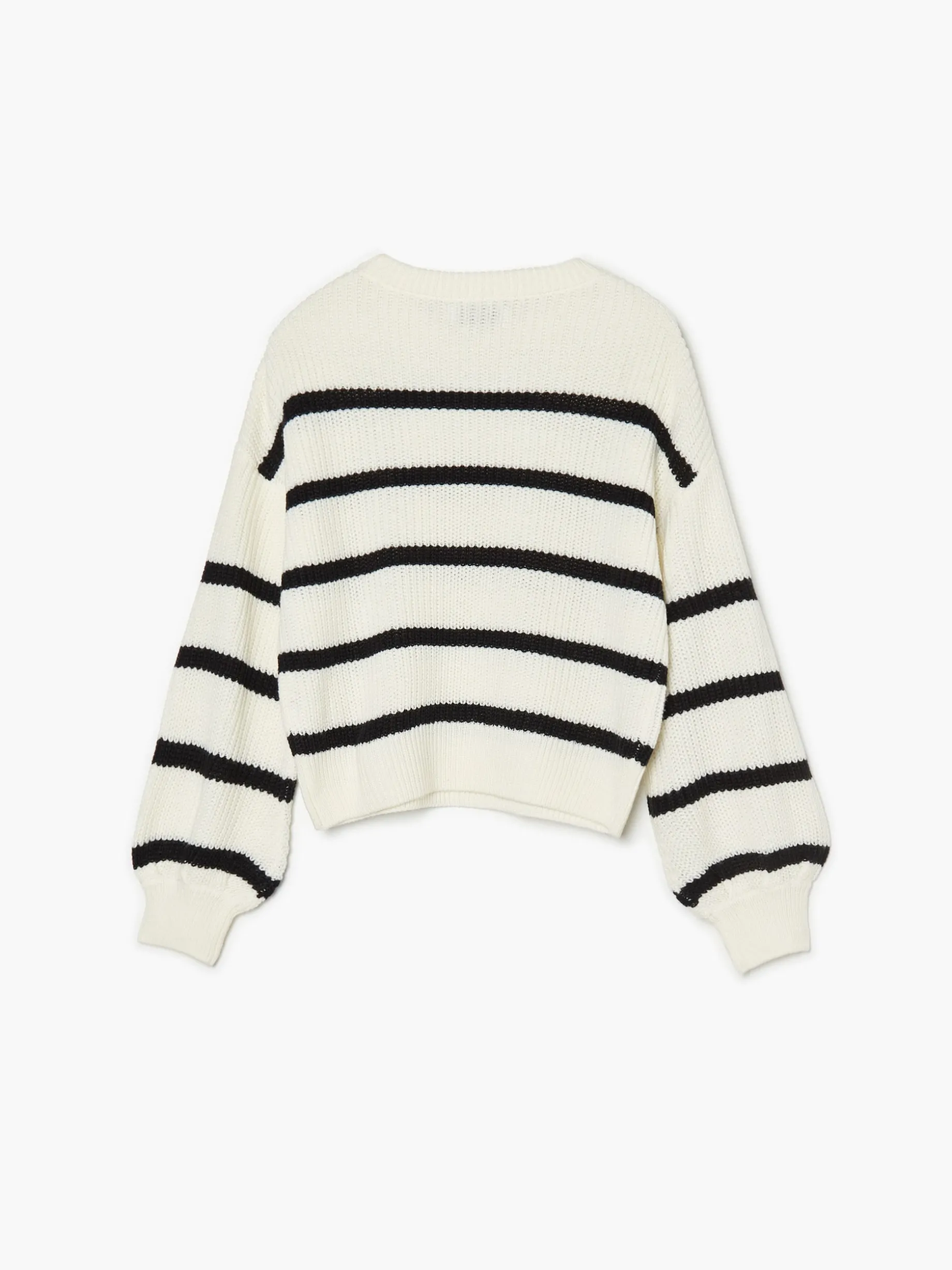 Sweter damski o regularnym kroju, uszyty z dzianiny o drobnym splocie. Szerokie rękawy zakończone ściągaczem, wzór w paski na całości. Dostępne inne warianty kolorystyczne.