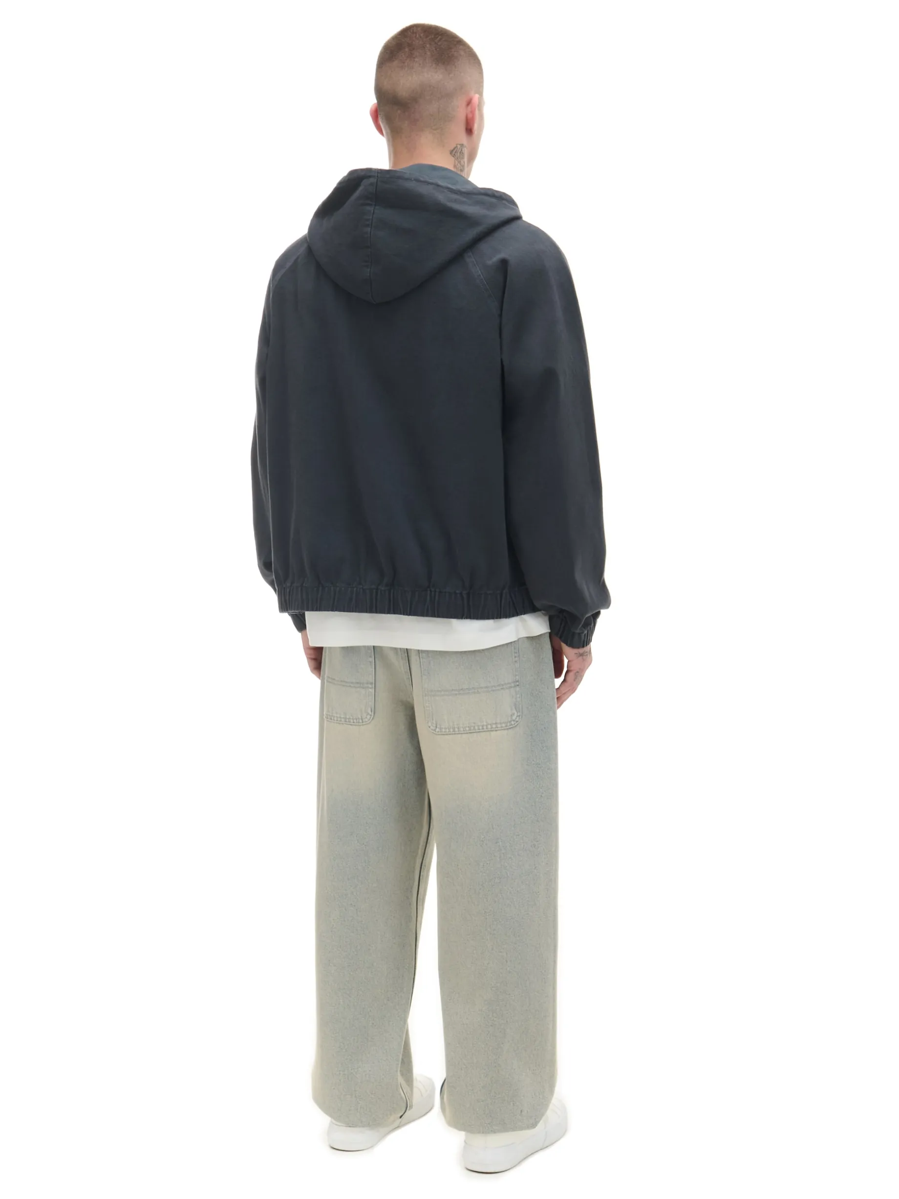 Męska kurtka z kapturem typu katana, uszyta z szarego denimu. Idealna na sezon przejściowy. 100% bawełny regularny krój zapinana na zamek na całej długości szeroki kaptur z trokami dwie kieszenie z przodu dół i mankiety wykończone ściągaczami Model prezentuje produkt w rozmiarze M/L. Wzrost modela: 185 cm