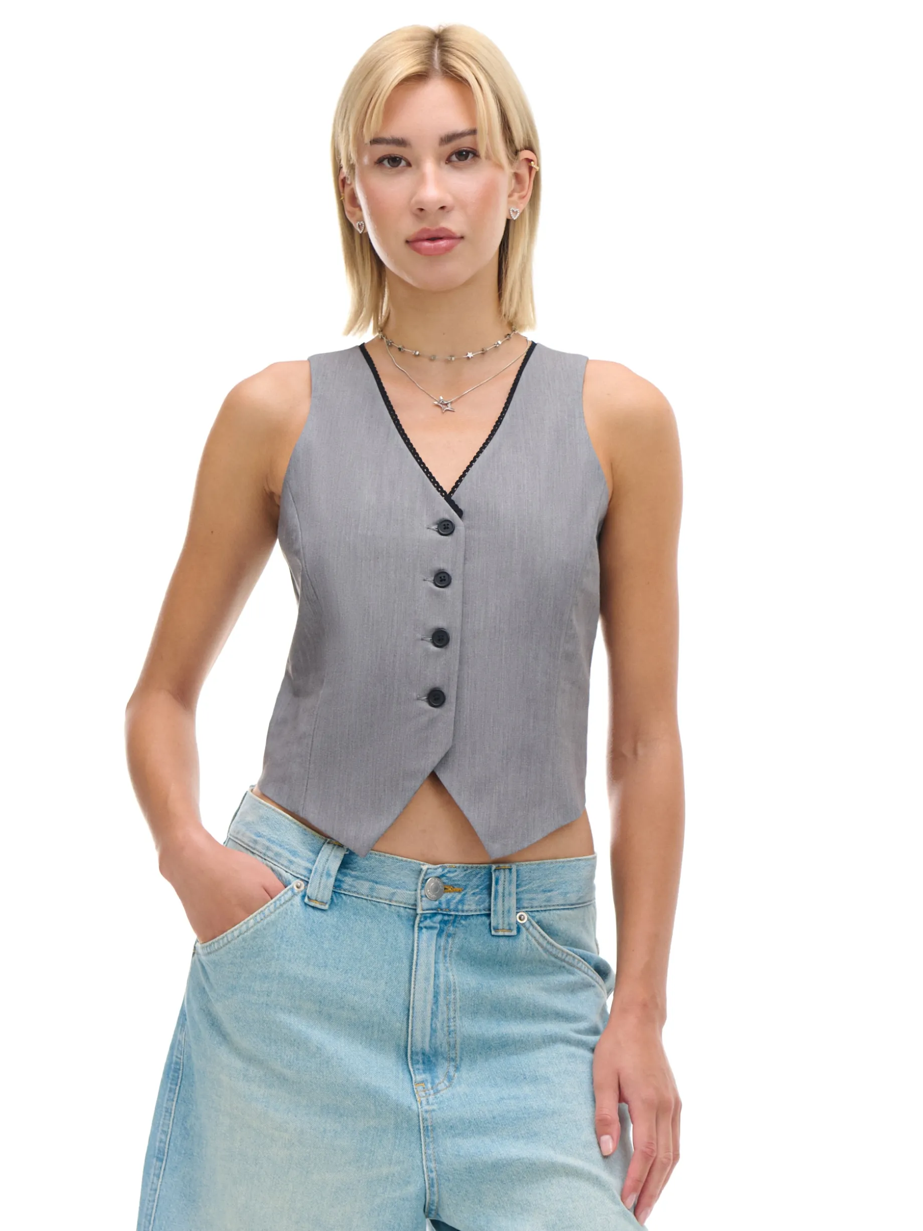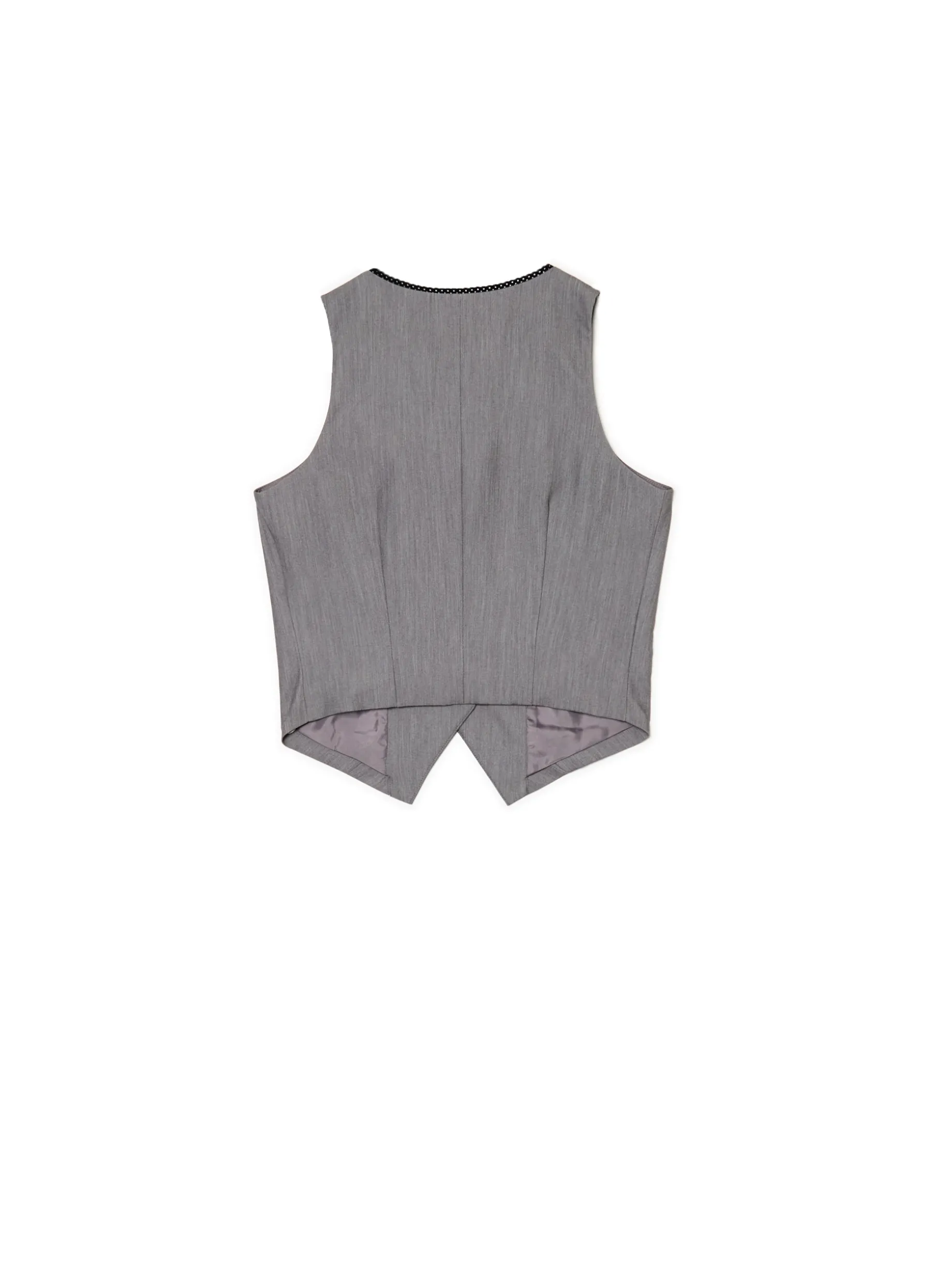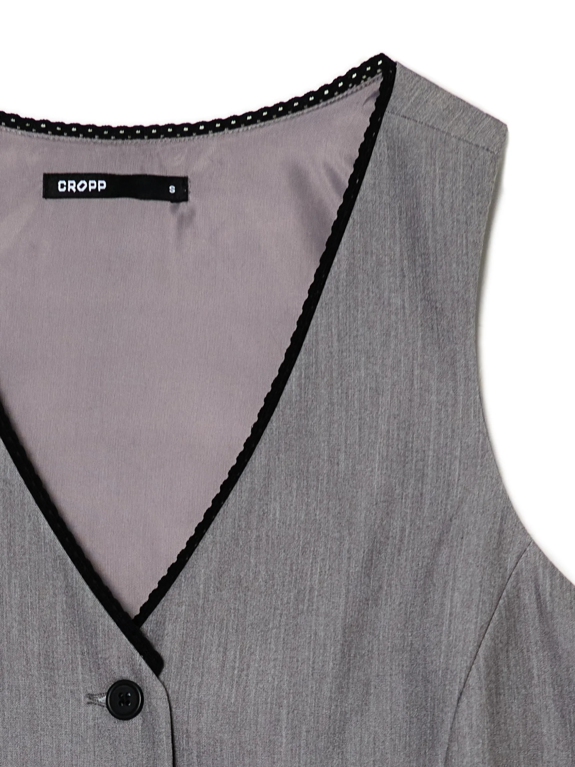 Damska szara kamizelka, uszyta z gładkiej tkaniny zawierajcej wiskozę. krótki krój zapinana na czarne guziki brzegi dekoltu z ozdobnym wykończeniem pionowe przeszycia, modelujące sylwetkę Wzrost modelki: 177 cm